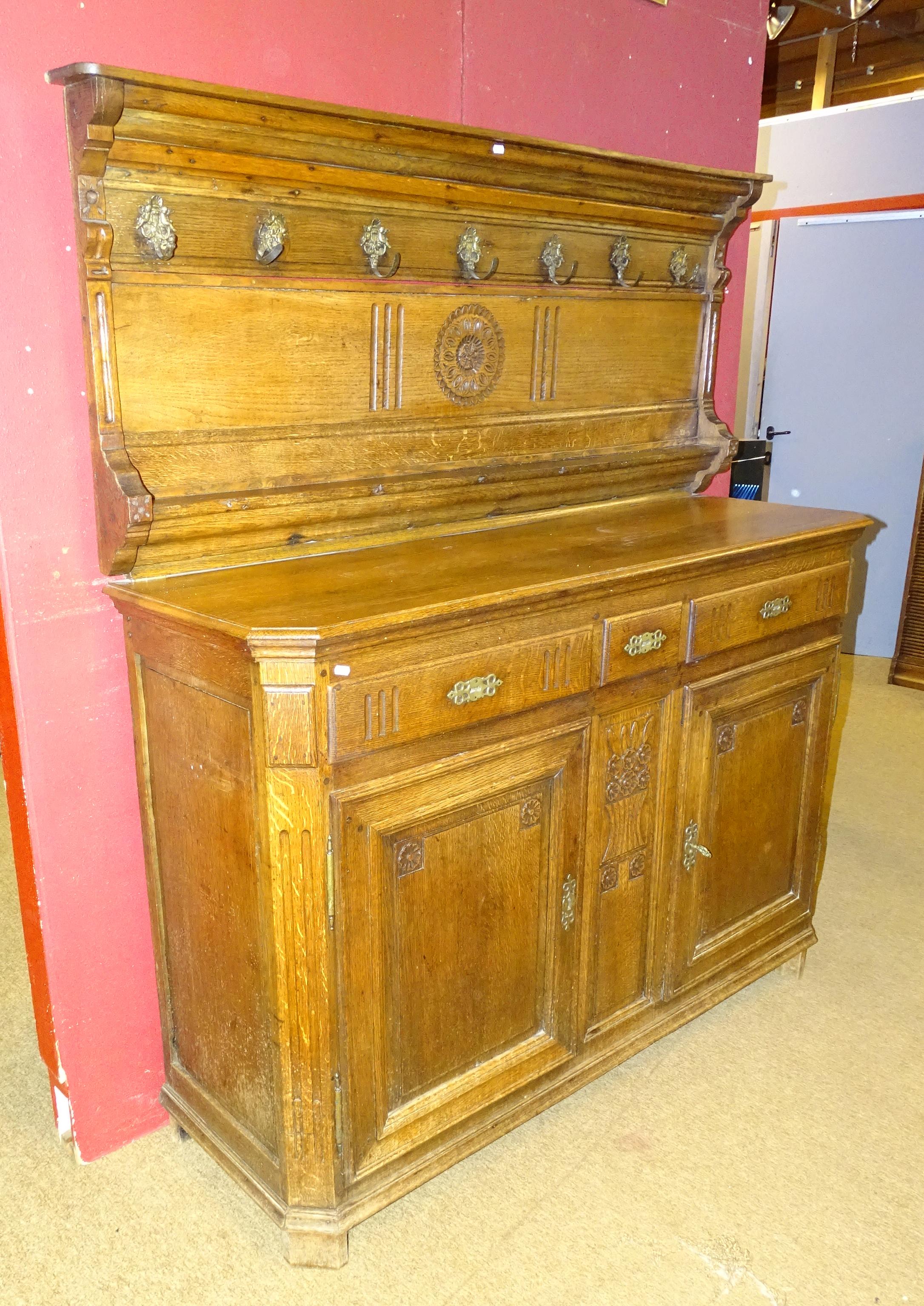 Meuble: Dresse de Charleroi en chêne sculpté fin 18e début 19eS 2 portes dormant fleuri 3 tiroirs 108x154x50cm avec archelle 7 crochets