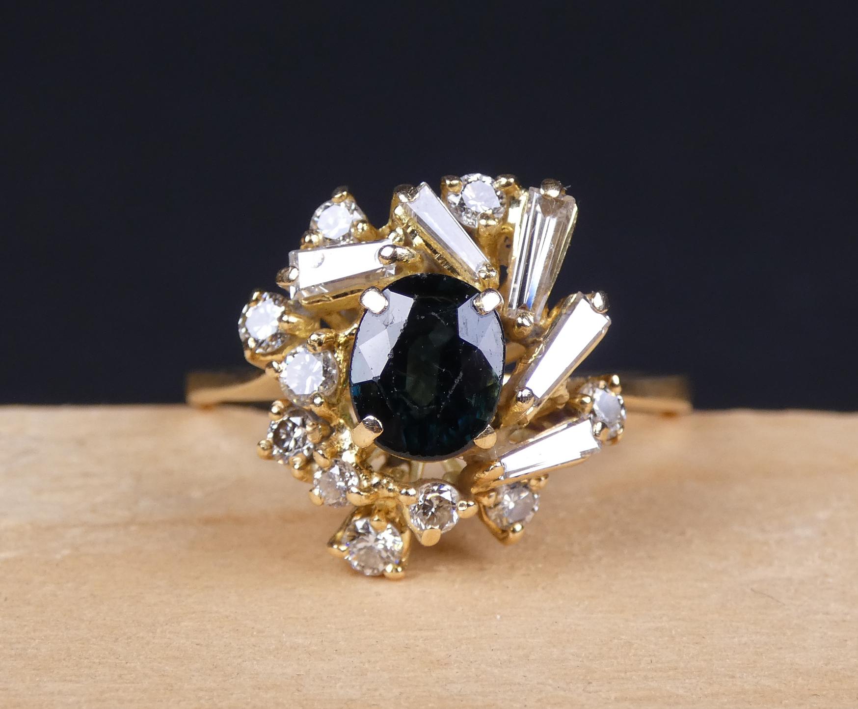 Bijou: Bague en or jaune 18K sertie en son centre d'un saphir d'env. 0,75cts entouré de 10 diamants ronds et 5 baguettes P: 5,7g TDD: 64