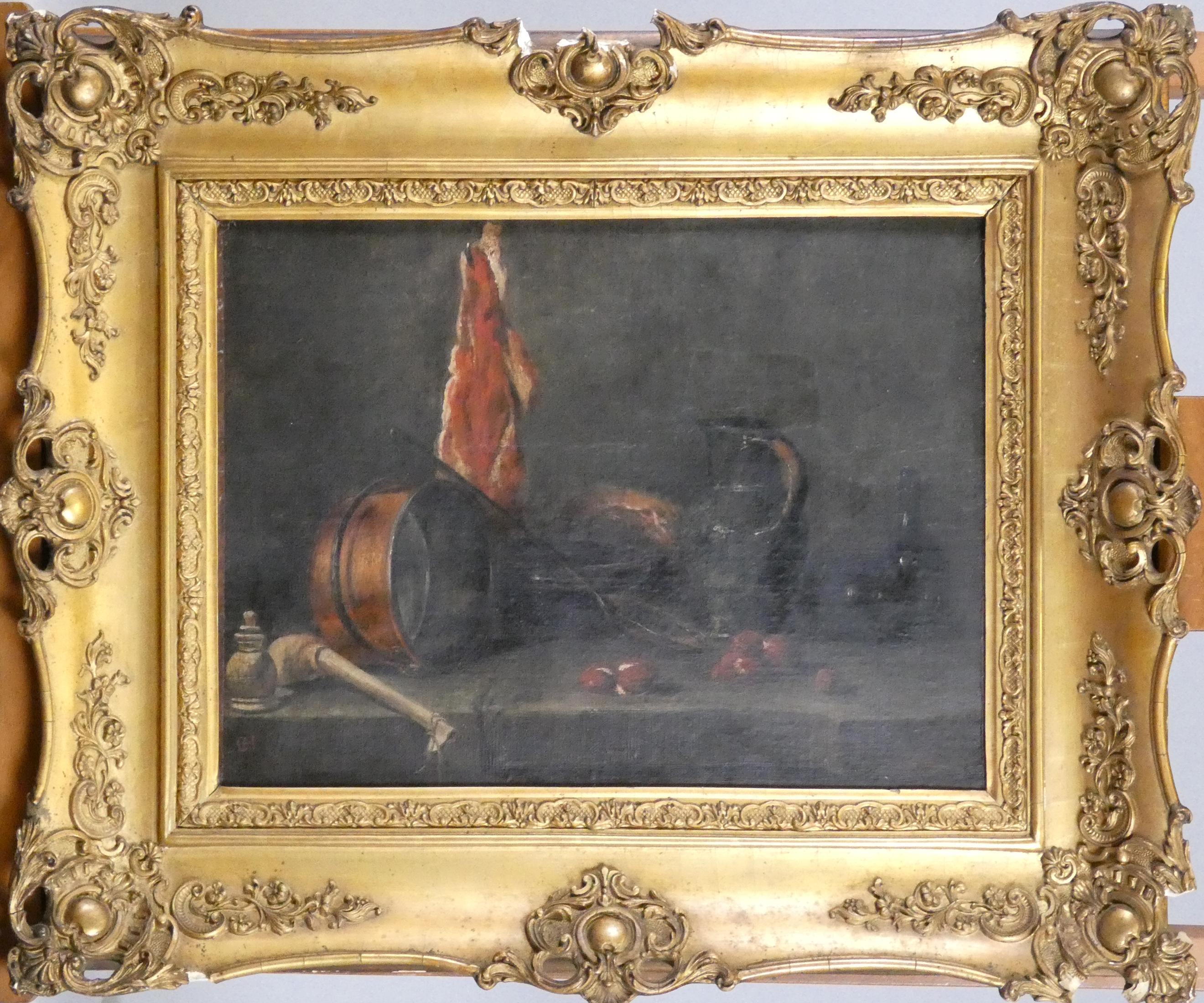 Tableau HST (rest) -nature morte- monog. CH d'après 1 tableau de *CHARDIN J.* (Jean Siméon) (1699, 1799) 1ere moitié 19eS 32x40,5cm cadre de style doré (ecl)
