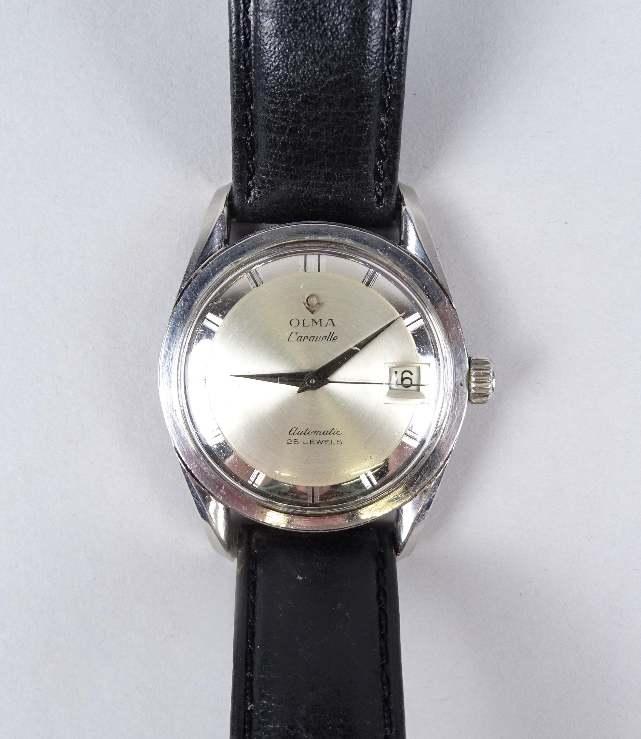 Bijou: Montre bracelet d'homme OLMA CARAVELLE boitier en acier mvt automatic 25 jewels (En état) D:35mm avec dateur bracelet cuir