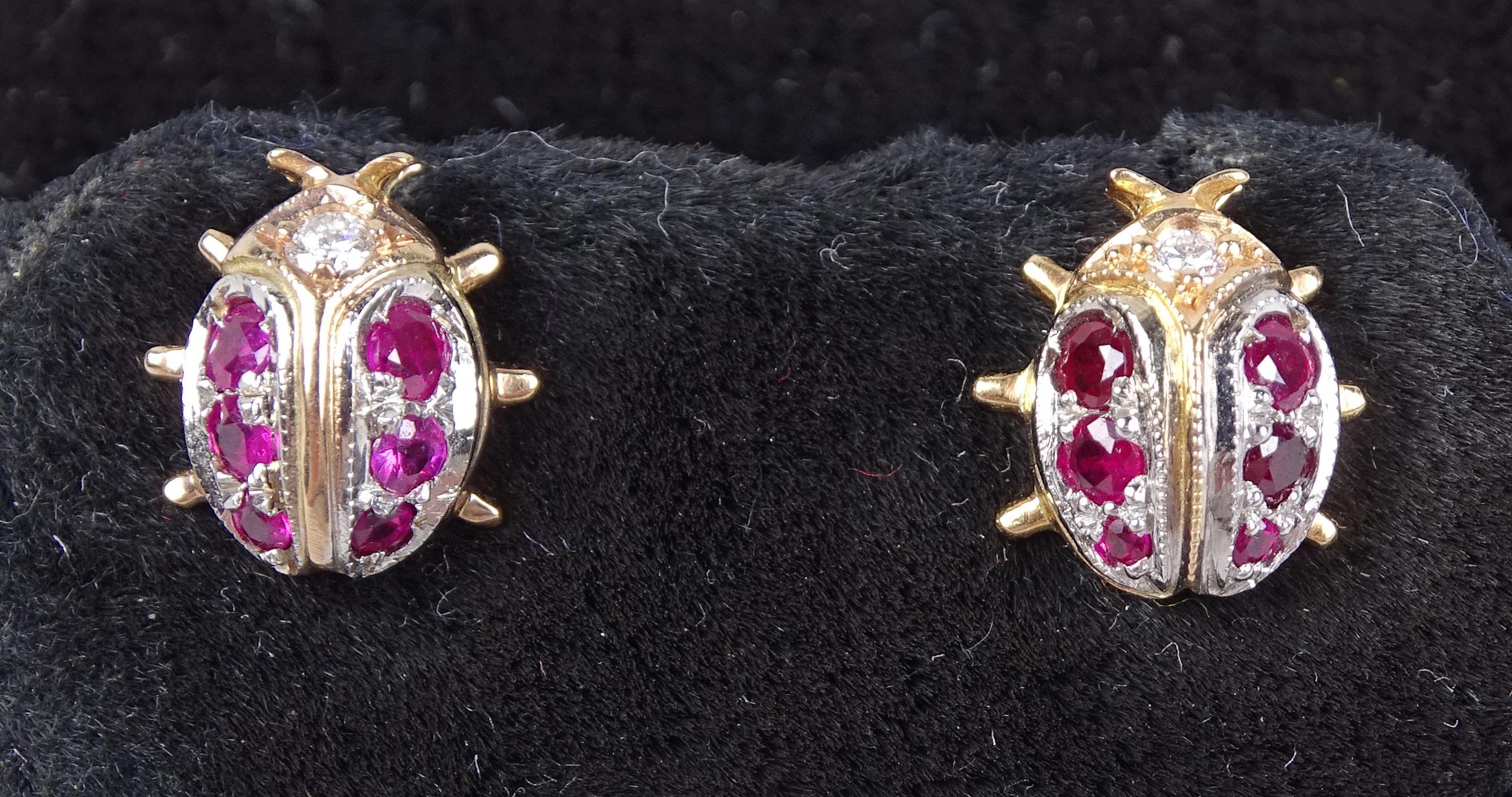 Bijou: Paire de boucles d'oreilles -Coccinelles- en or jaune et blanc 18K serties de rubis pour env. 0,64cts et de diamants pour env. 0,06cts P: 3,6gr