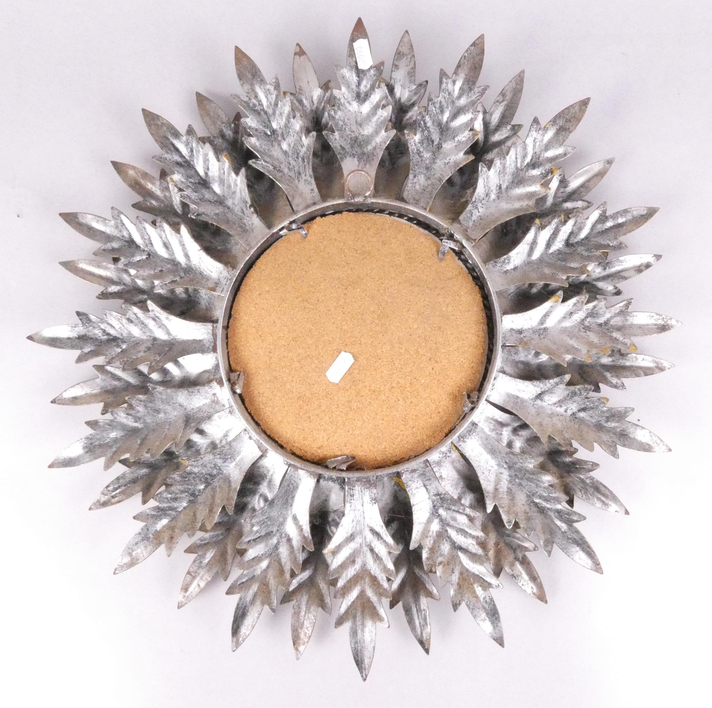 Meuble: Miroir dit soleil rond en métal argenté patiné dans un entourage de feuilles Diam:53cm
