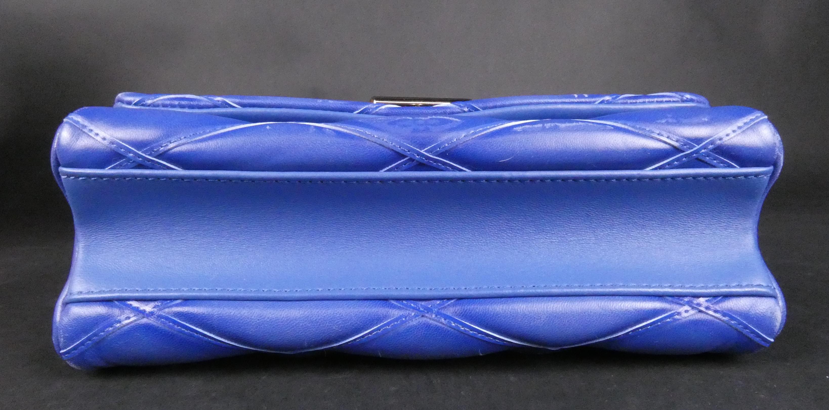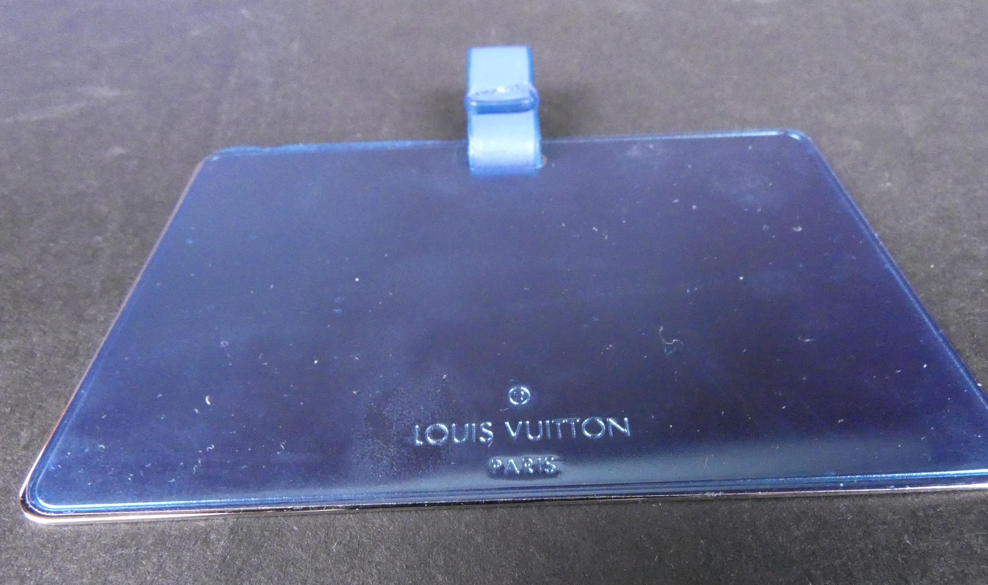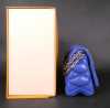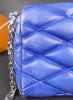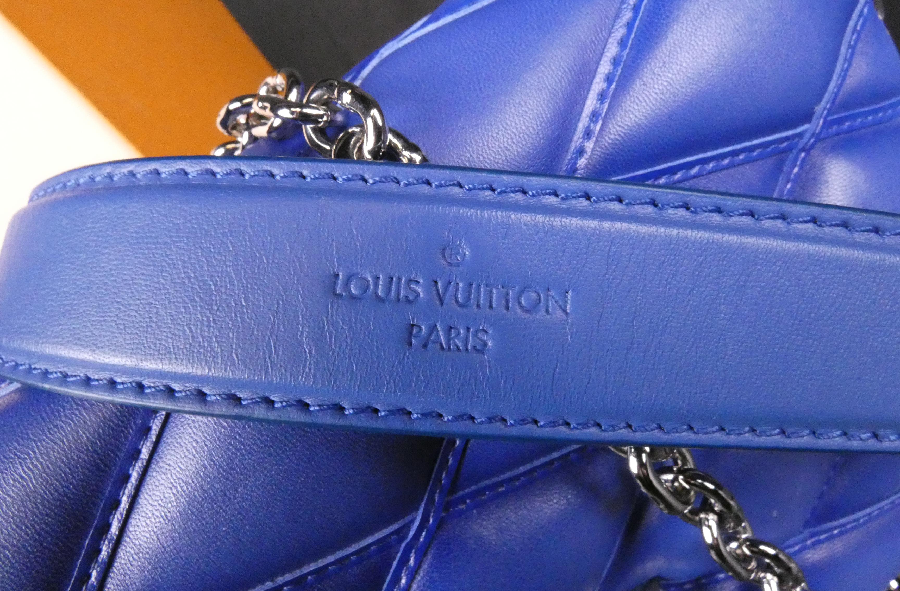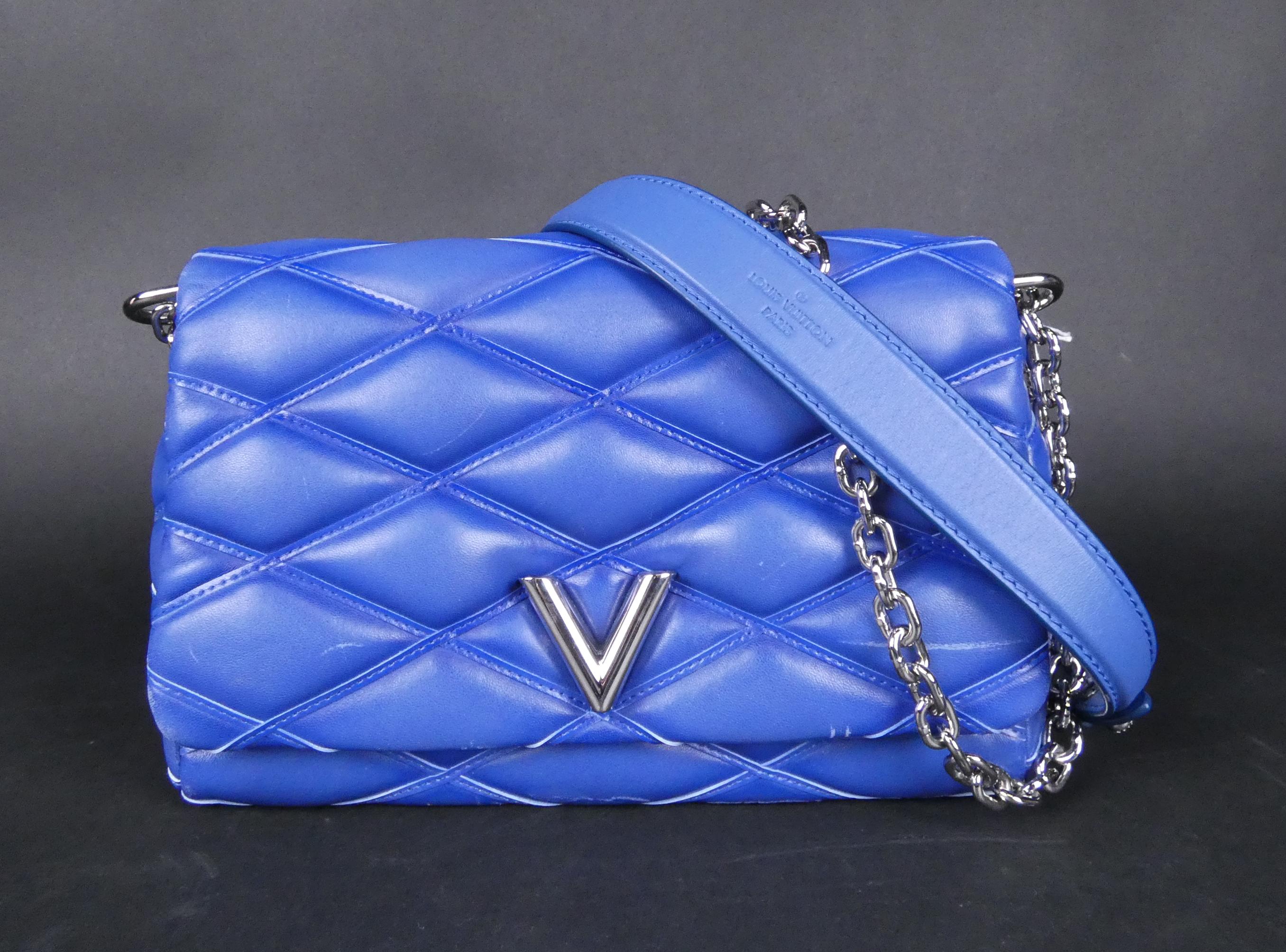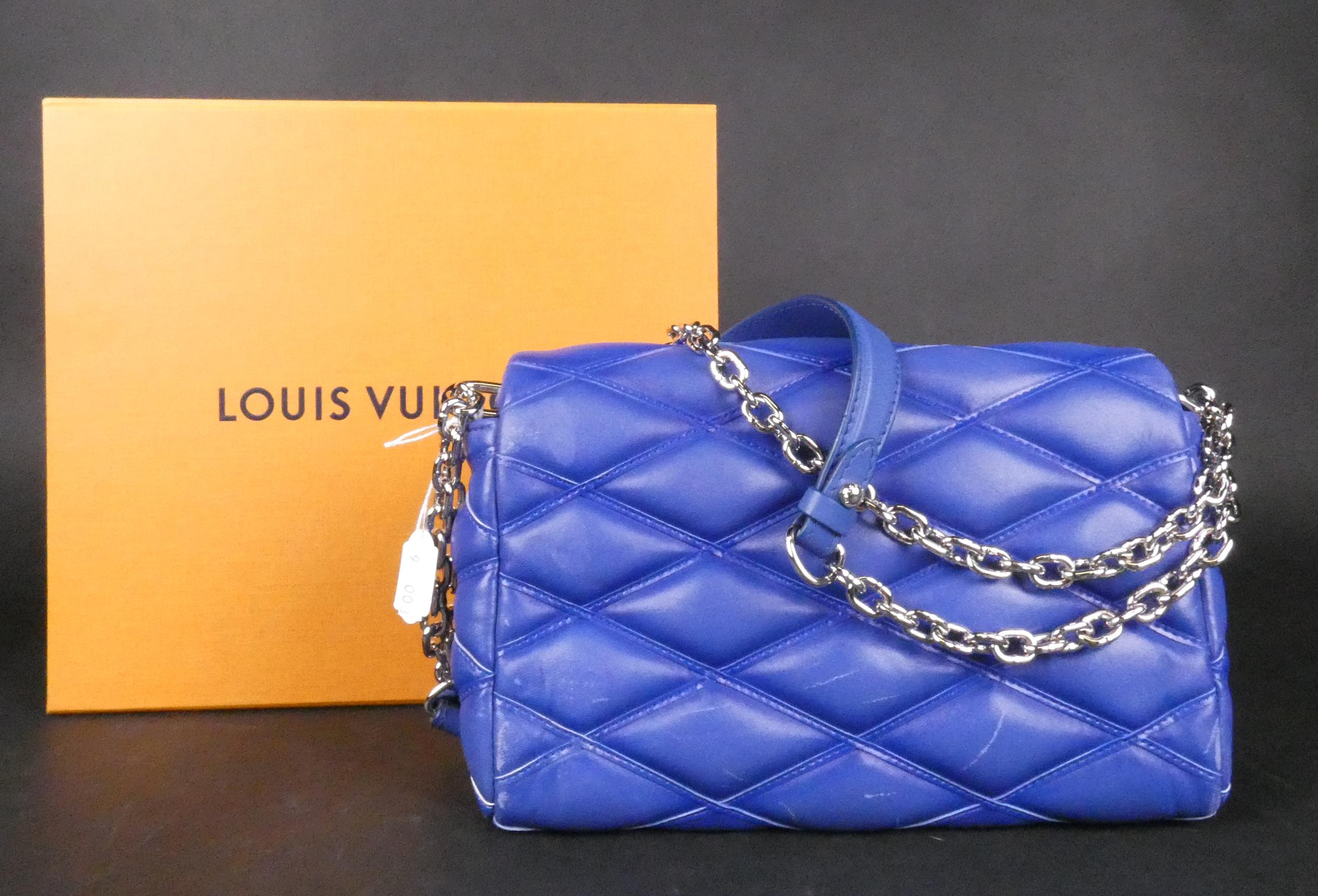Mode: Sac Louis Vuitton en cuir bleu denim (traces d'us, bel état gen) modèle -GO-14- à bandoulière lanière à accastillage argenté petit miroir n°série F04175 17x25x10 (bte)