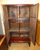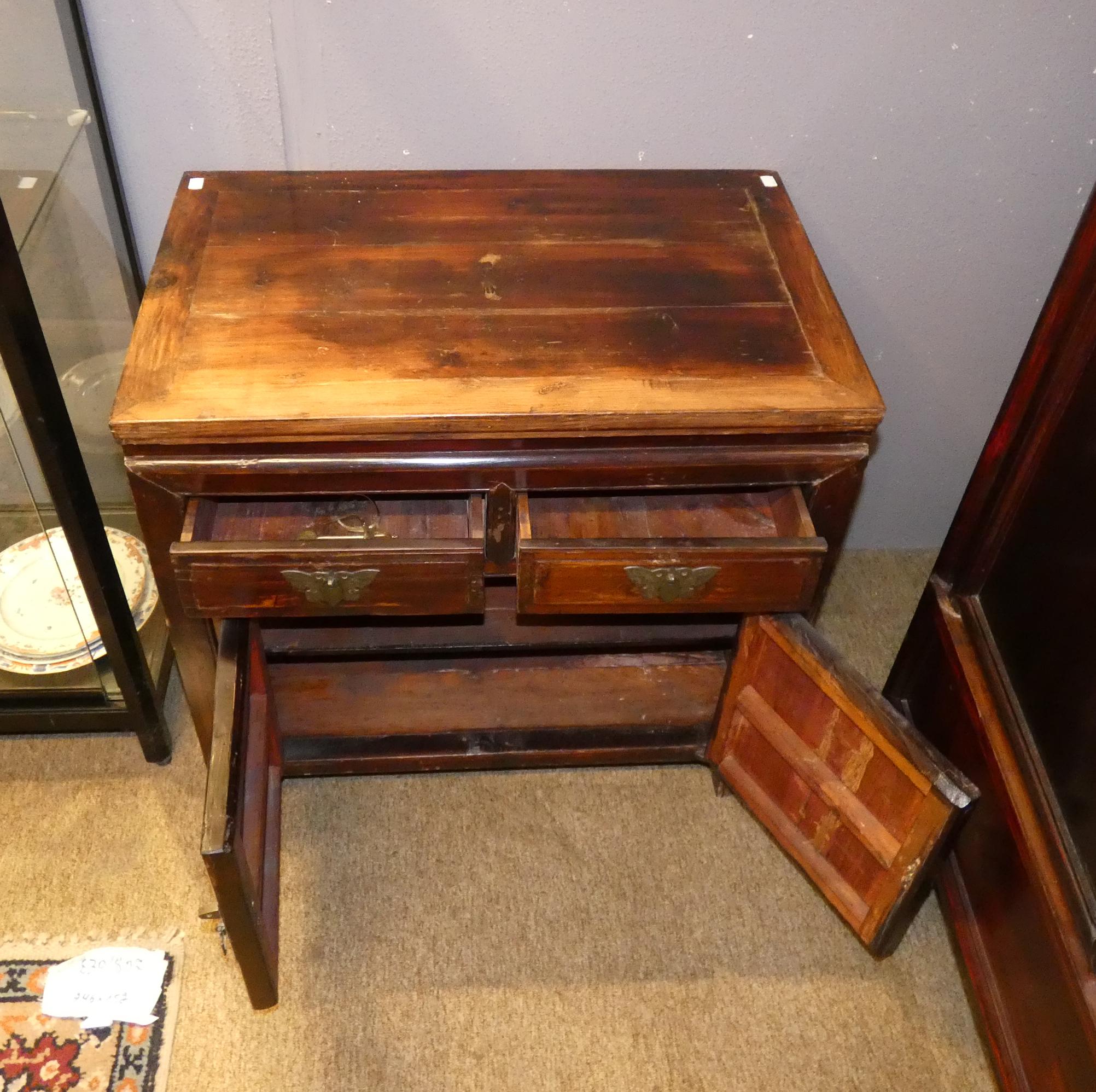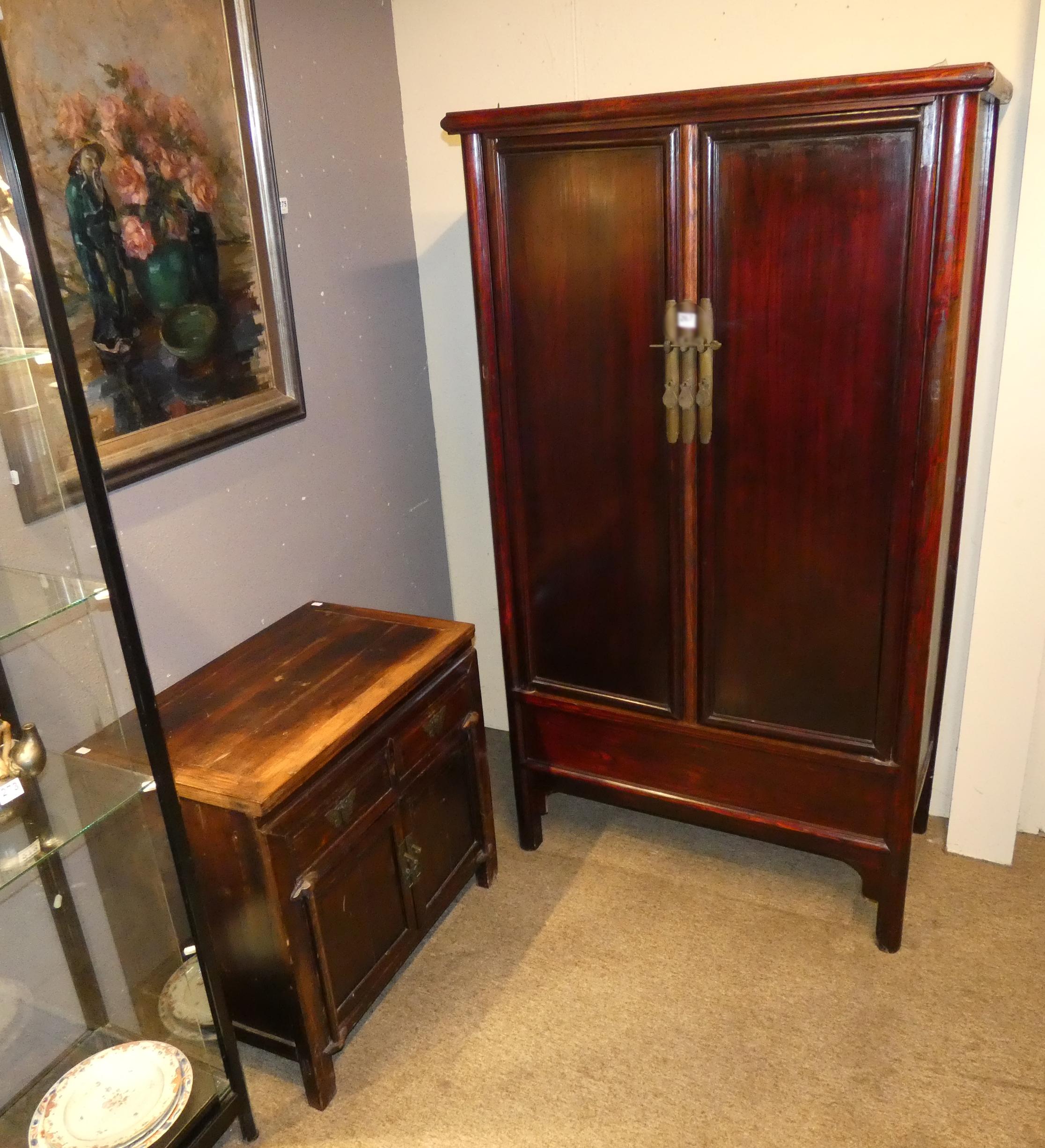 Asiatique: bois laqué CHINE: Armoire de mariage (Rest, pt chocs, pt rayures) 2P int 3 étagères (mq) 2 tiroirs 184x104x57cm + meuble (usure, rayures) 2P 2T 74x77x50cm