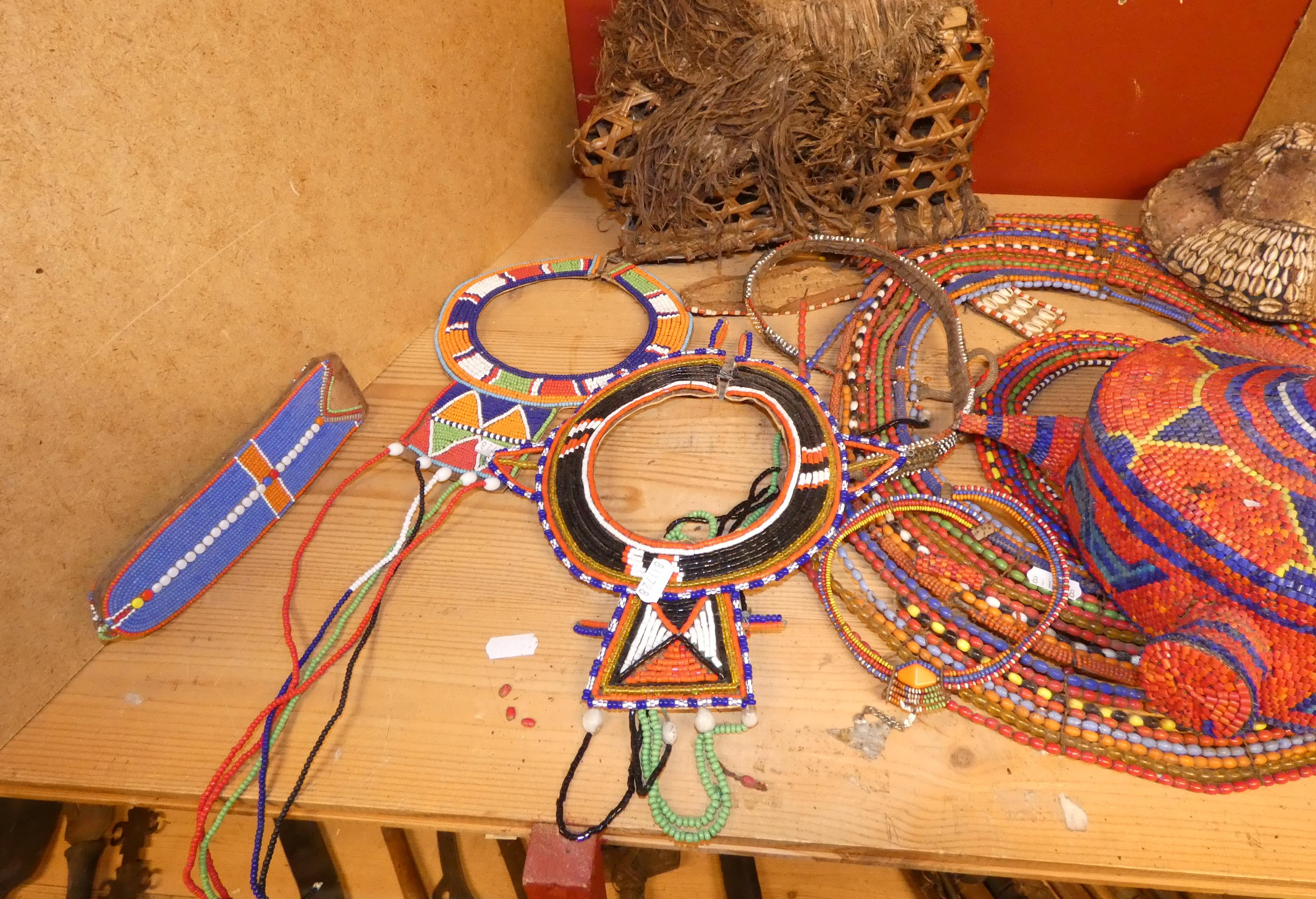 Africain : Lot ethnographique divers dont : colliers , ceintures et boucles d'oreilles Massaï , coiffe d'initiation.