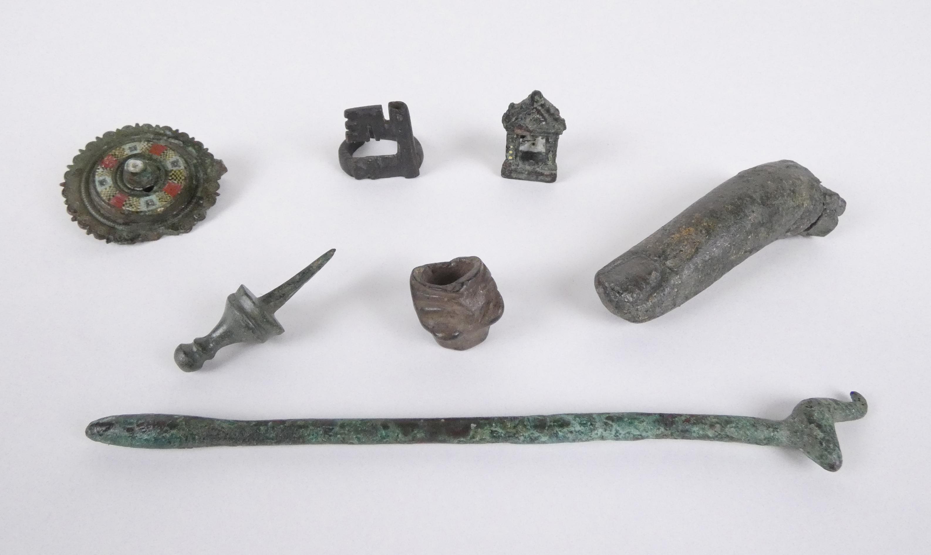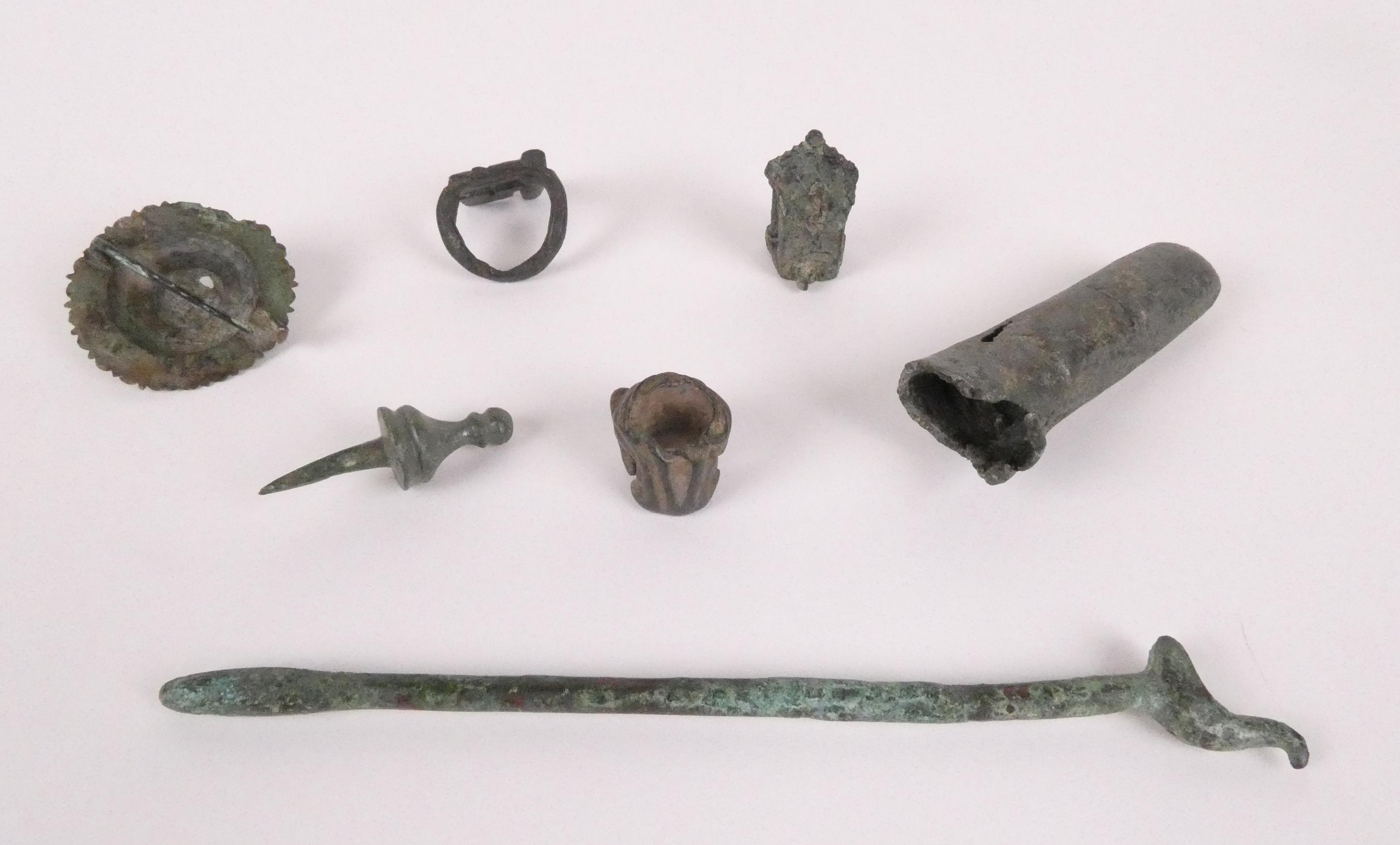 Objet: Objets de fouille en bronze, probable période Mérovingienne (7pcs) dont: des fibules, 1 bague, 1 doigt 2x8x2,5cm détaché d'une sculpture importante.