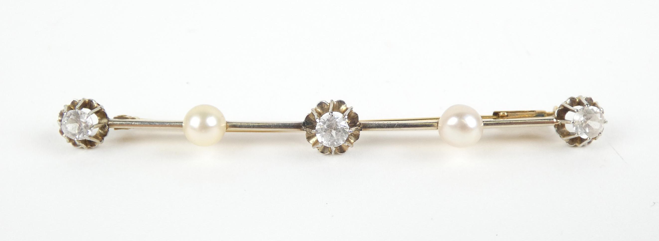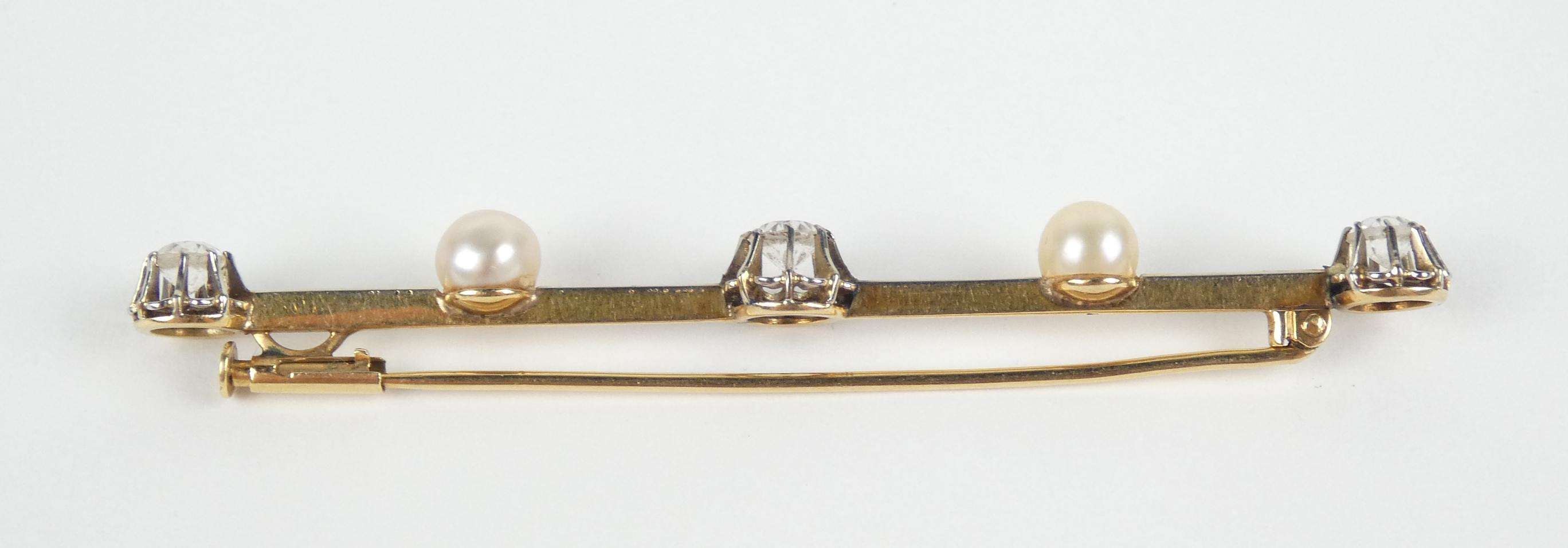 Bijou: Broche barrette en or jaune 18K sertie de pierres incolores et de perles de culture P: 4,3g L: 7cm