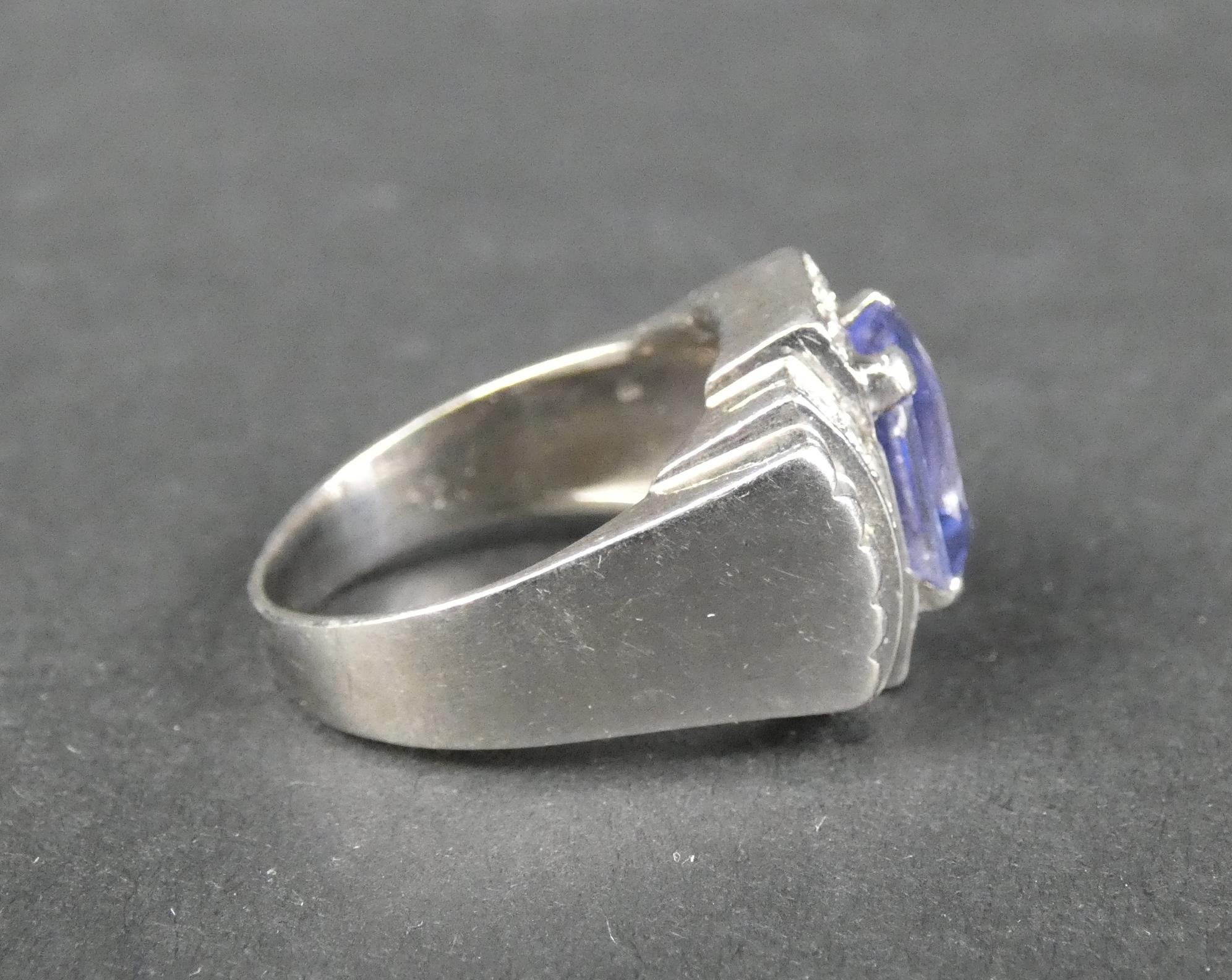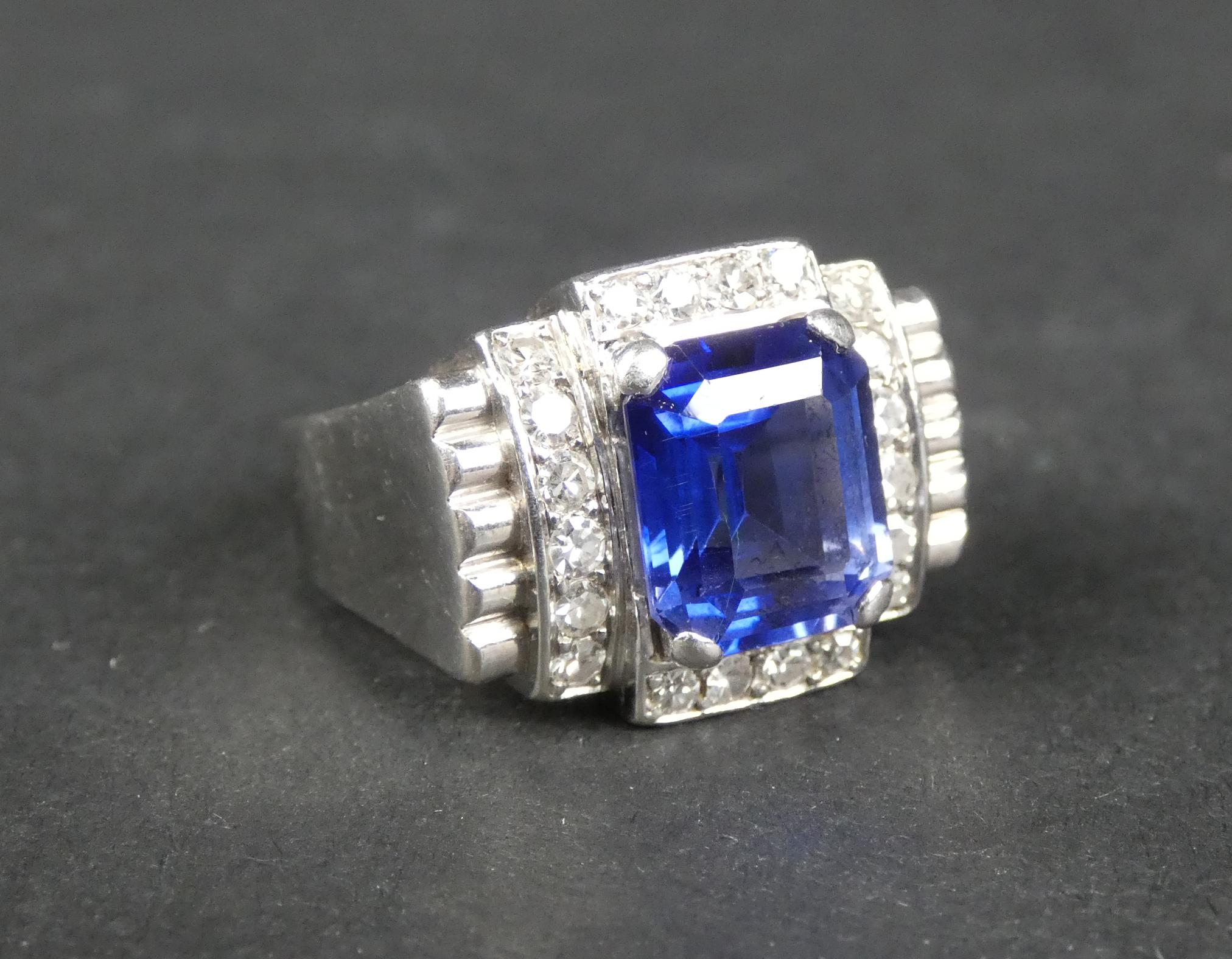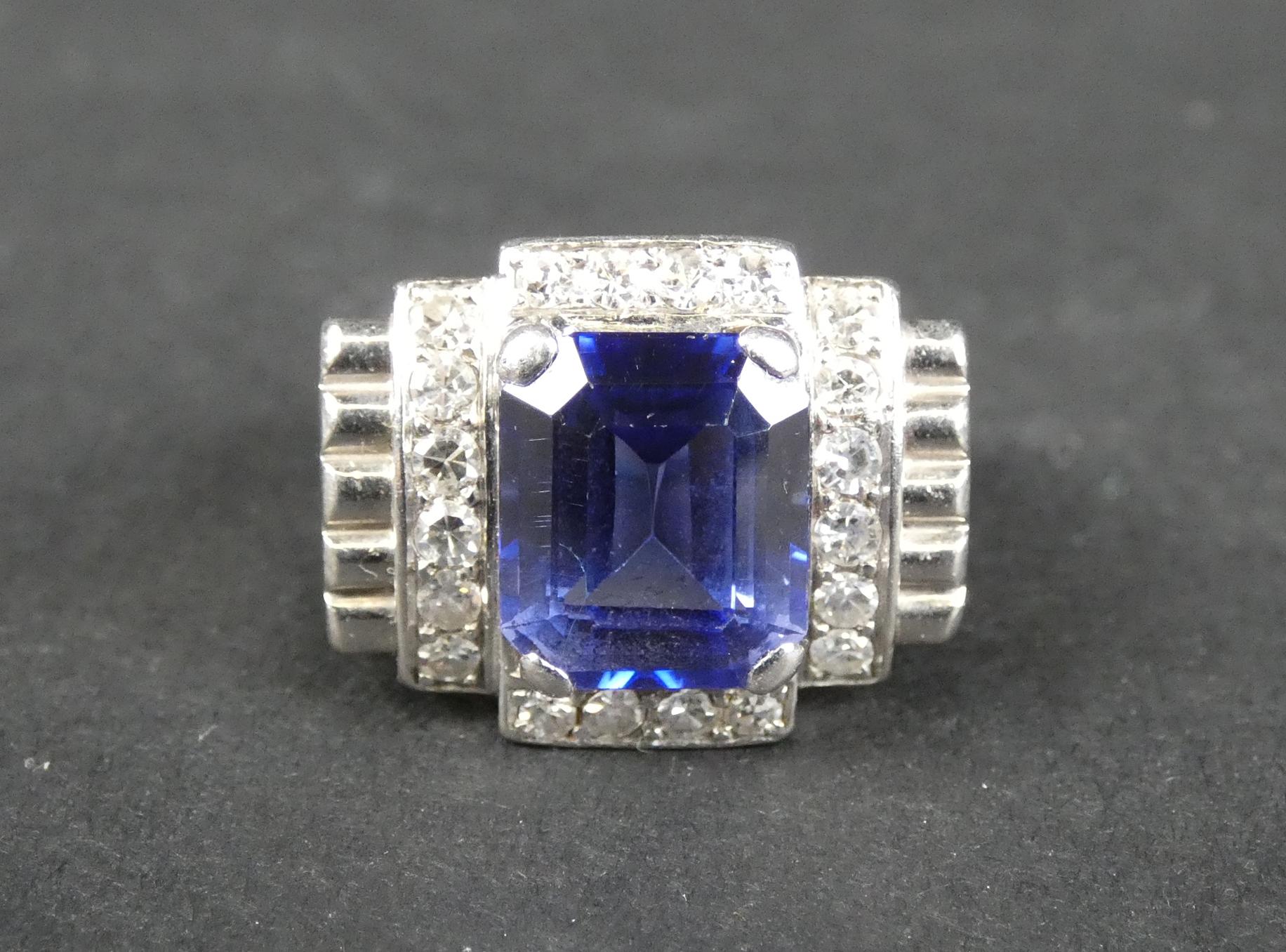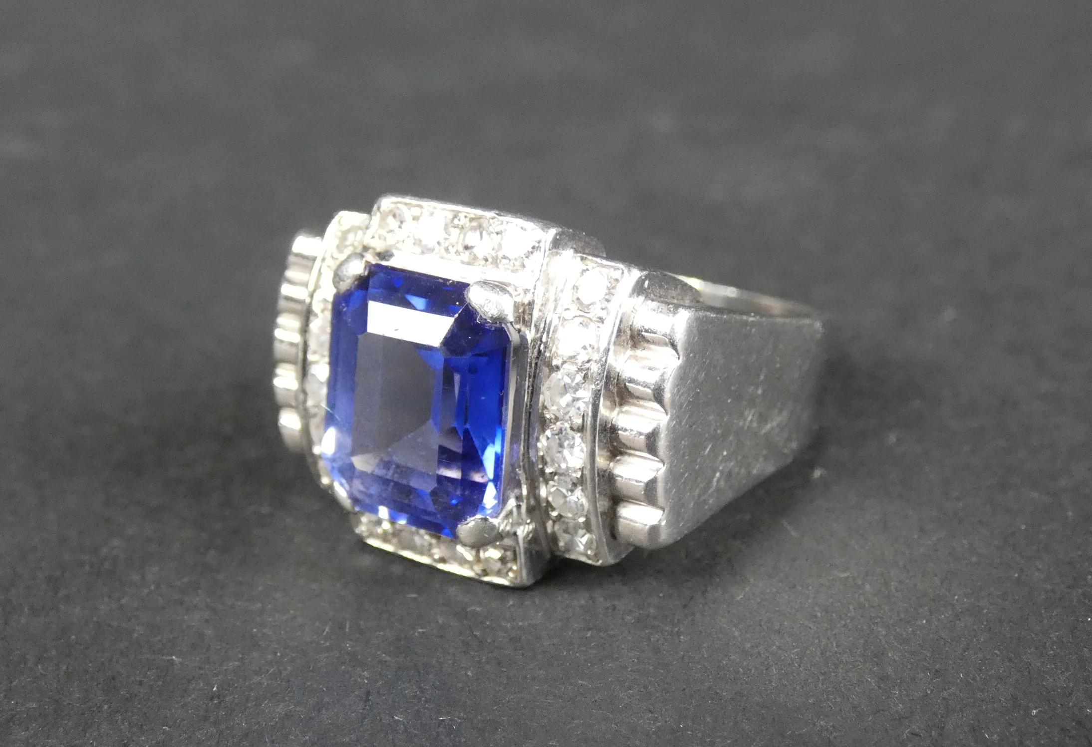 Bijou: Bague ART DECO en platine sertie en son centre d'un saphir probablement synthétique entouré de diamants P: 11,2g TDD: 57