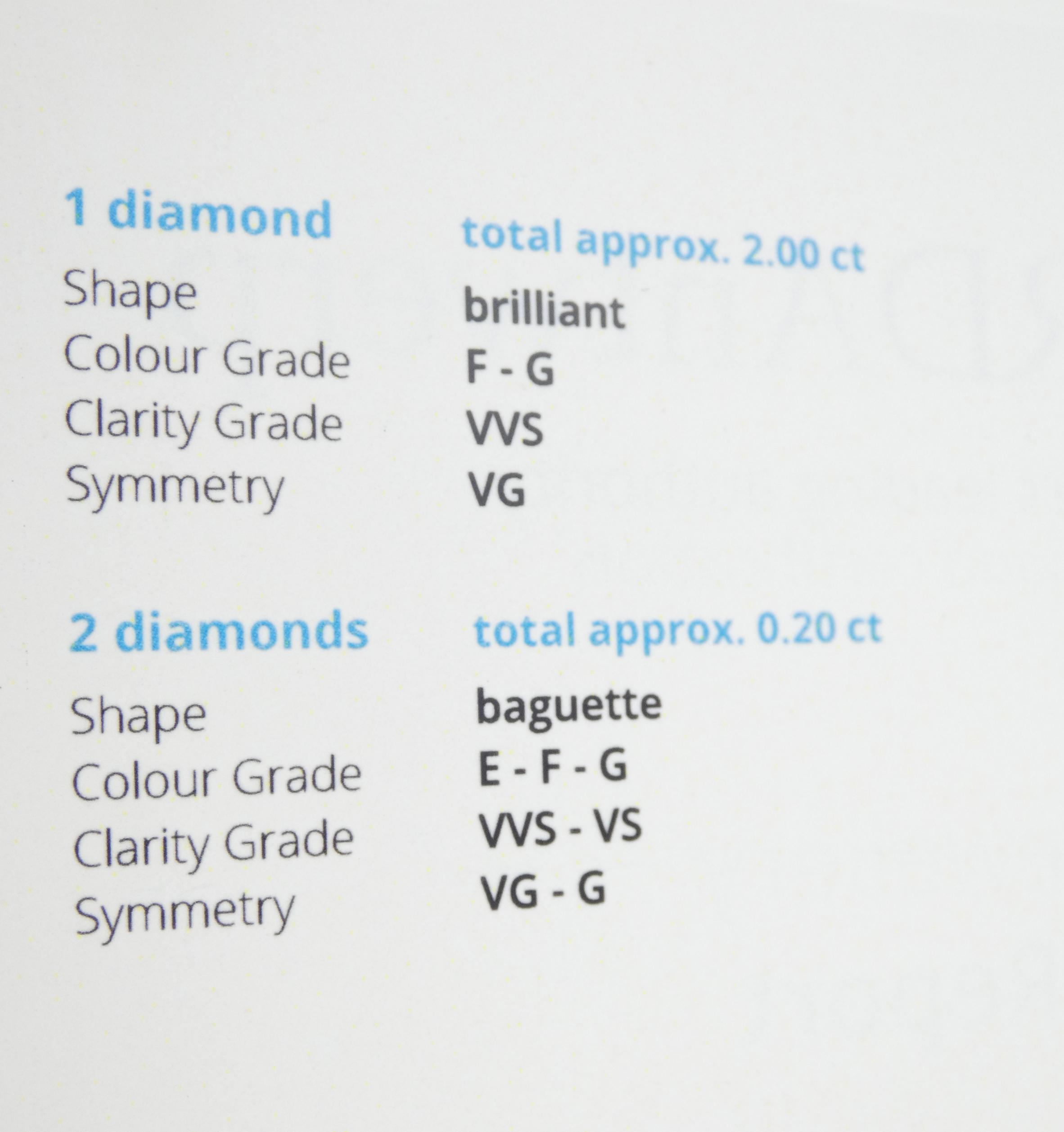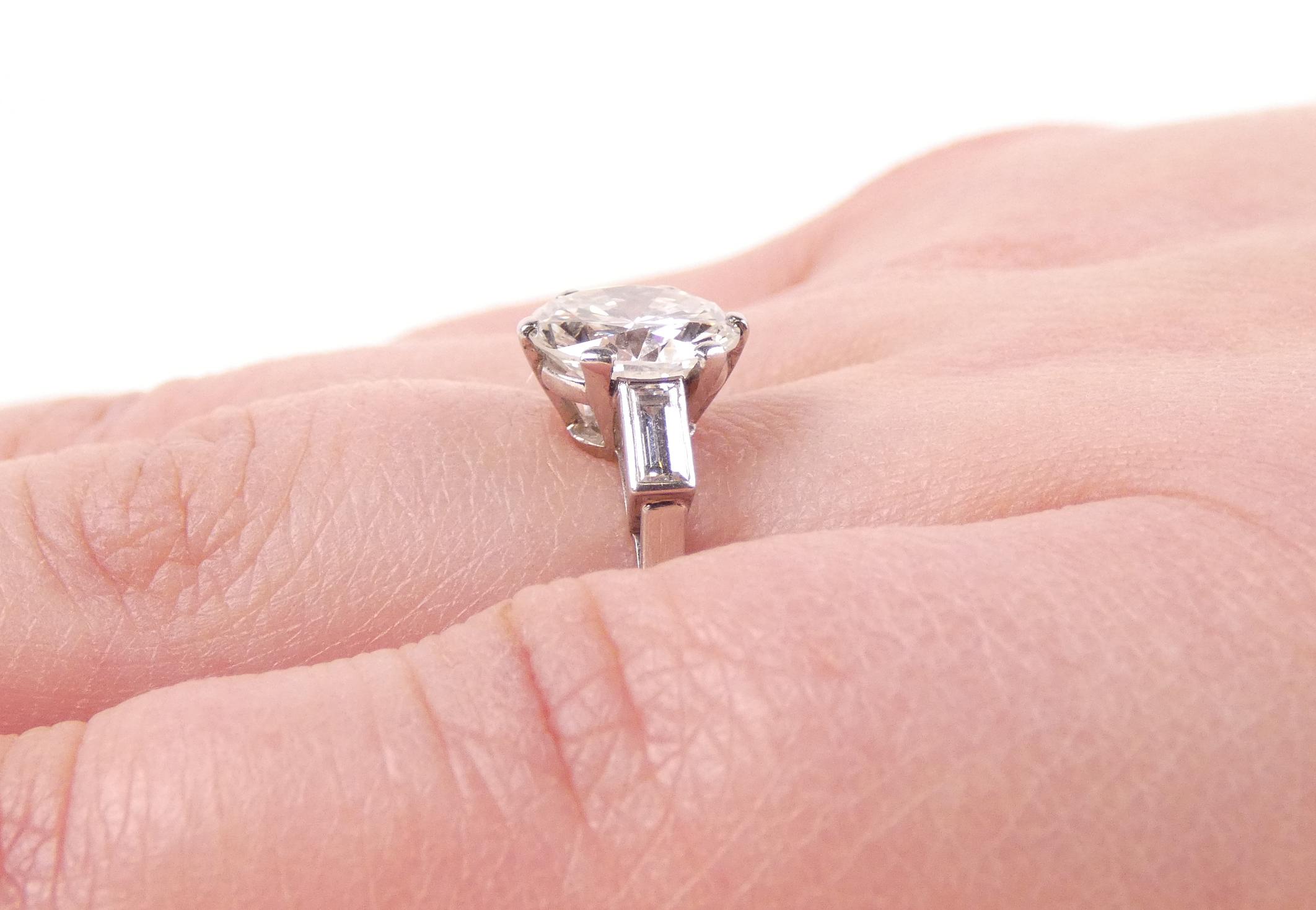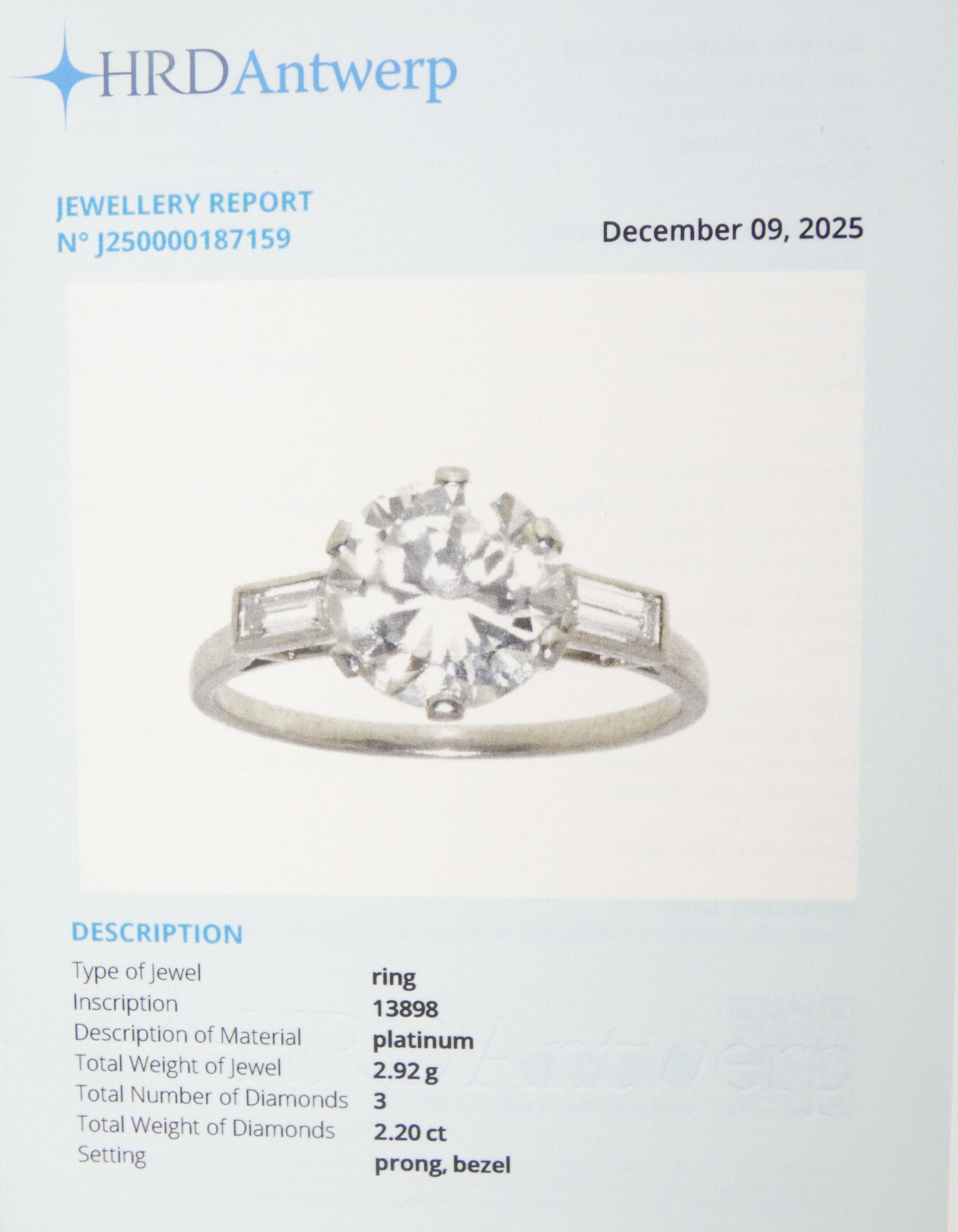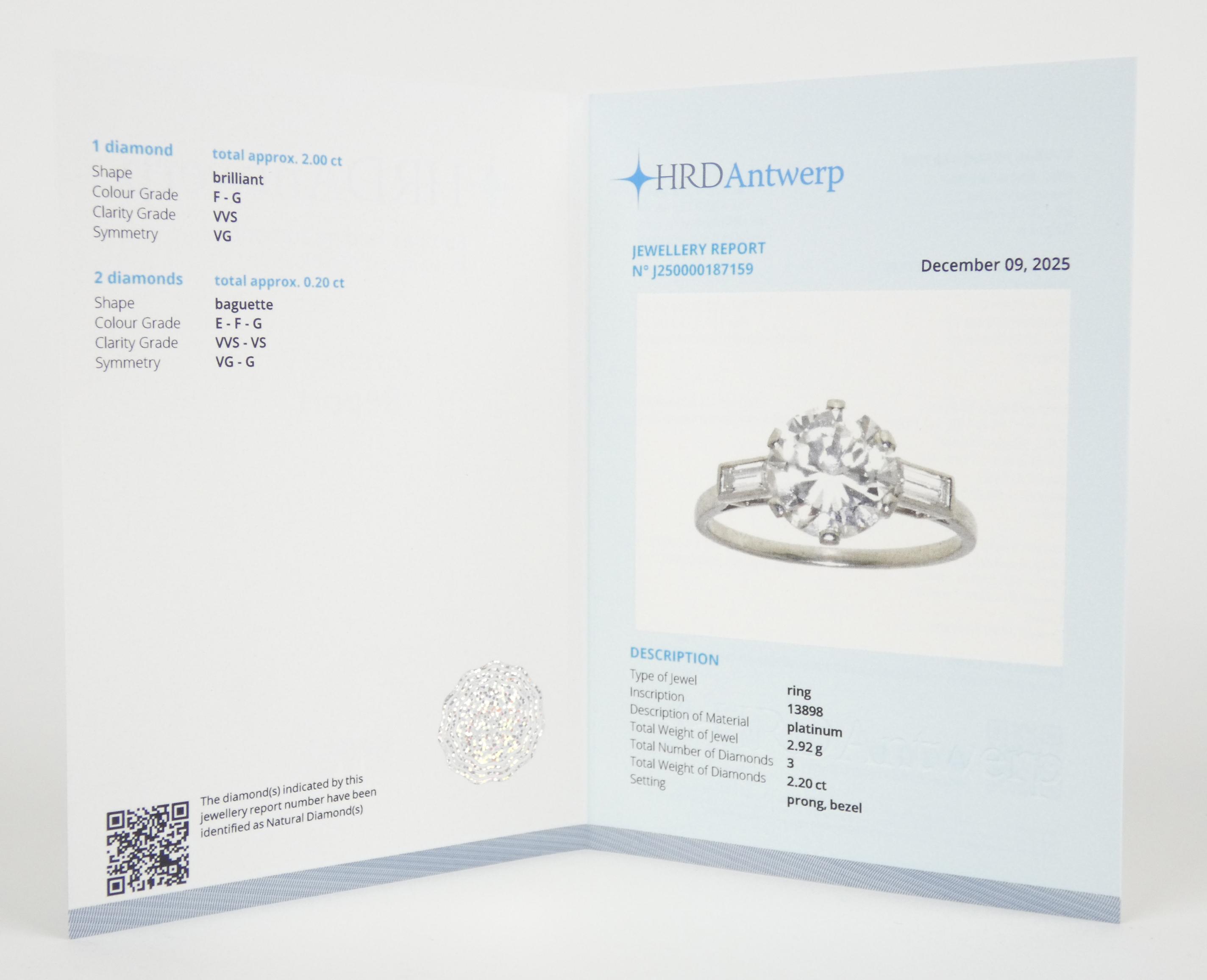 Bijou: Bague en platine sertie d'un diamant taille brillant de 2cts couleur F-G pureté VVS symétrie très bonne épaulé de 2 diamants baguette pour 0,20cts 2,9g avec certif HRD
