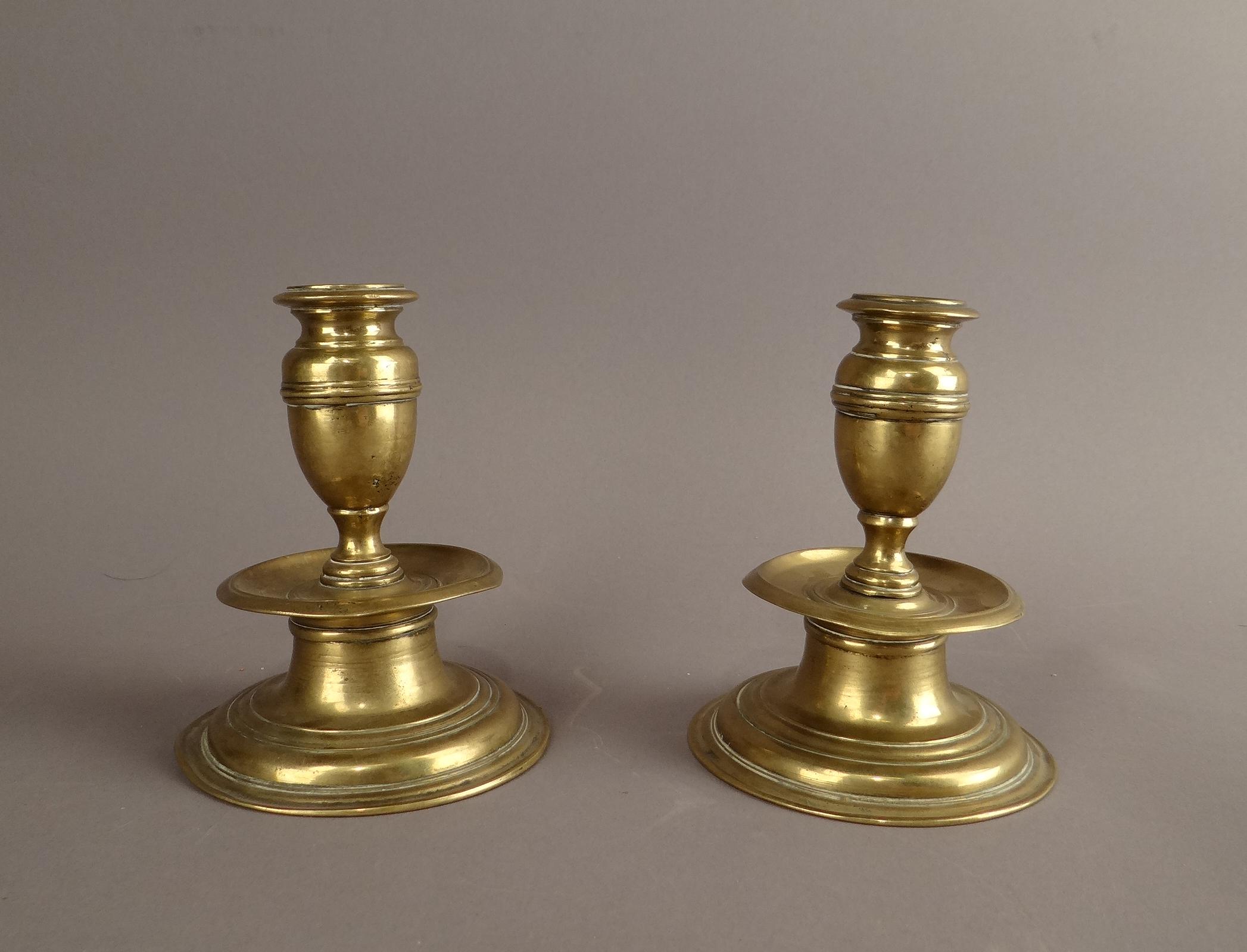 Paire de bougeoirs à plateau bobèche en forme de gland pied à ressaut début 17eS