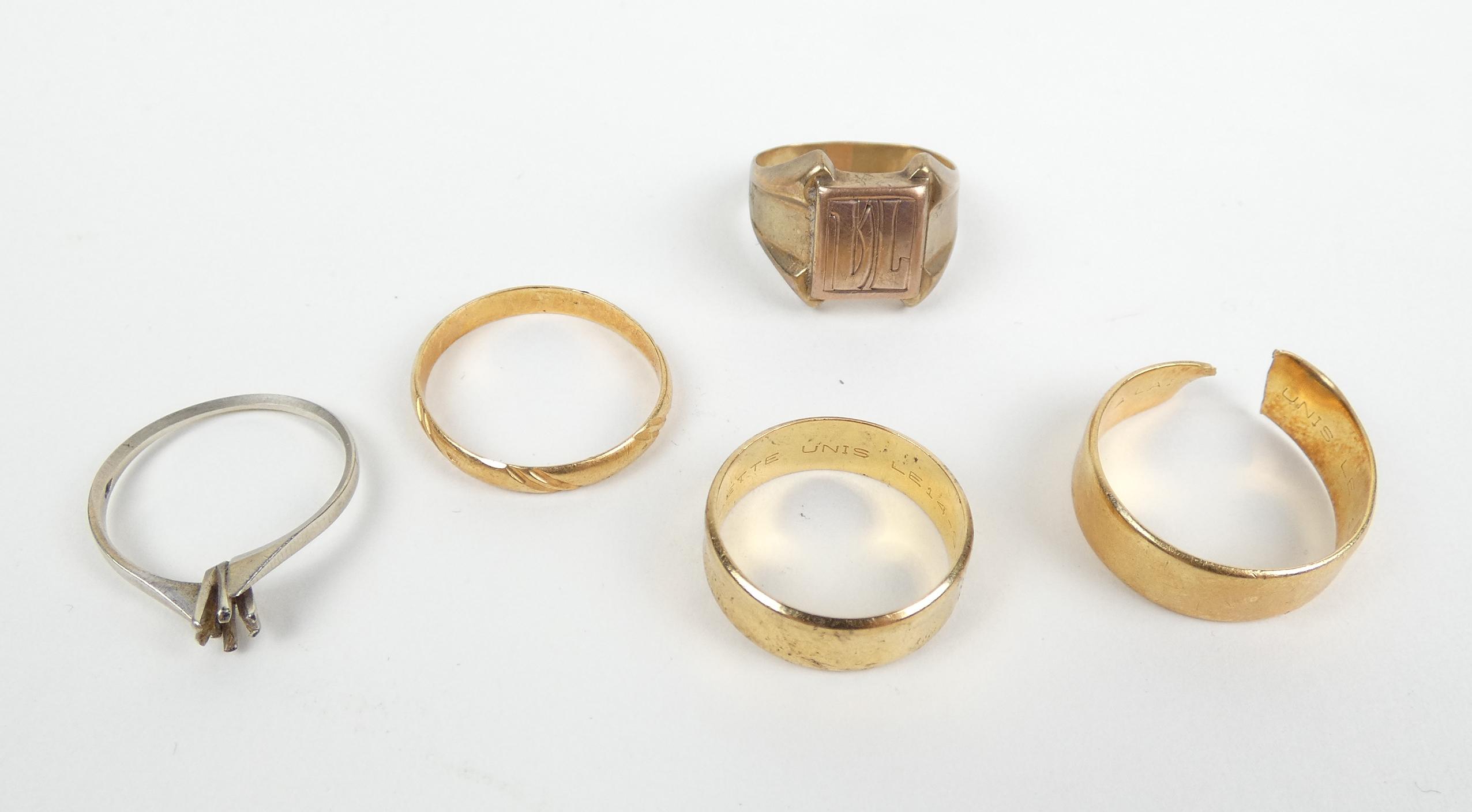 Bijou: Bagues/alliances (acc) (4) en or jaune 18K P: 11,5g et 1 chevalière en or jaune 9K P: 3,4g