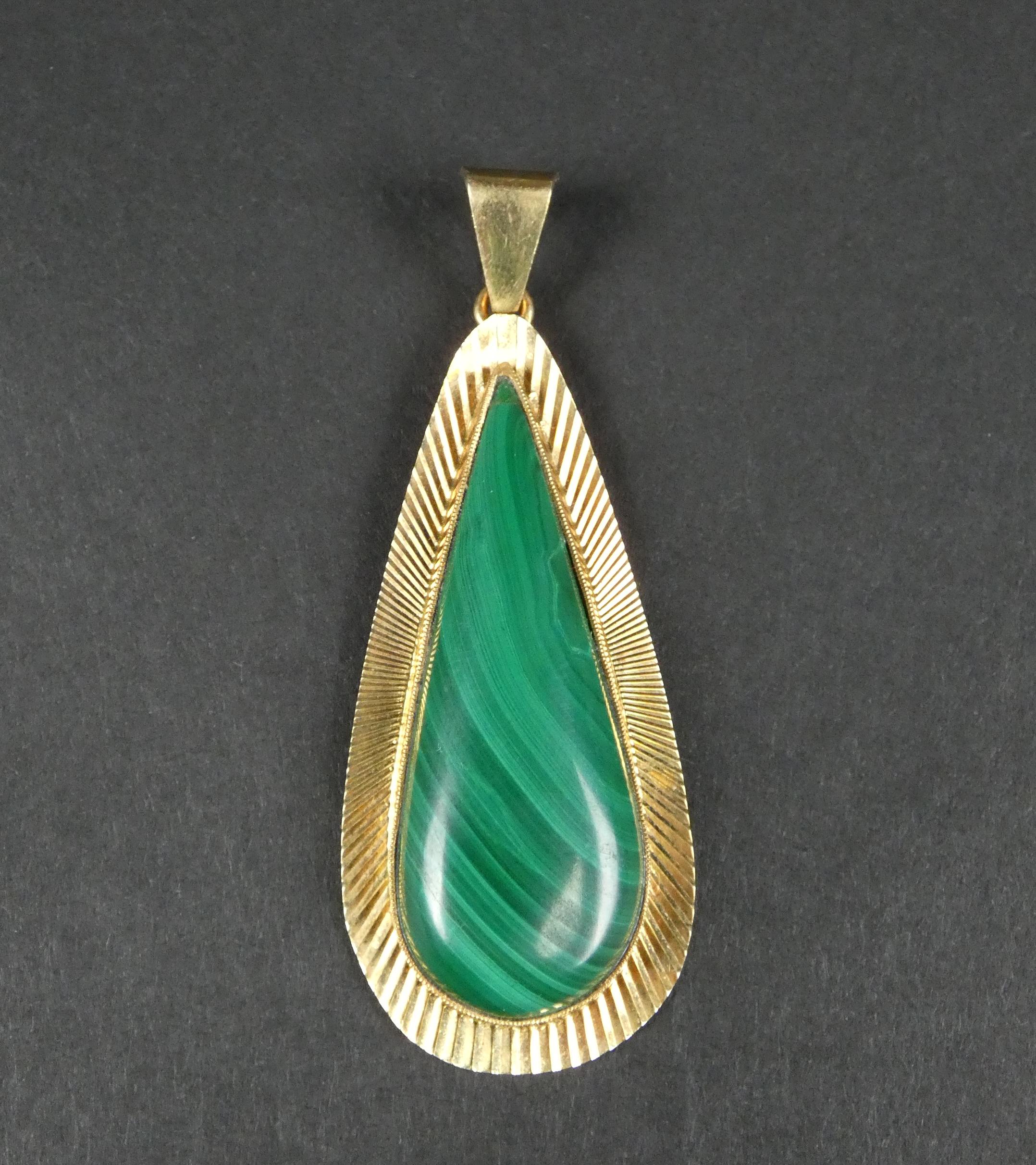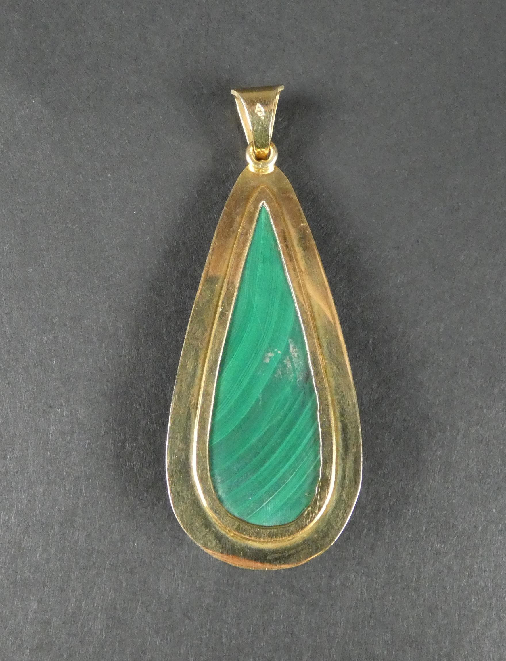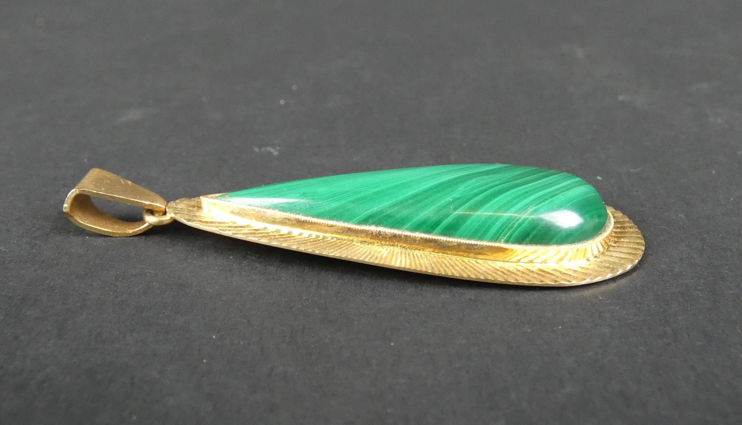 Bijou: Pendentif en or jaune 18K serti d'une goutte de malachite Pbrut: 13g H: 6cm