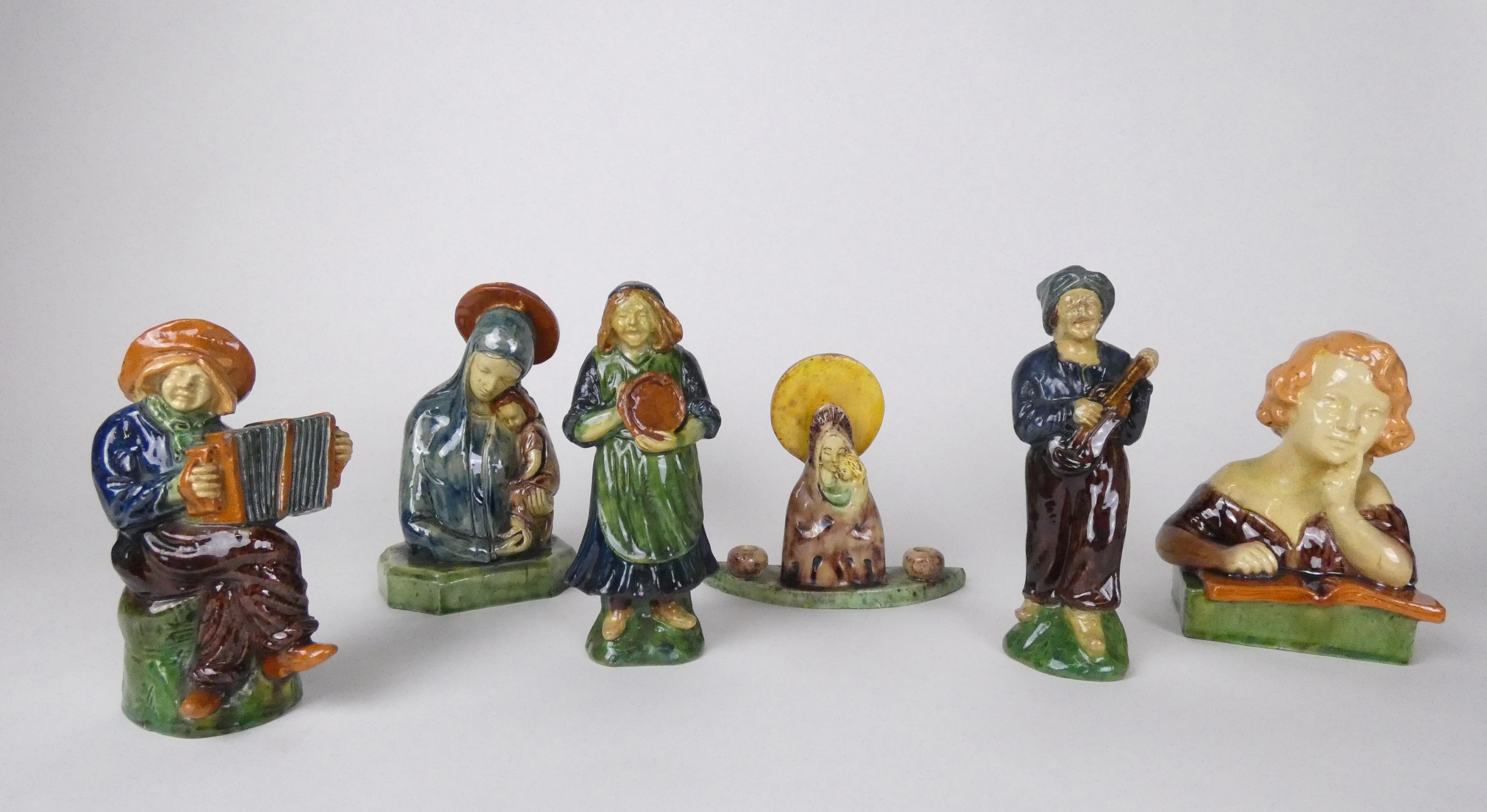 Céramique: Lot de sculptures en faïence (6pcs) (egr) dont 1 signé *NOSEDA A.* (Alfons) (1885, 1945) ainsi que 2 -Vierge à l'enfant- H+grd:20cm