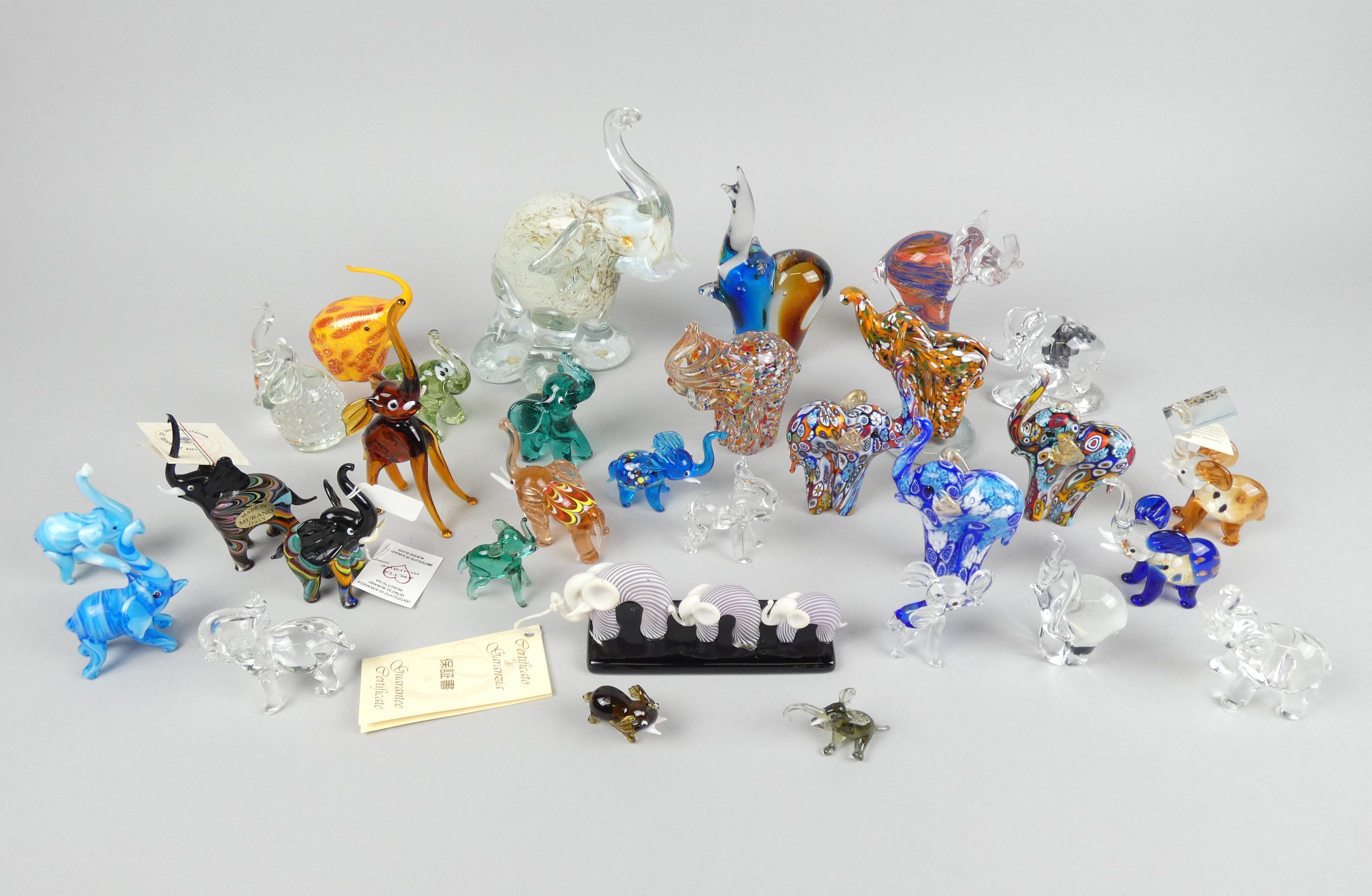 Verrerie: Objet de vitrine: collection d'environ 30 éléphants en verre dont Murano