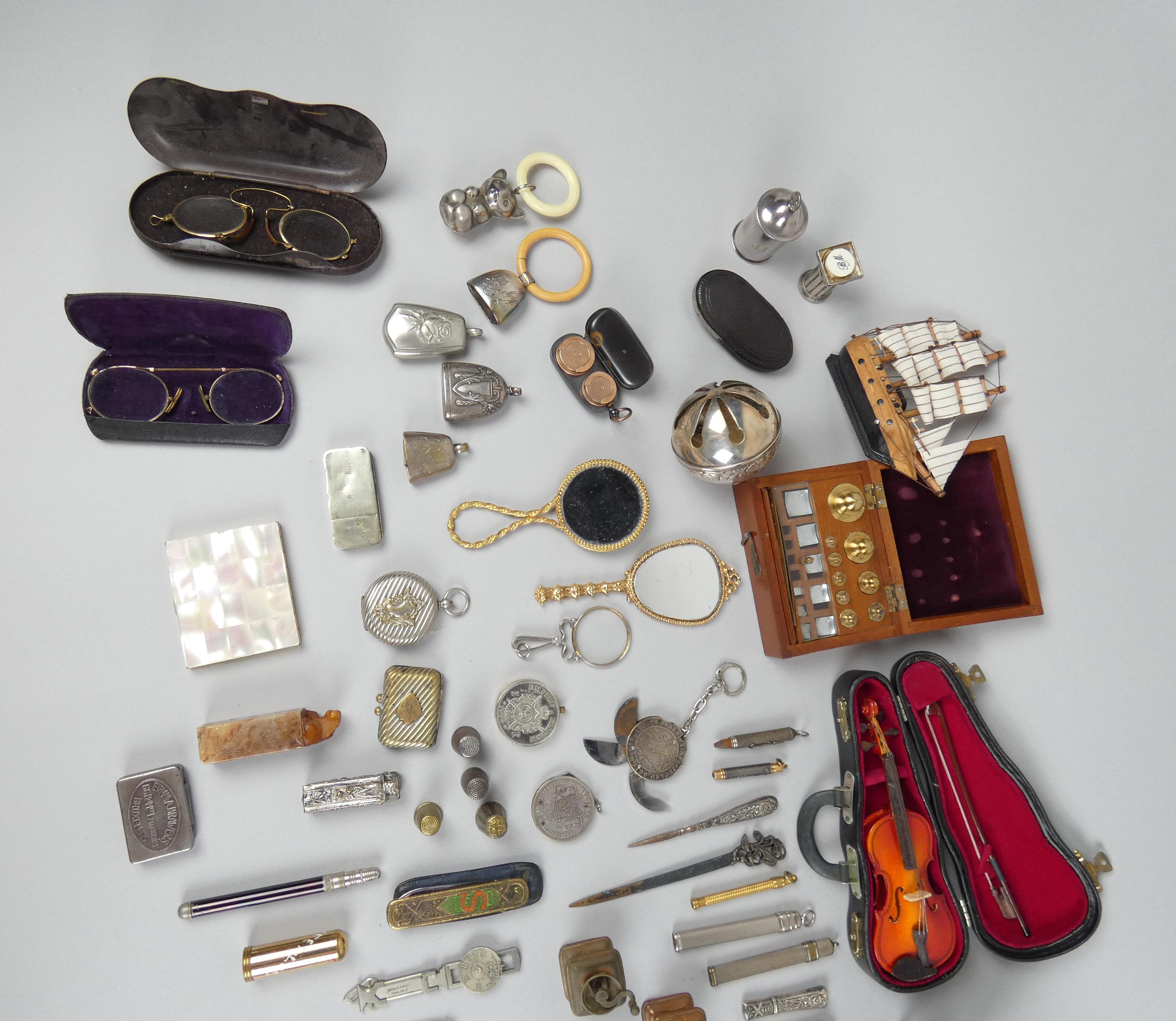 Objet: Curiosités: poudriers, crayons, dés à coudre, loupe, hochets, décapsuleurs,...