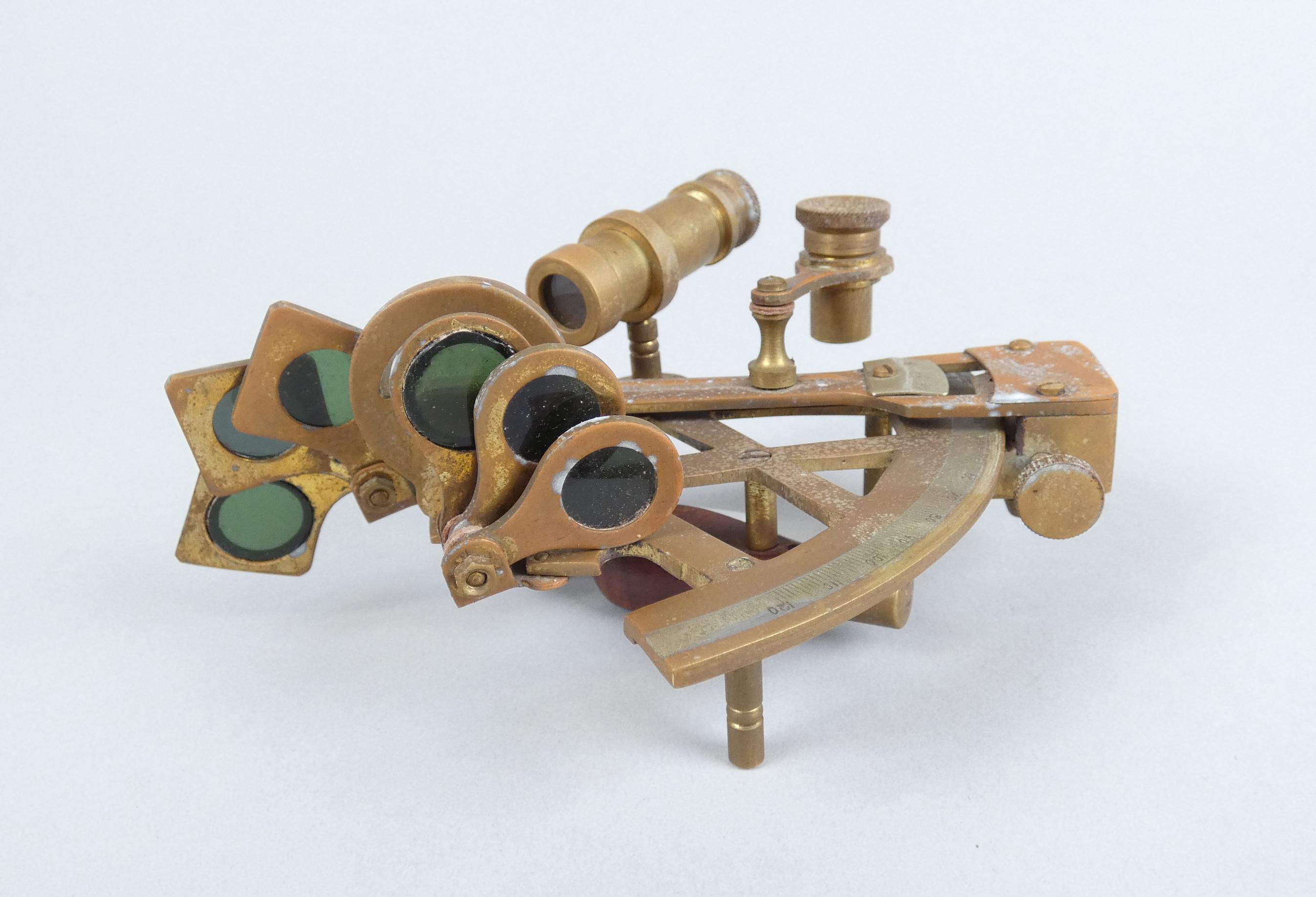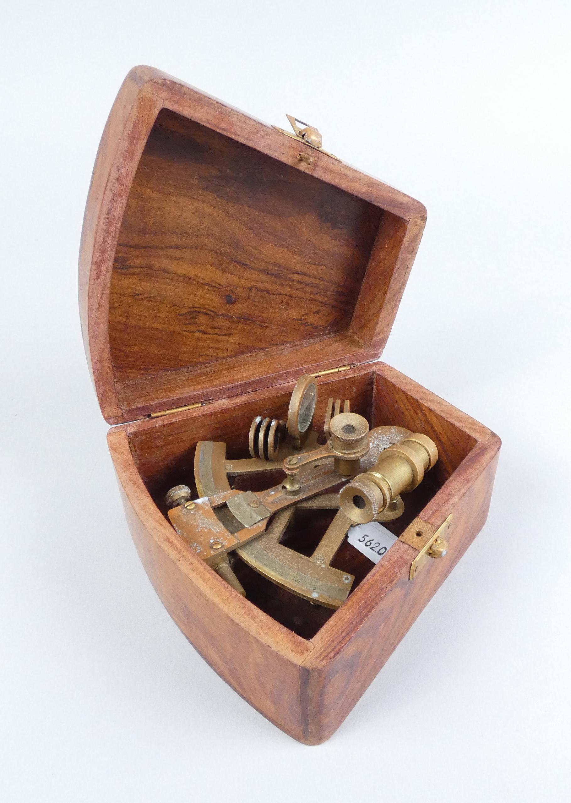 Objet: Instrument de marine en laiton -Sextant- (traces d'usures, pt oxy) dans sa boite 8x14x15cm