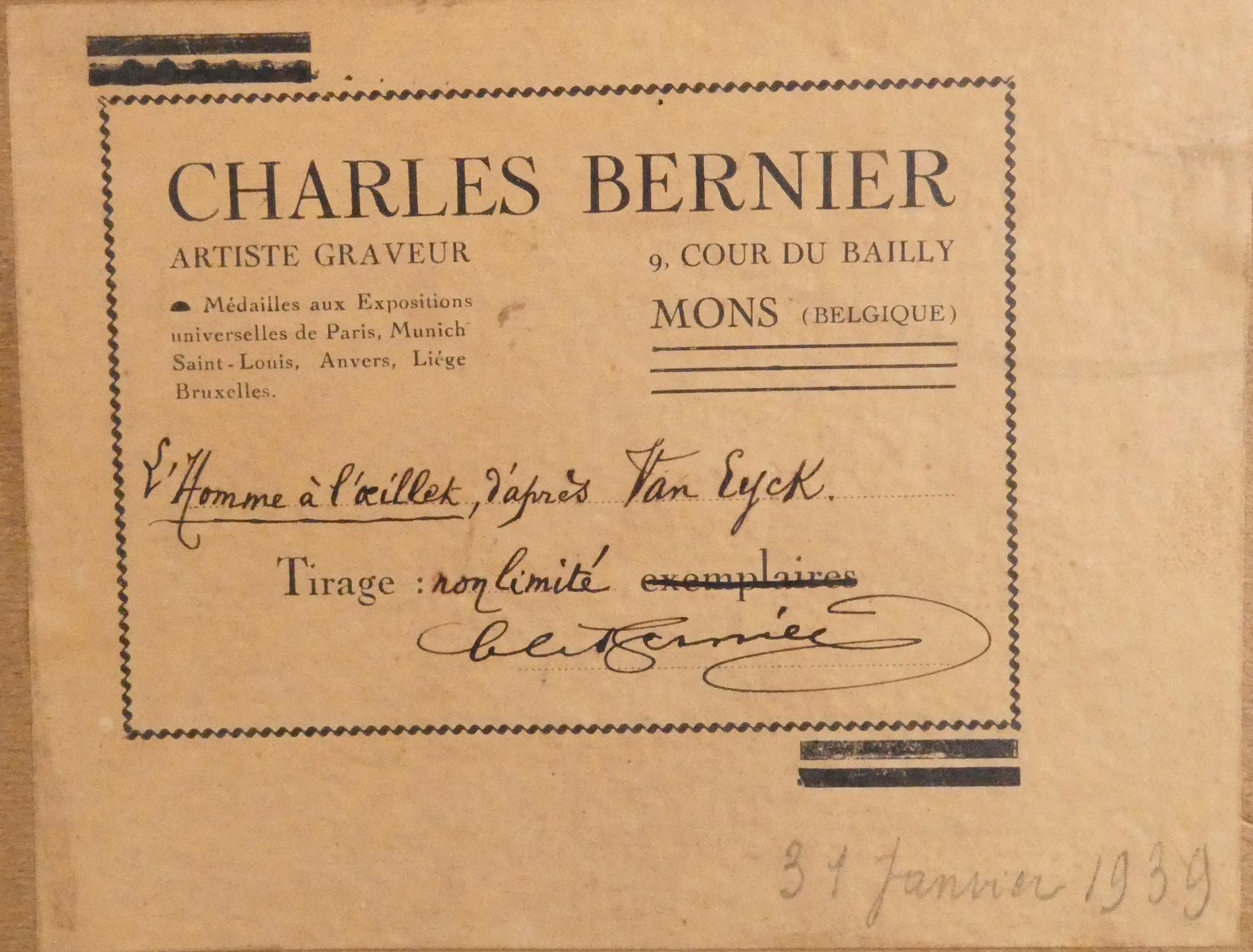 Estampe: Eau-forte - L'homme à l'Oeillet d'après Van EYCK- daté 1903 Epreuve d'Etat signé *BERNIER C.* (Charles) (1871, 1950) 11,5x8cm cadre bois sous verre