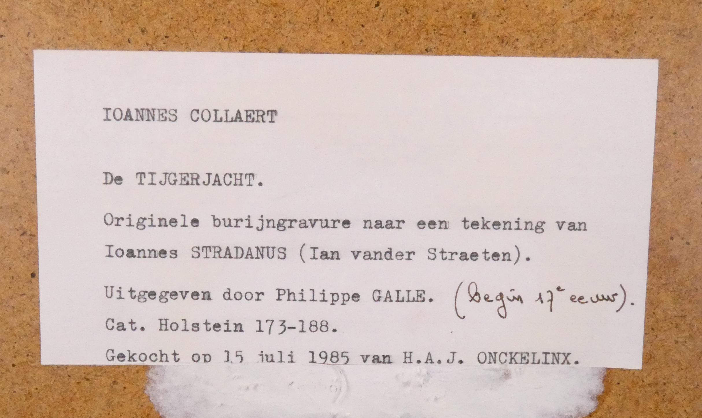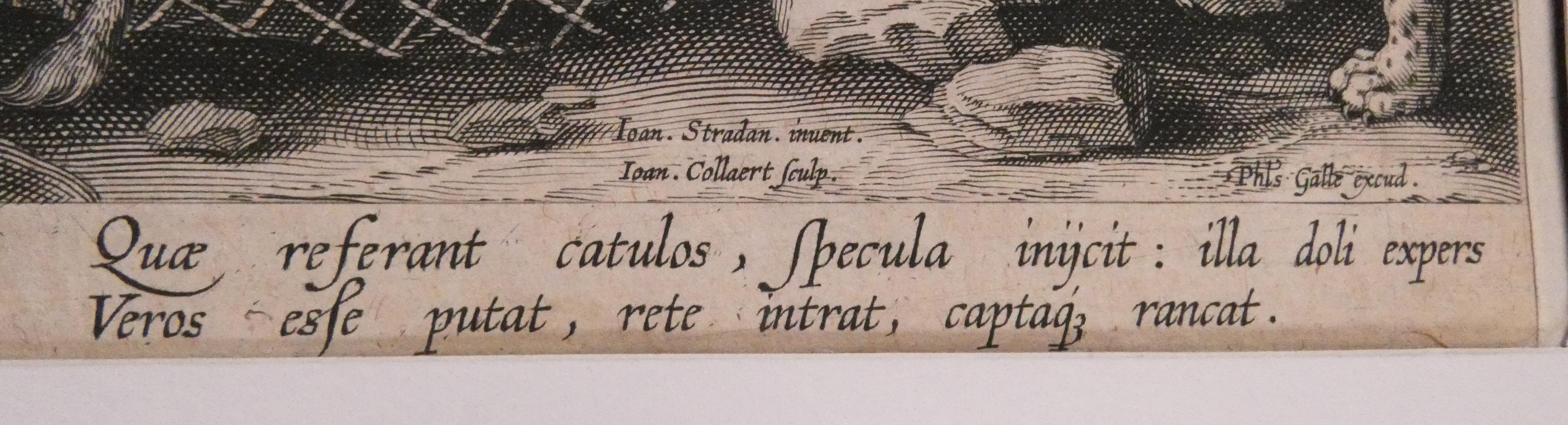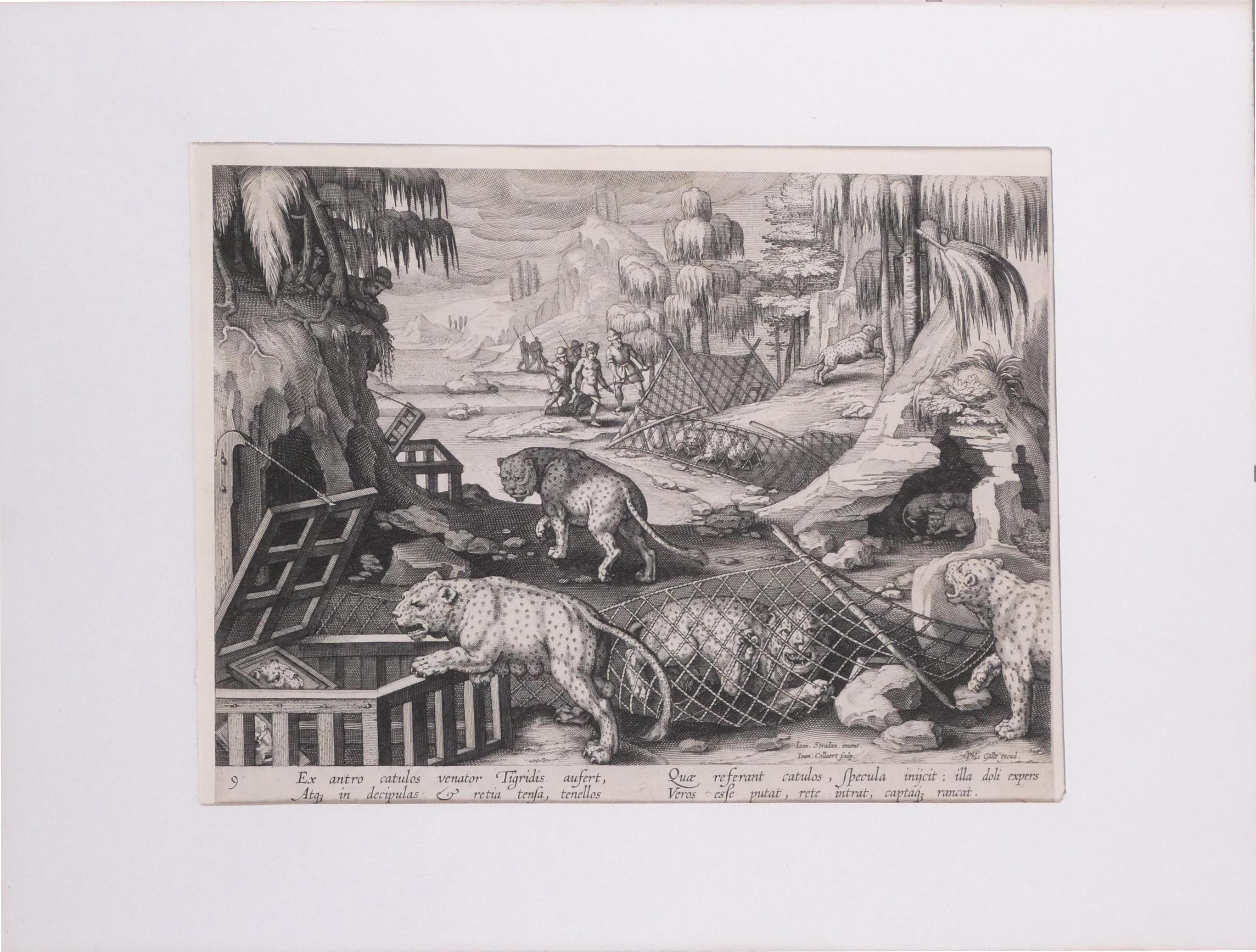 Estampe: Eau-Forte -Capture des fauves- *GALLE P.* (Philip) (1537, 1612) 20x26cm cadre sans verre