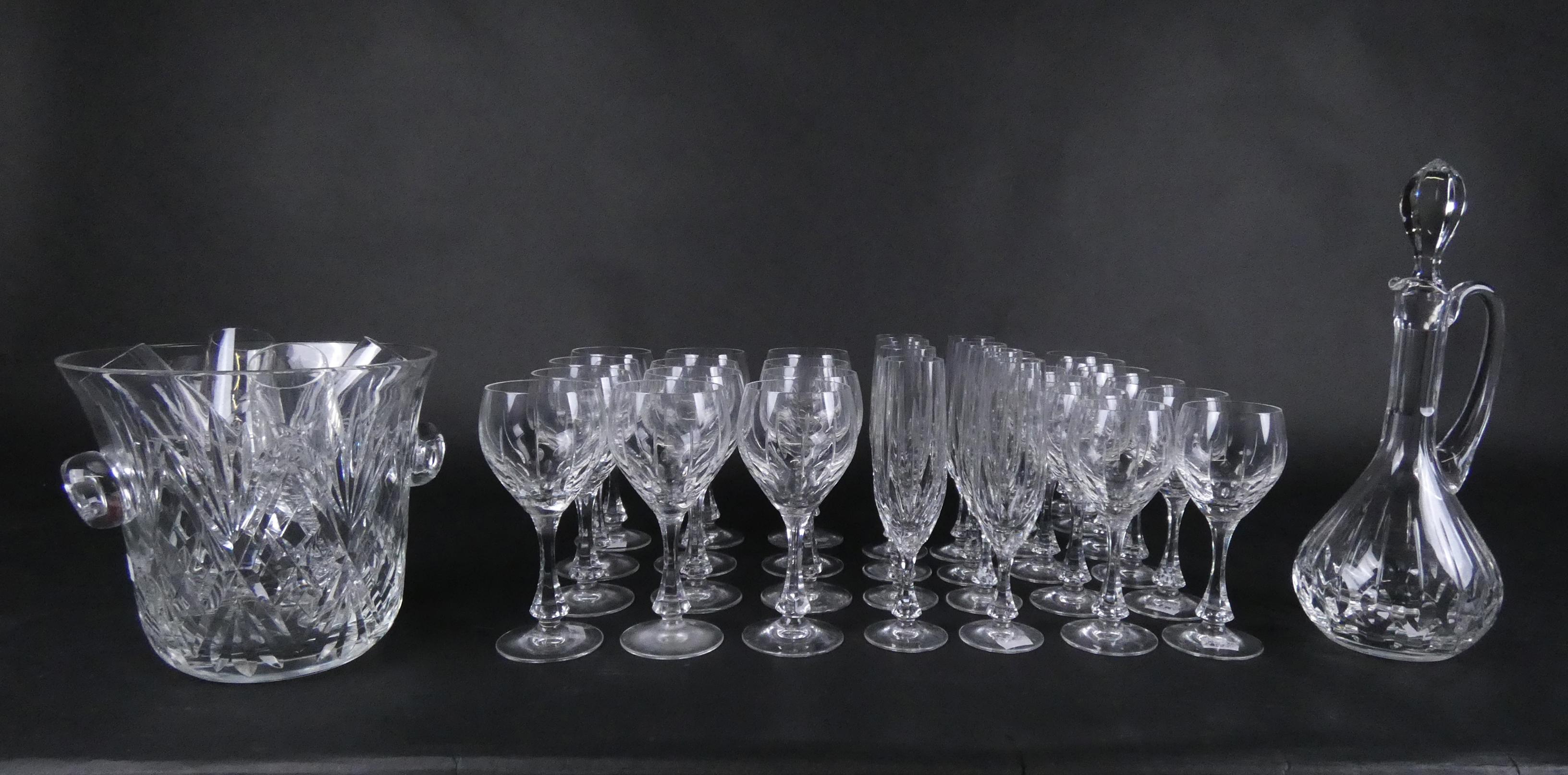Verrerie: service de verres en cristal taillé cachet Lemberg modèle Nora: 12 eau, 12 vin, 11 flûtes, 1 carafe + 1 seau à champagne cachet St Louis + 4 flûtes Klein (41pcs)
