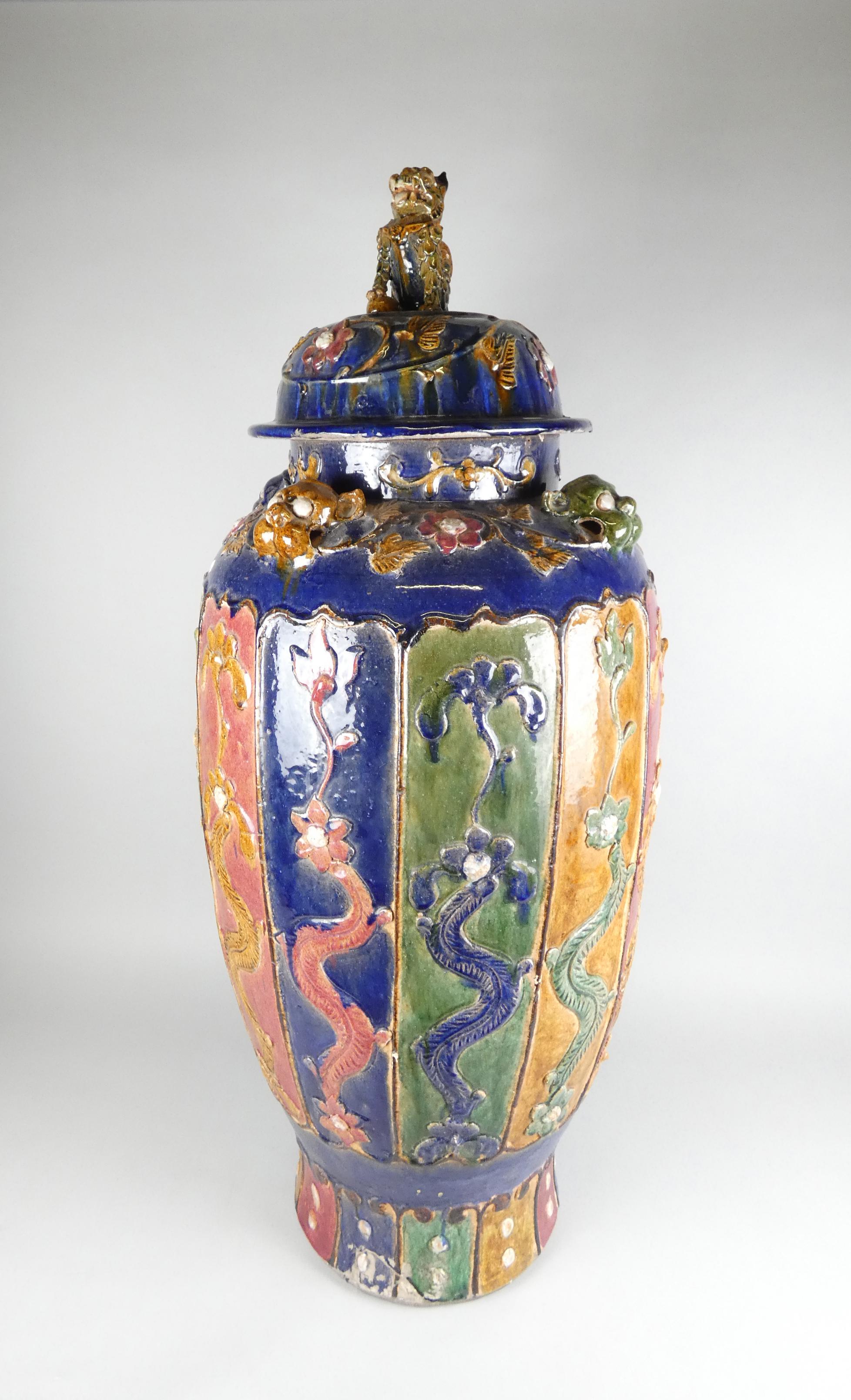 Asiatique: Jarre/potiche couverte en faïence Chine (rest, pt ecl) décor de végétaux et chien Fô H+/-:110cm a servi pour transporter du charbon