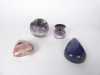 Collection: Goutte en lapis-lazuli H: 11,5cm forme libre en rhodocrosite H:10cm demi-sphère avec cristaux d'améthyste Diam: env.10cm objet/ porte bougie en améthyste H:5,5cm