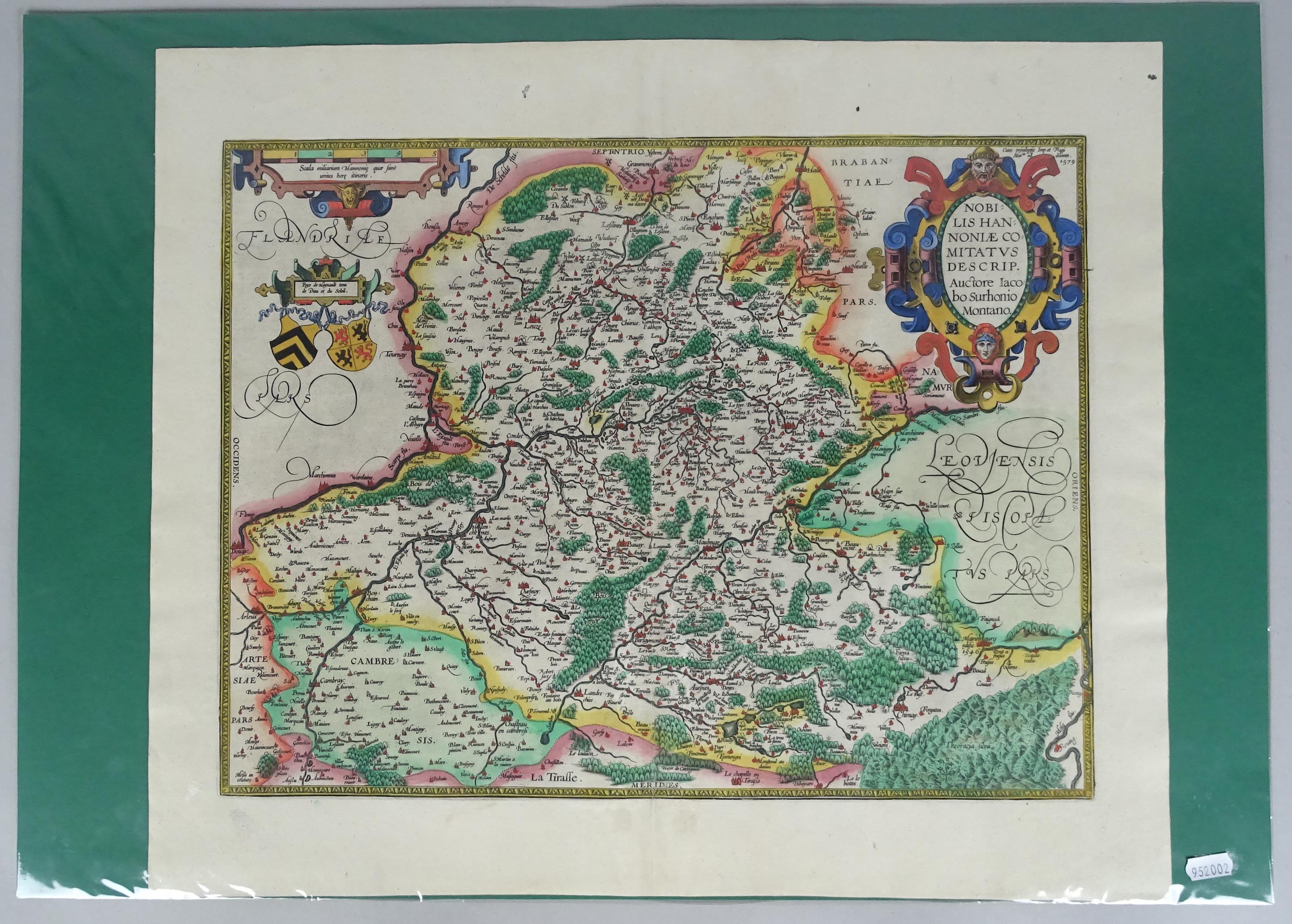 Estampe: Gravure aquarellée sur cuivre -Comté du Hainaut- 1579 ORTELIUS 37,5x48cm
