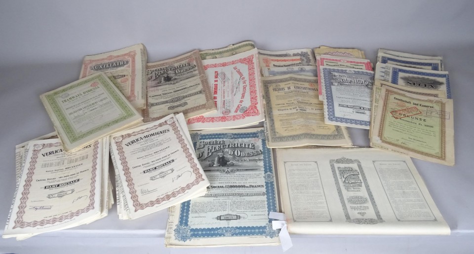 Collection: scripophilie: actions/titres fin 19eS début 20eS Russie/ Congo/ Argentine/ Roumanie/ Belgique/ Allemagne.