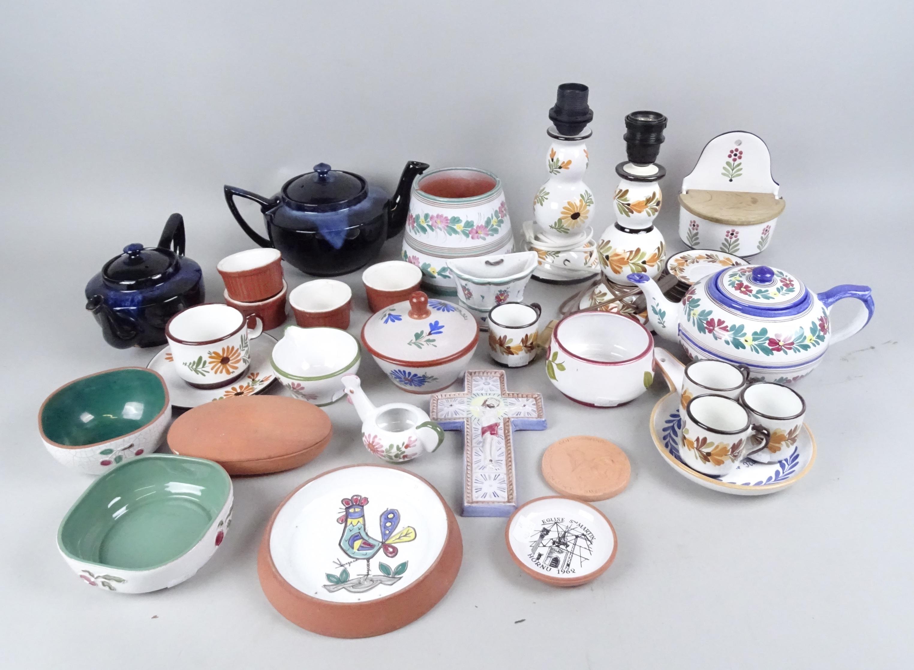Céramique: Sars la Bruyère divers décors (ecl, rest) dont vide-poches Coq, boite à sel, théière, crucifix, pique-fleurs, bol à cerises...(29pces)