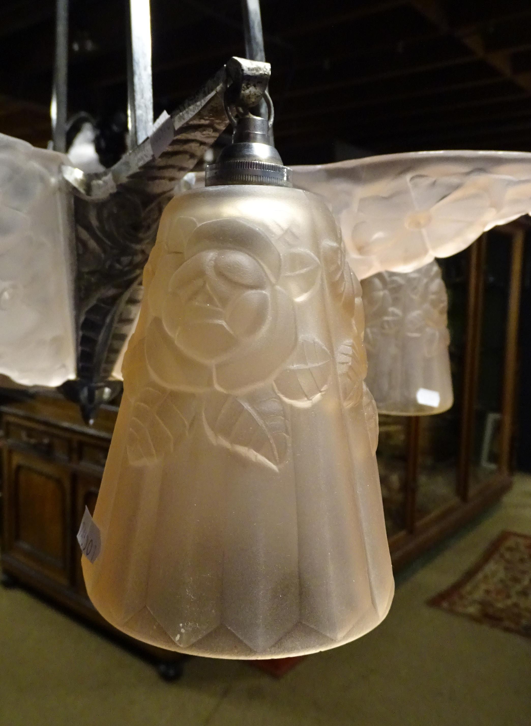 Luminaire: Lustre Art Déco monture en métal argenté (fixation acc, rest) et verre moulé maté signé DEGUE *GUERON D.* (David) (1892, 1950) H:90cm