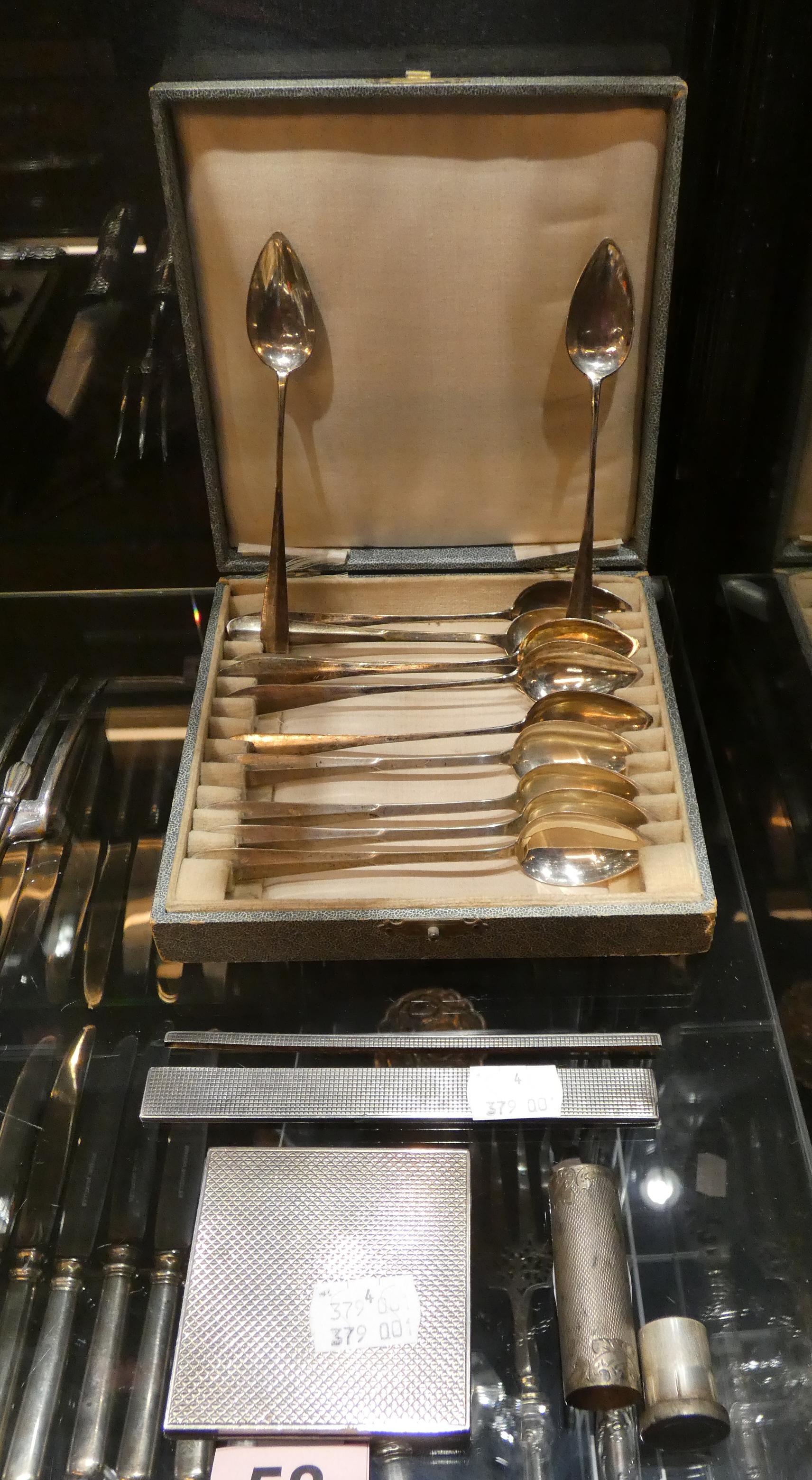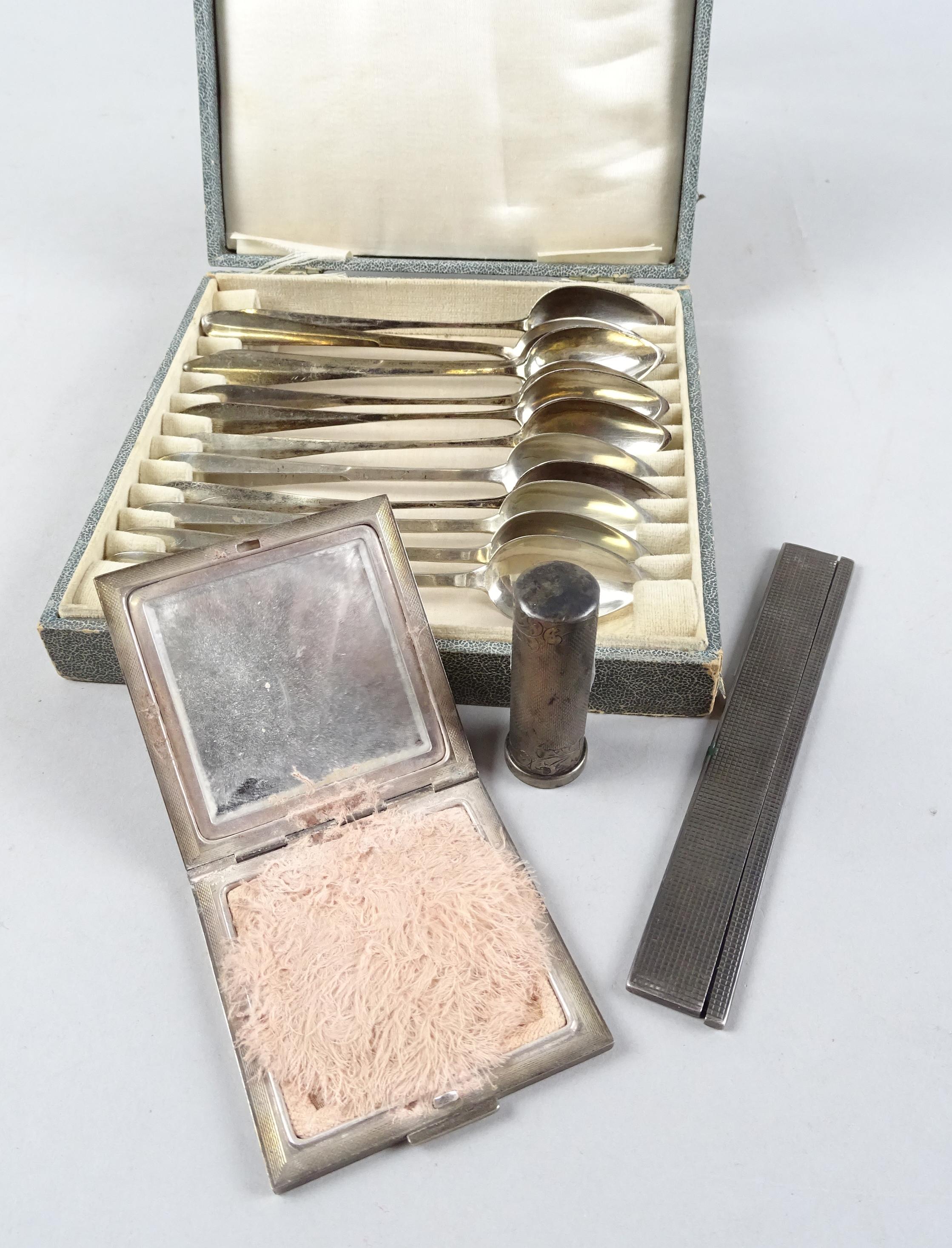 Argenterie: lot en argent (4pcs) Pbrut:263g: 12 cuillères en 105g + peigne et son étui 24g + étui à rouge à lèvres 14g + poudrier 115g
