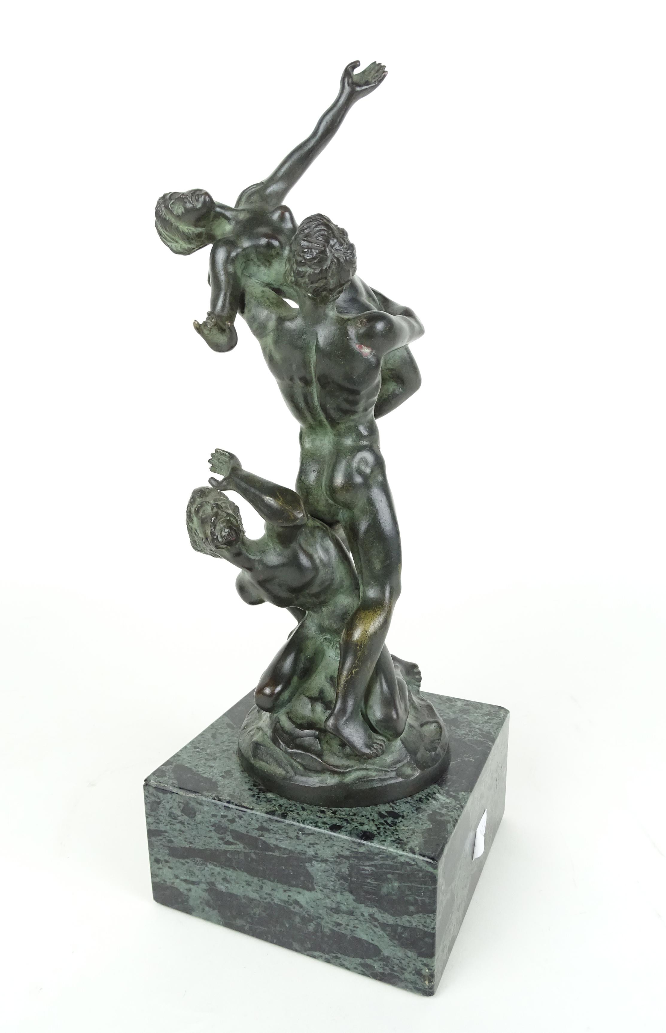 Sculpture: Bronze à patine verte -L'enlèvement des Sabines- signé d'après *DE BOLOGNE J.* (Jean) (1529, 1608) dit GIAMBOLOGNA H:28cm sur socle en marbre