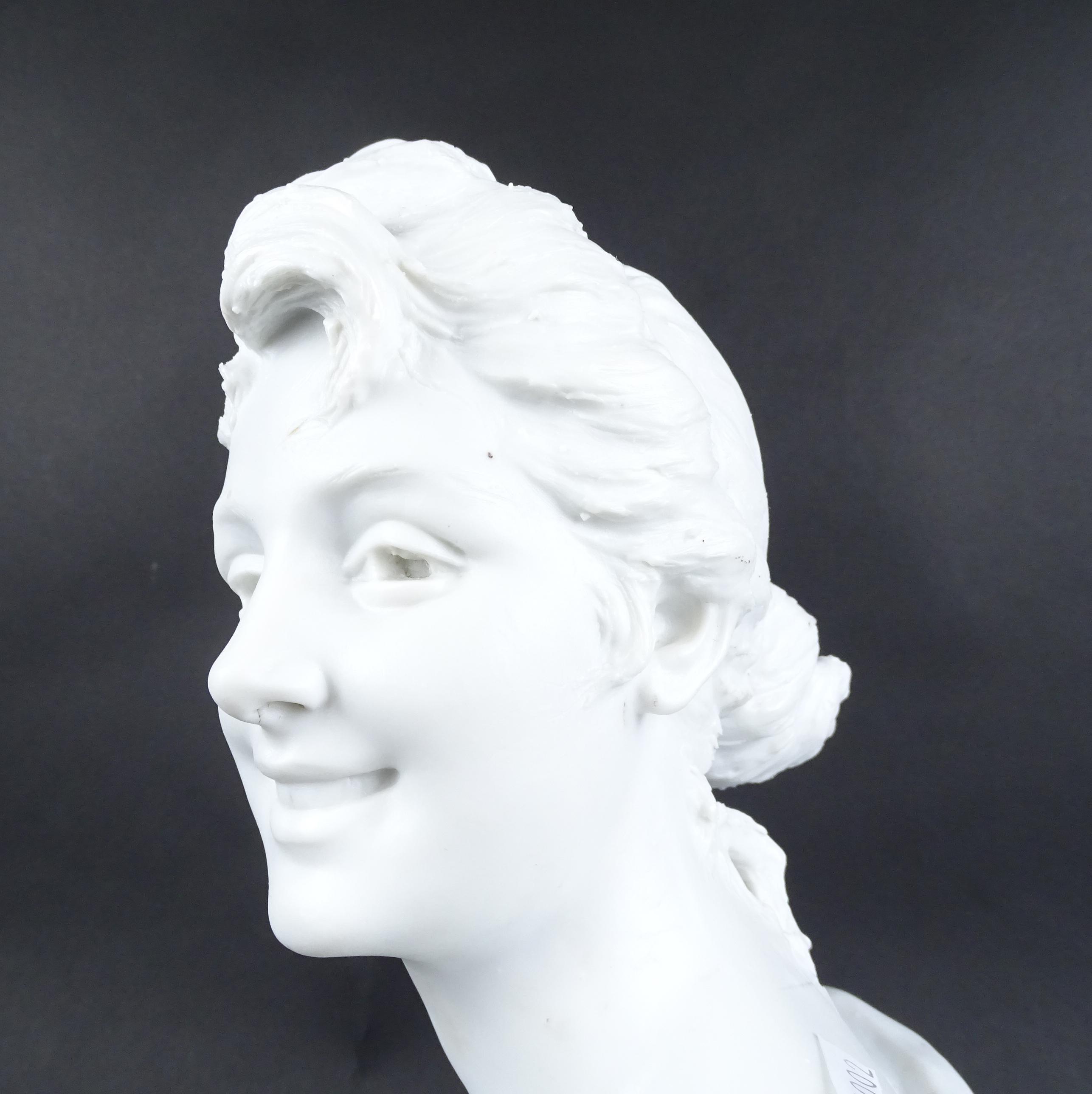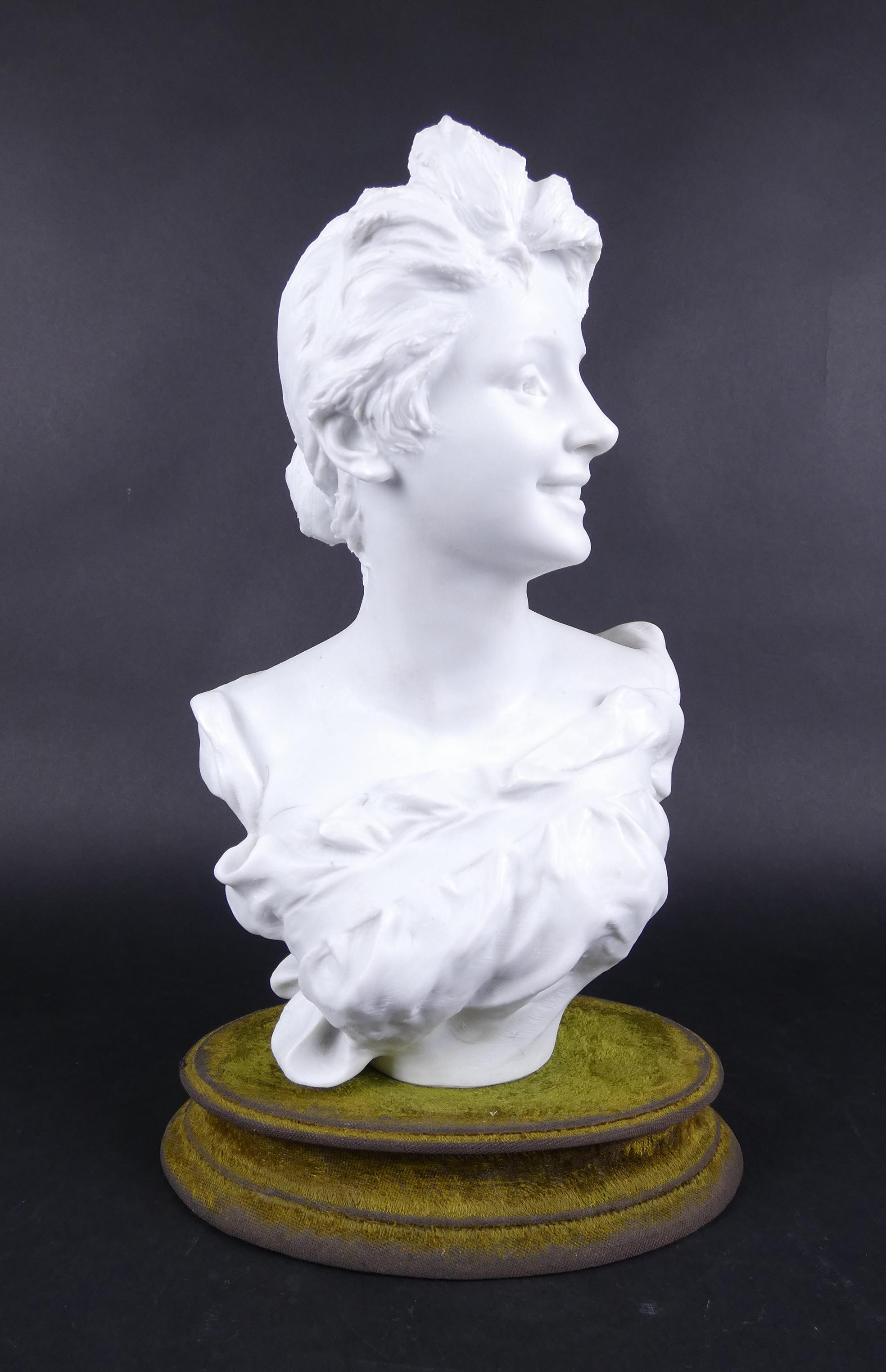 Sculpture: Buste en porcelaine / biscuit glaçuré -La femme au sourire- signé *VAN DER STRAETEN G.* (Georges) (1856, 1928) H:37cm sur socle