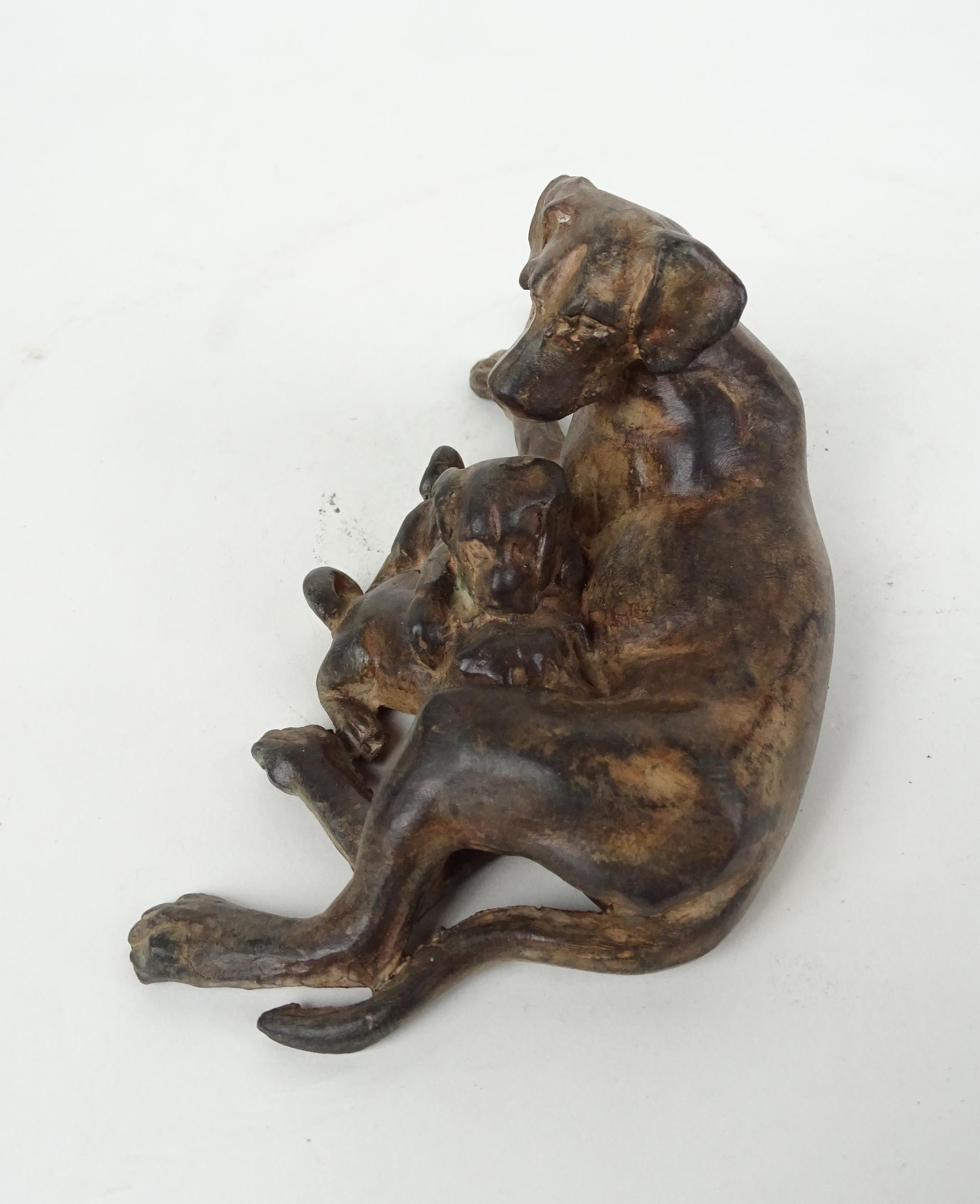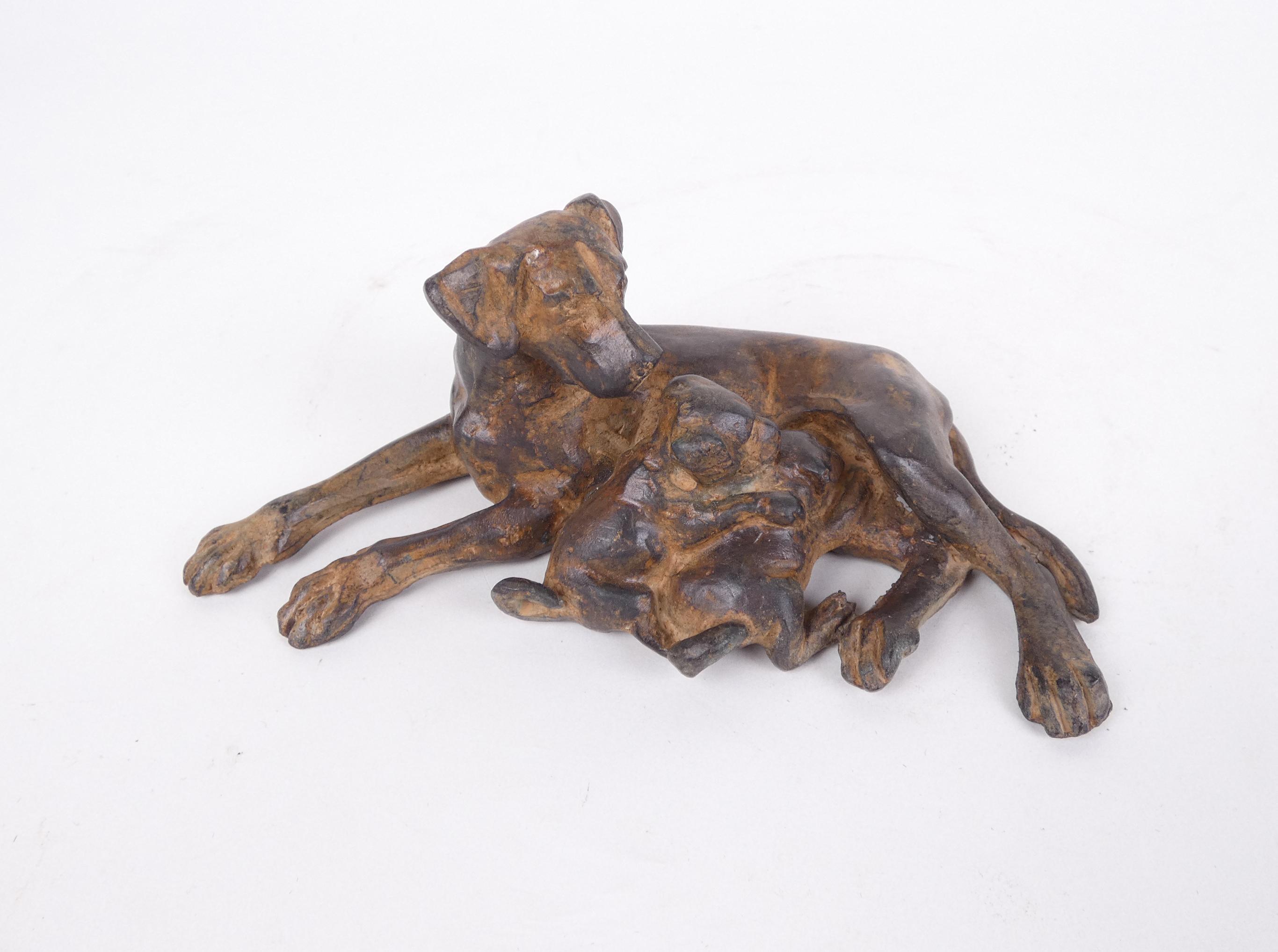 Sculpture: Bronze à patine brune -Chienne de chasse et ses petits- signé *CHENET P.* (Pierre) (français né vers 1922,) 7x16,5x8cm