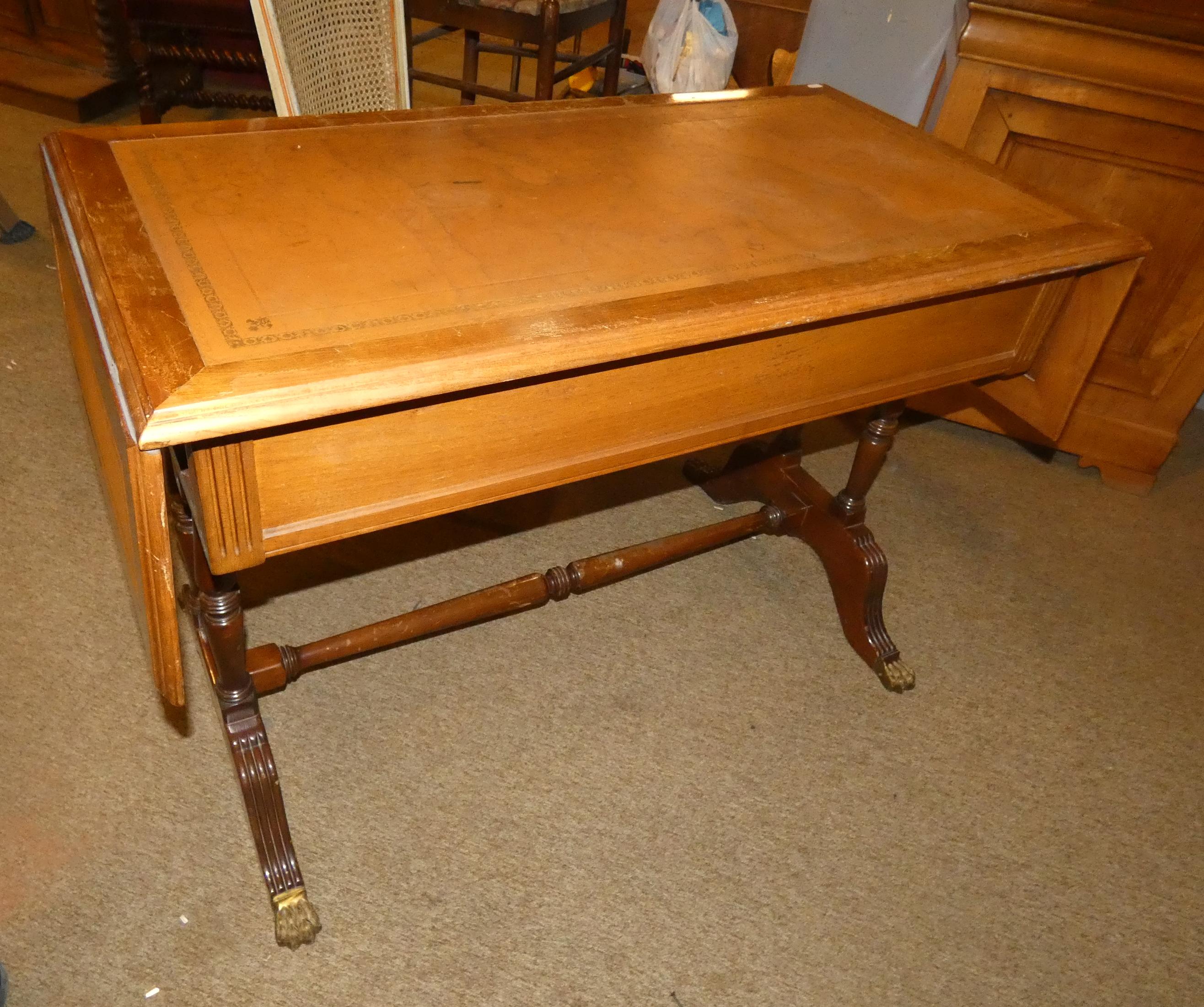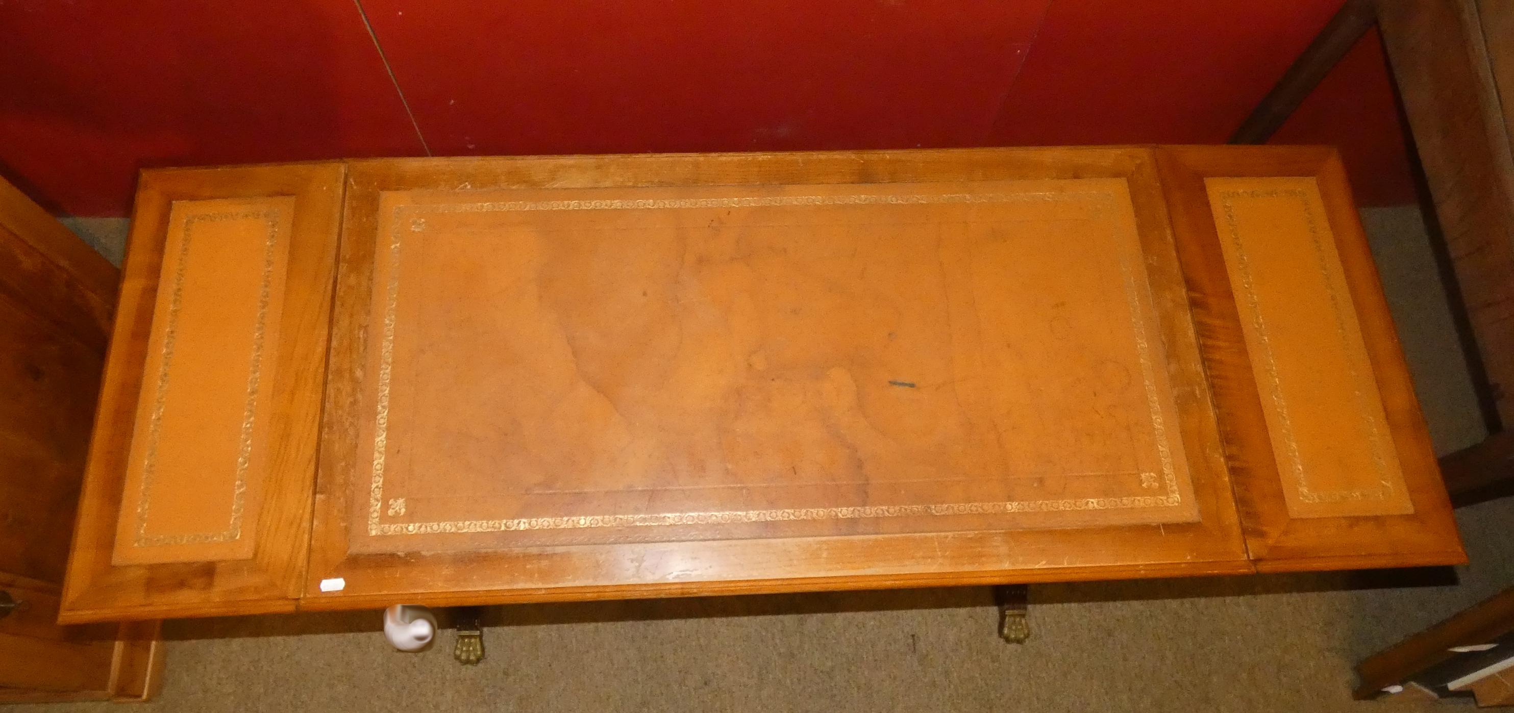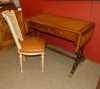 Meuble: Bureau anglais de style regency en acajou 2 rabats dessus cuir (usure, rayures) + chaise patinée 2 tiroirs pieds griffes