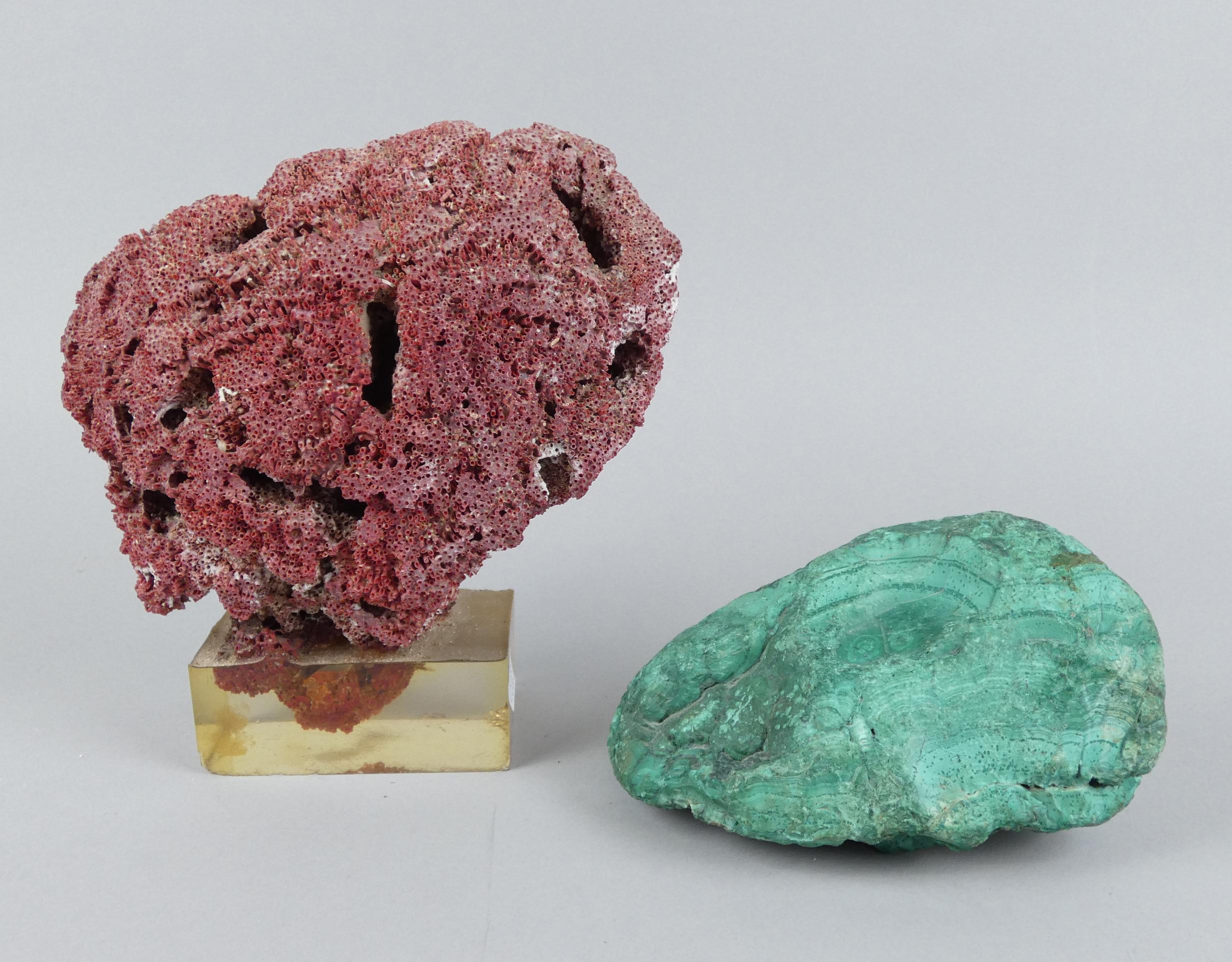 Collection minéraux EU ONLY: Bloc de malachite brut P: 2kg352 L: env 16cm + Corail rouge avec socle en résine H: 20cm