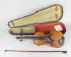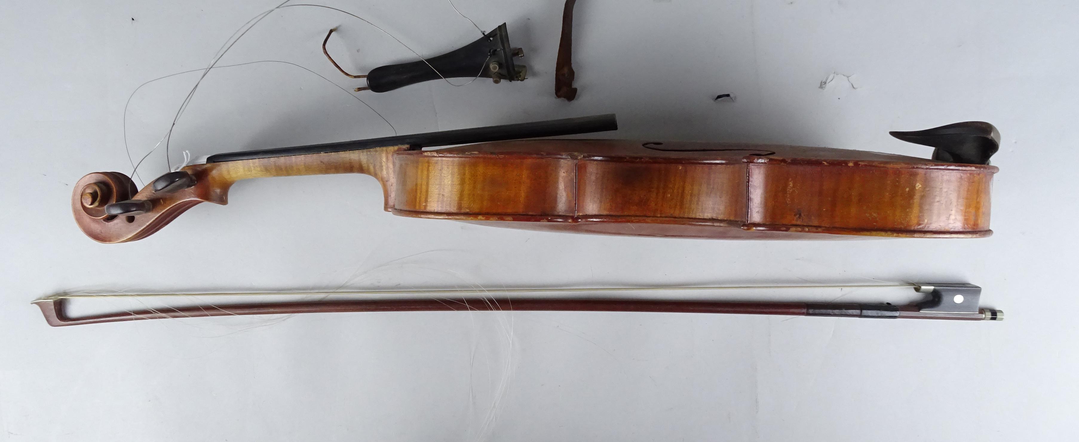 Musique: Violon ancien entier (usure, mq) dos en 2 parties étiquette apocryphe -Joseph GUARNARIUS- avec archet (acc) + étui