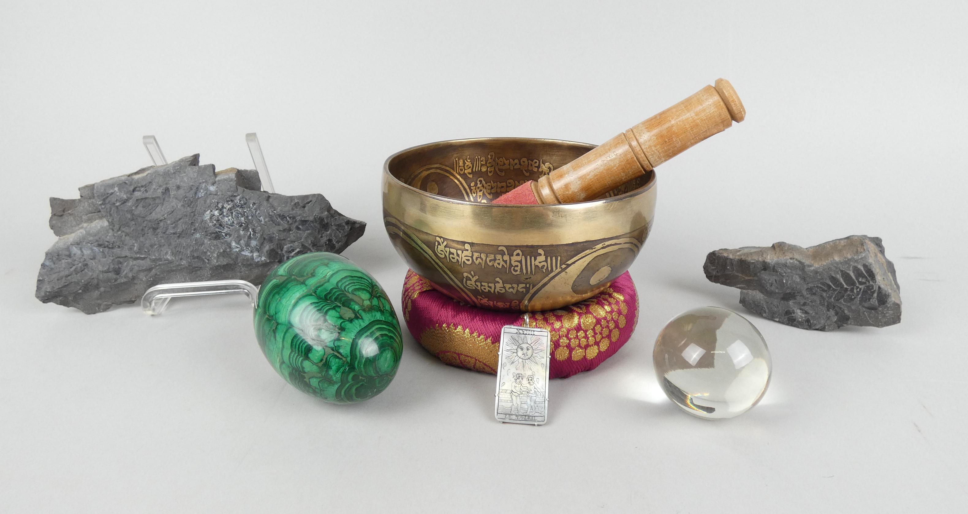 Objet: Bol tibétain gravé a/mailloche D:14,5 +Oeuf en malachite H:9 +Pendentif argent et nacre gravée Georgescu Gregory H:4,5cm +boule de cristal +2 fossiles de plantes