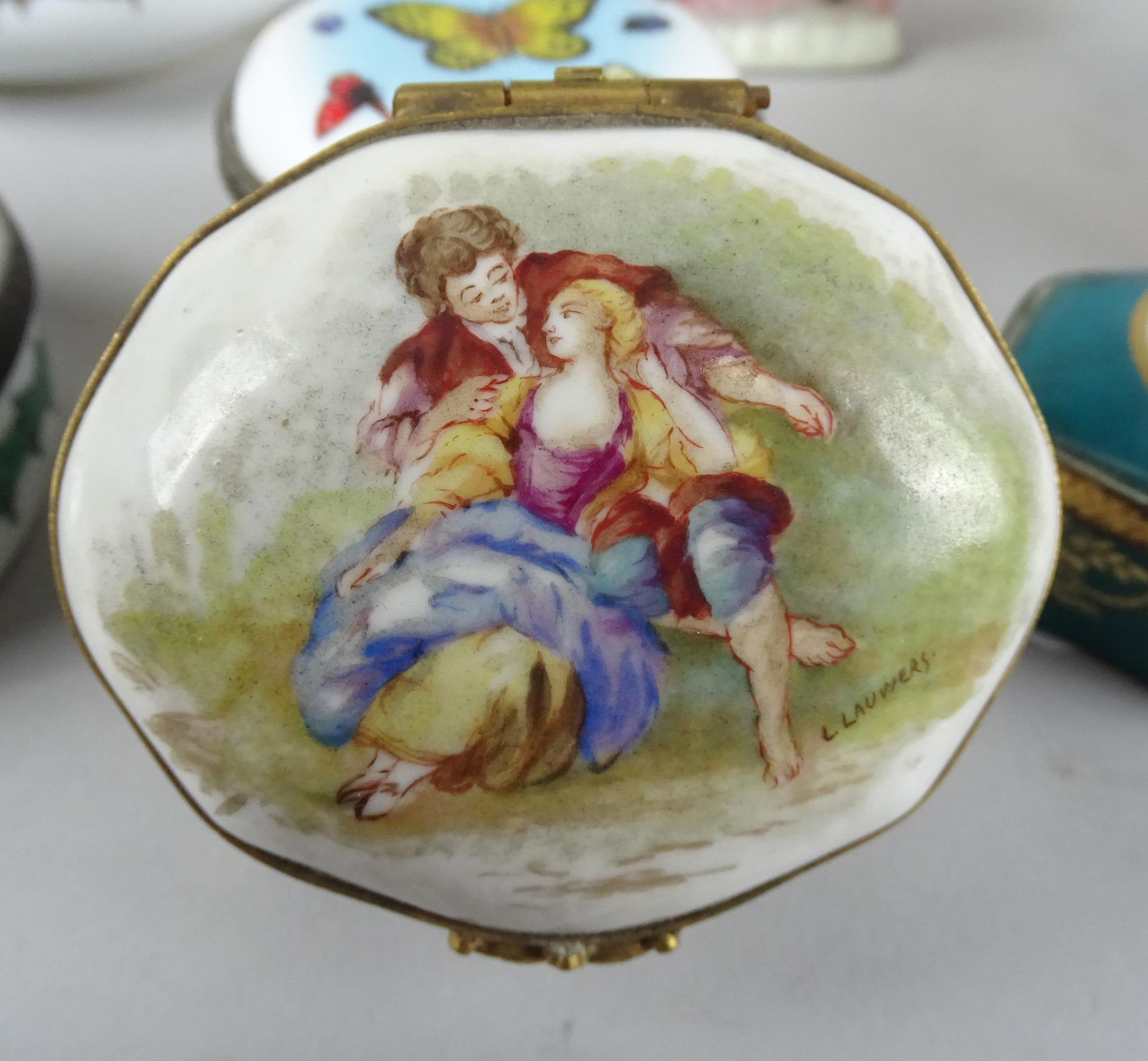 Céramique: Collection de boites / coffrets en porcelaine dont à pillules, décors peints, scène érotique, divers marquages, 1 en faience (cheveux) (28pcs)