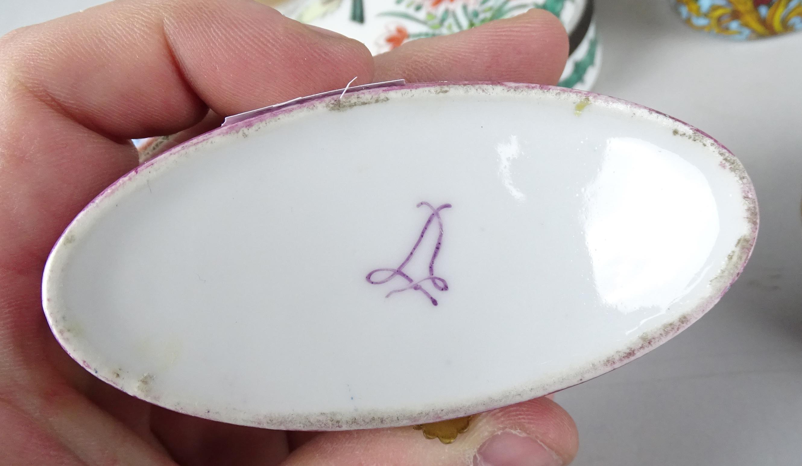 Céramique : Collection de boites / coffrets en porcelaine dont à pillules , décors peints , scène érotique , divers marquages , 1 en faience (cheveux)