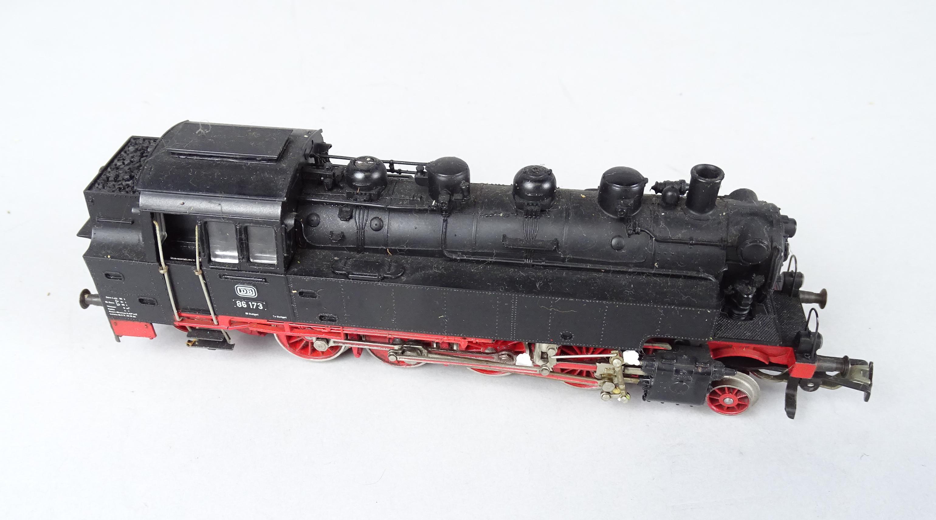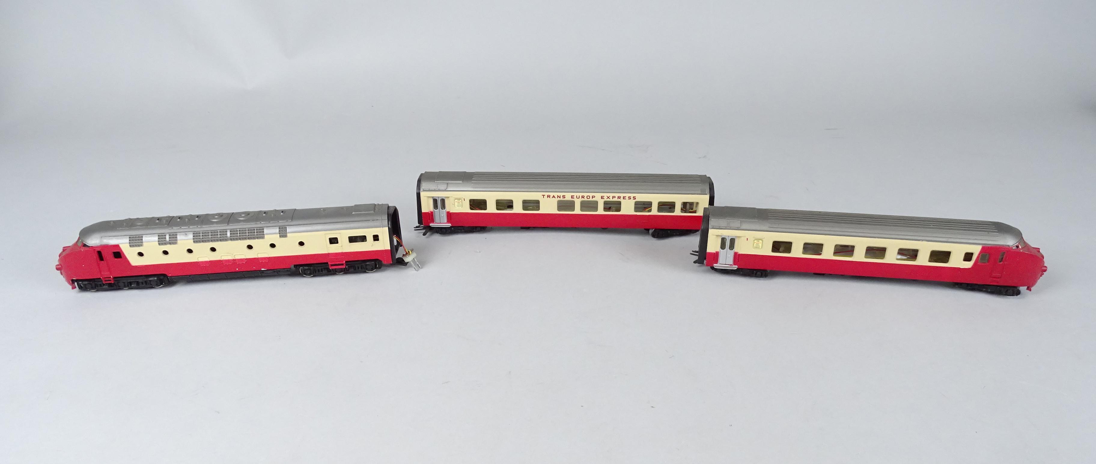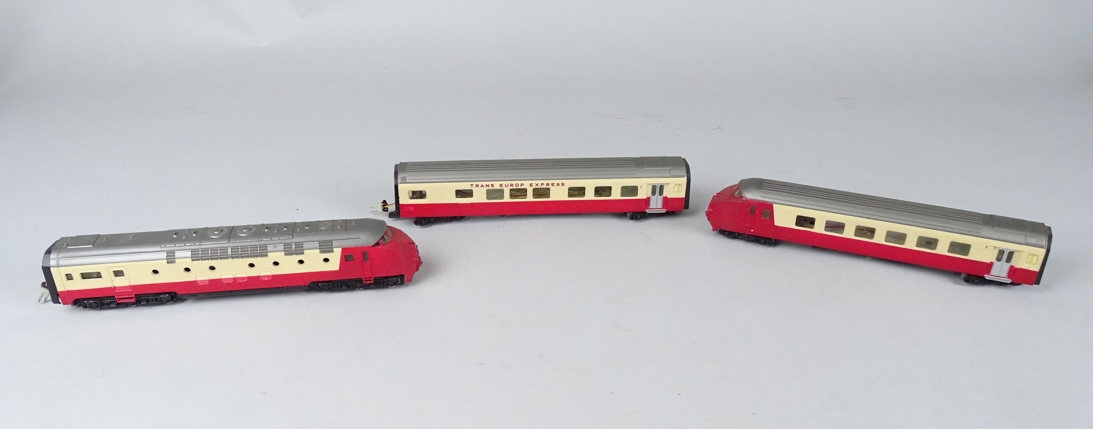 Jouet : Trains H0 MARKLIN (traces d'usages)) : locomotive diesel Trans Europ Express + 6 locomotives + 19 wagons + transfos + rails + aiguillages + divers