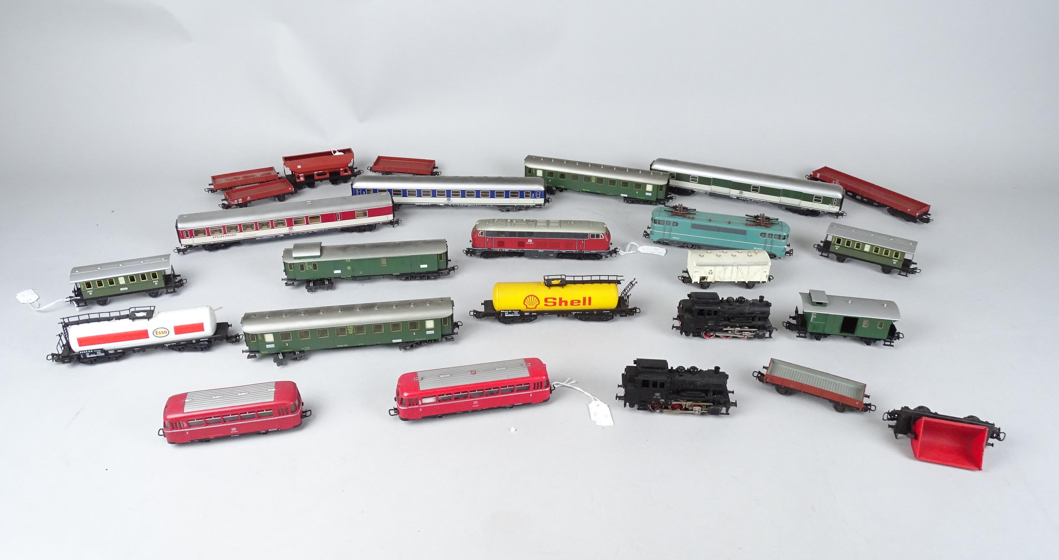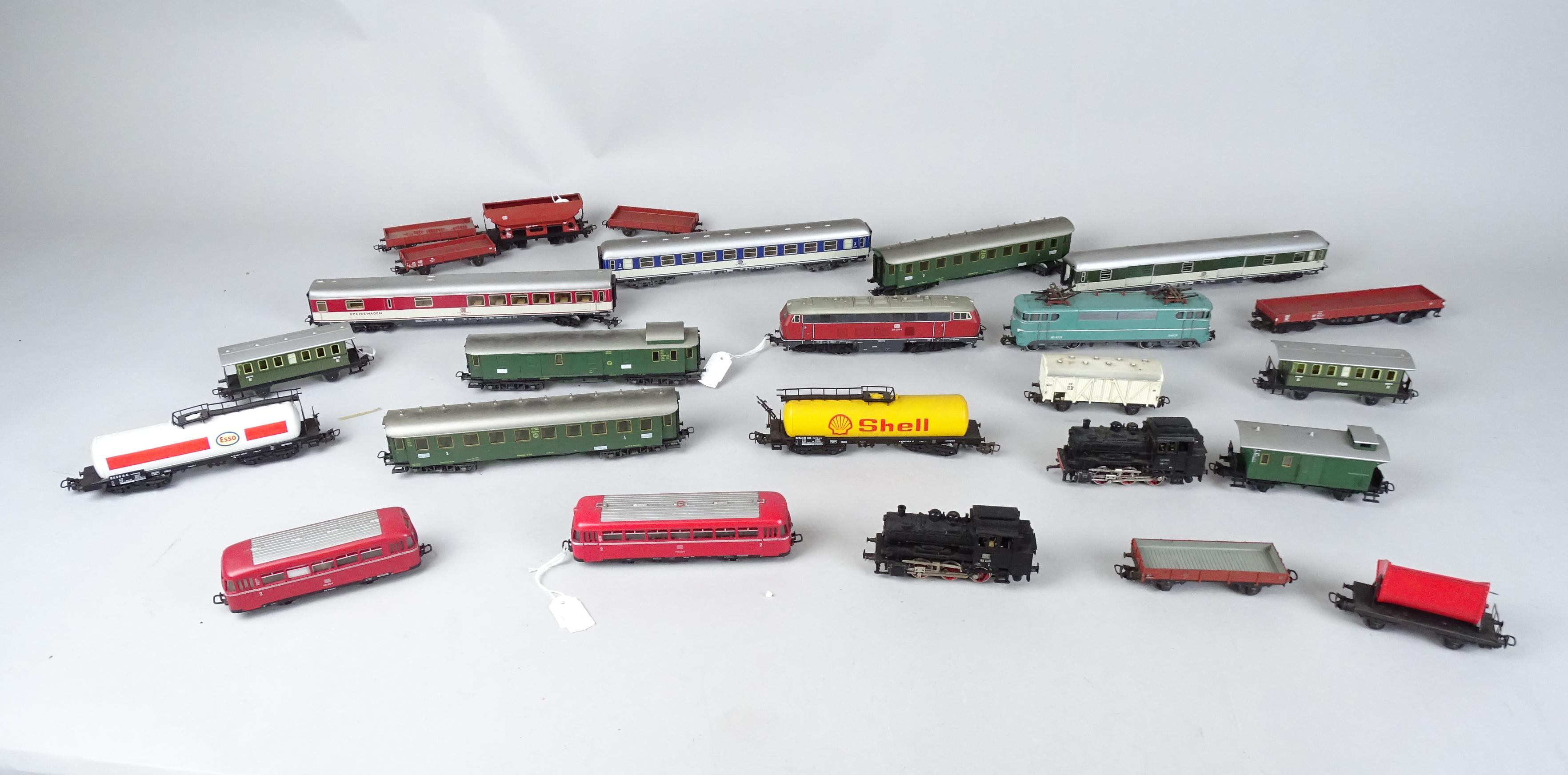 Jouet: Trains H0 MARKLIN (traces d'usages)): locomotive diesel Trans Europ Express + 6 locomotives + 19 wagons + transfos + rails + aiguillages + divers