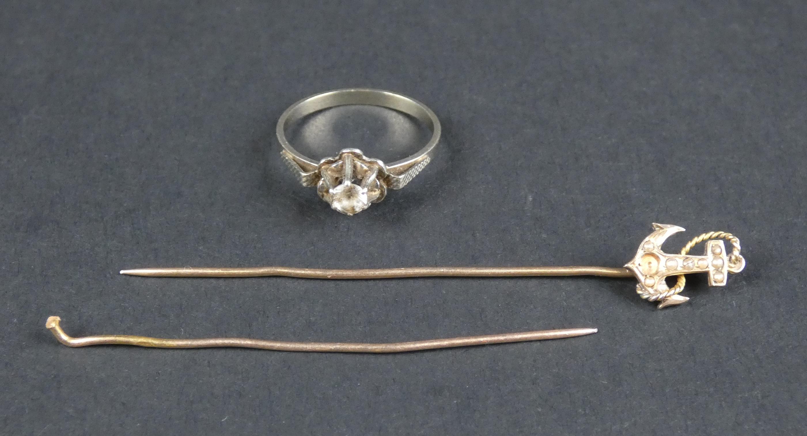 Bijou: Epingle de cravate -ancre- sertie de petites perles (1mq), bague sertie d'un strass et pic d'épingle de cravate (acc) le tout en or 18K P: 4,9g