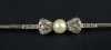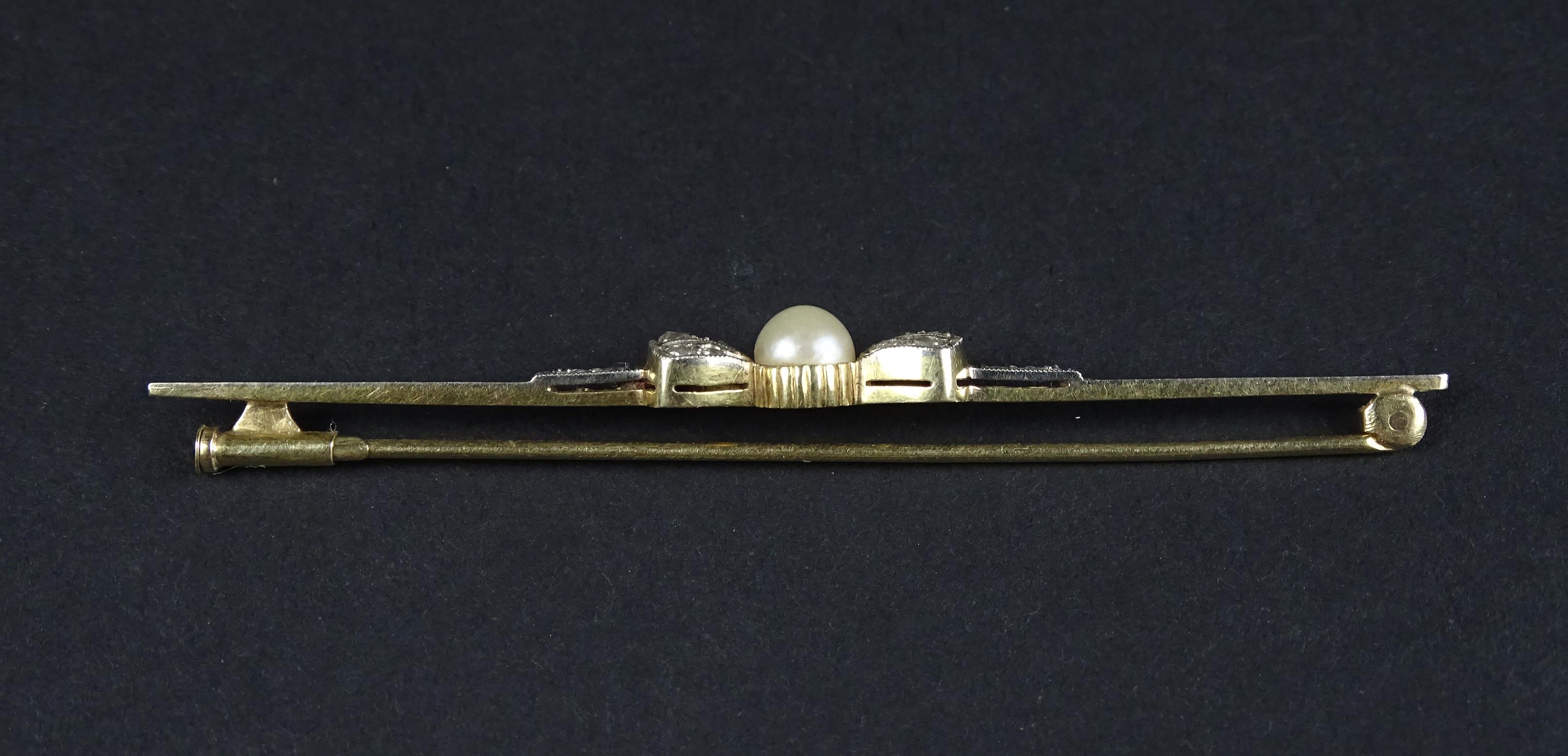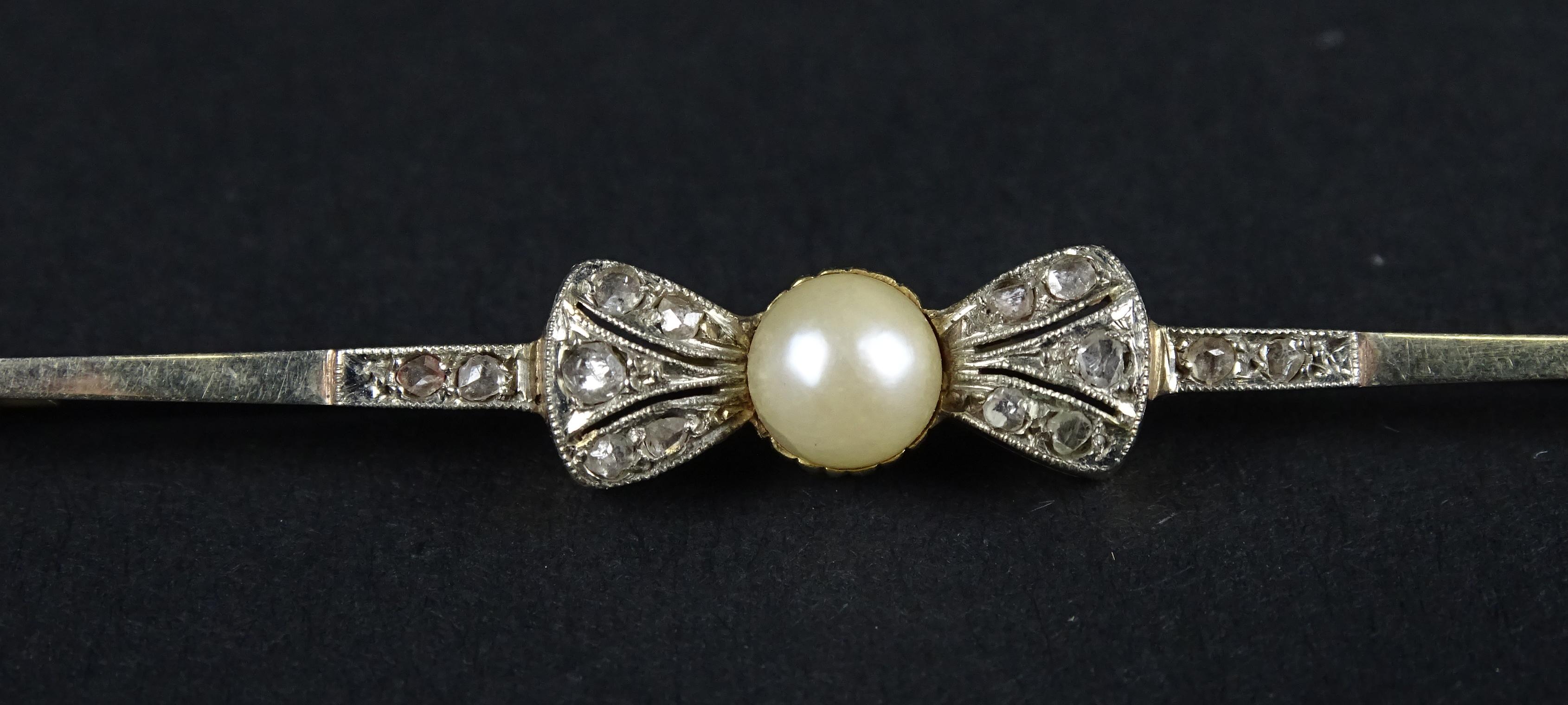 Bijou: Broche barrette -Noeud- en or jaune 18K sertie d'éclats de diamants et d'une perle de culture P: 4,6g L: 7,5cm