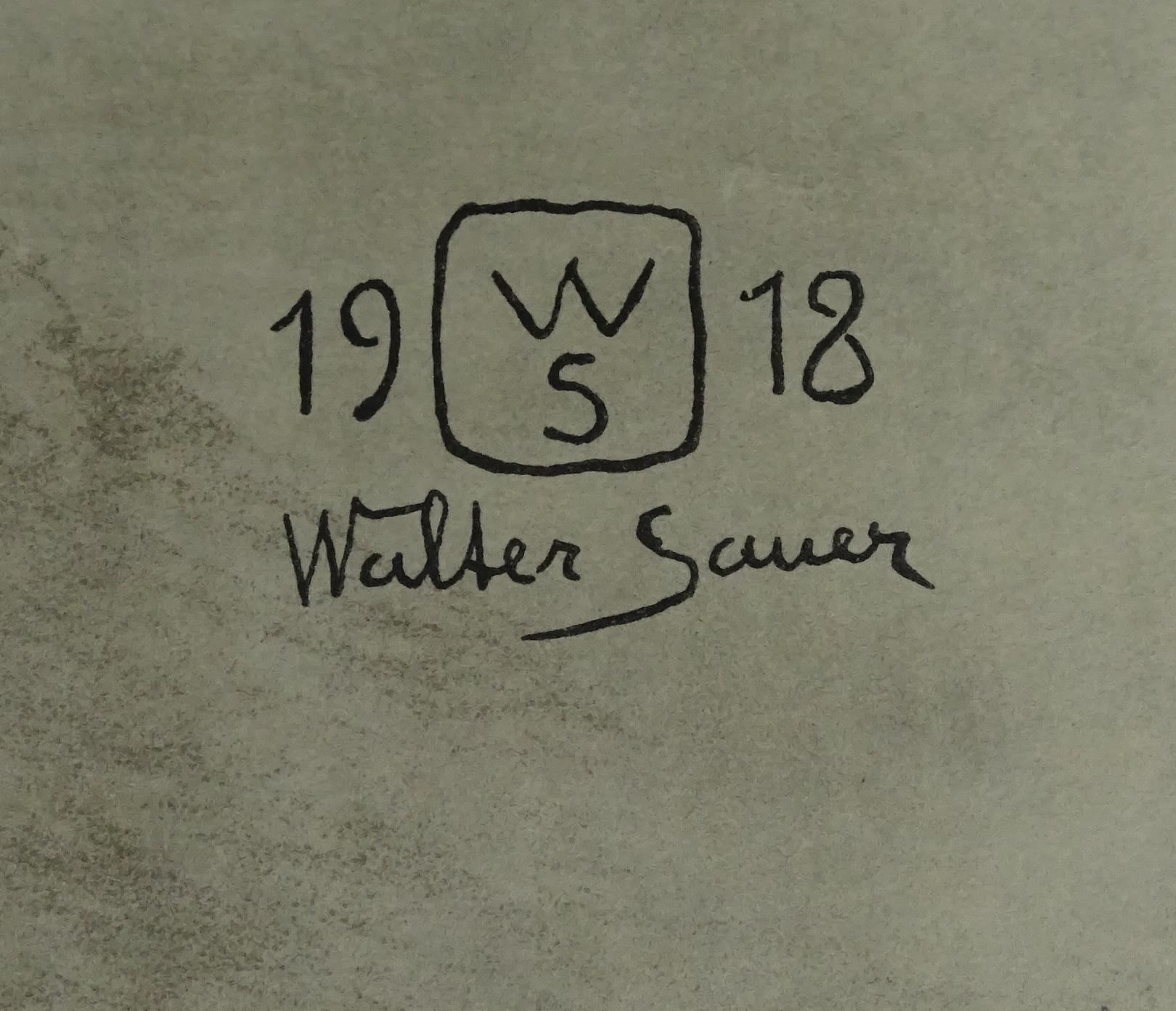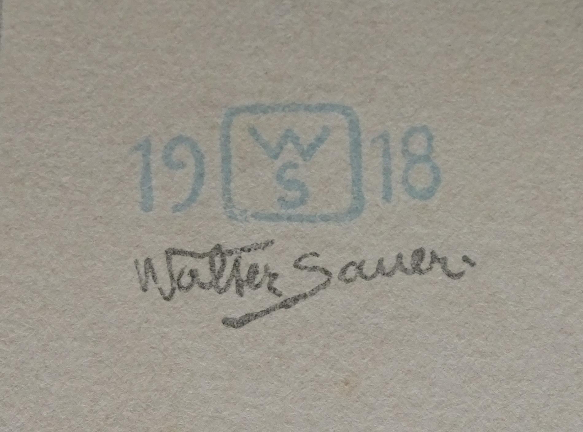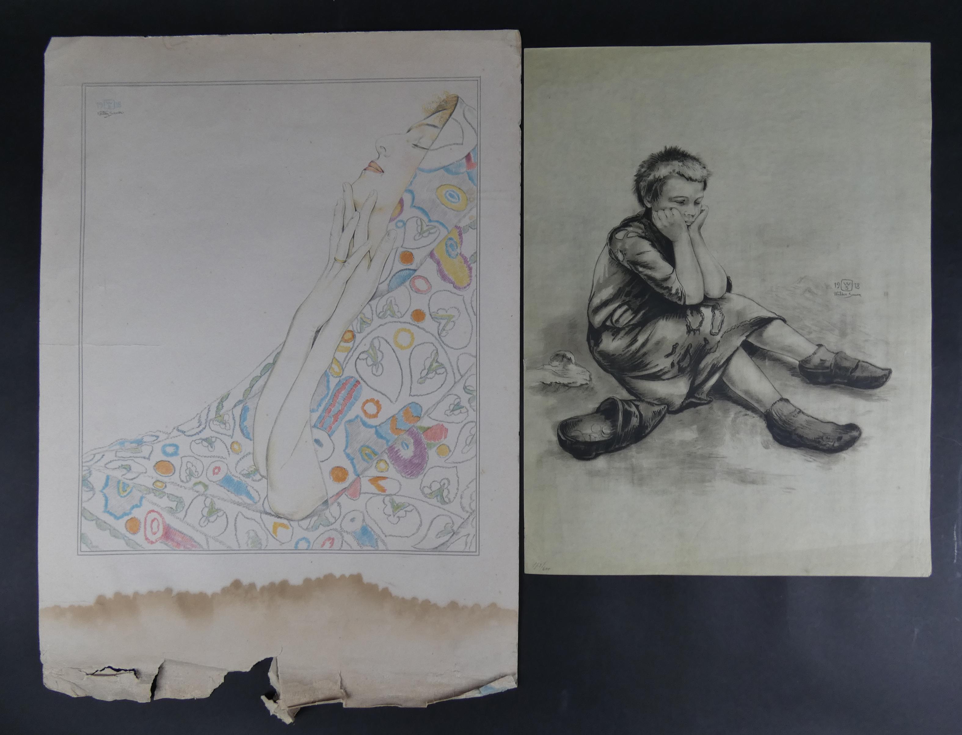 Estampe: Lithographie (2) (dont 1 couleur, pt taches, pliure) -Jeune femme- -mendiante- daté 1918 signé *SAUER W.* (Walter) (1889, 1927) 50x42 38x38cm ss cadre