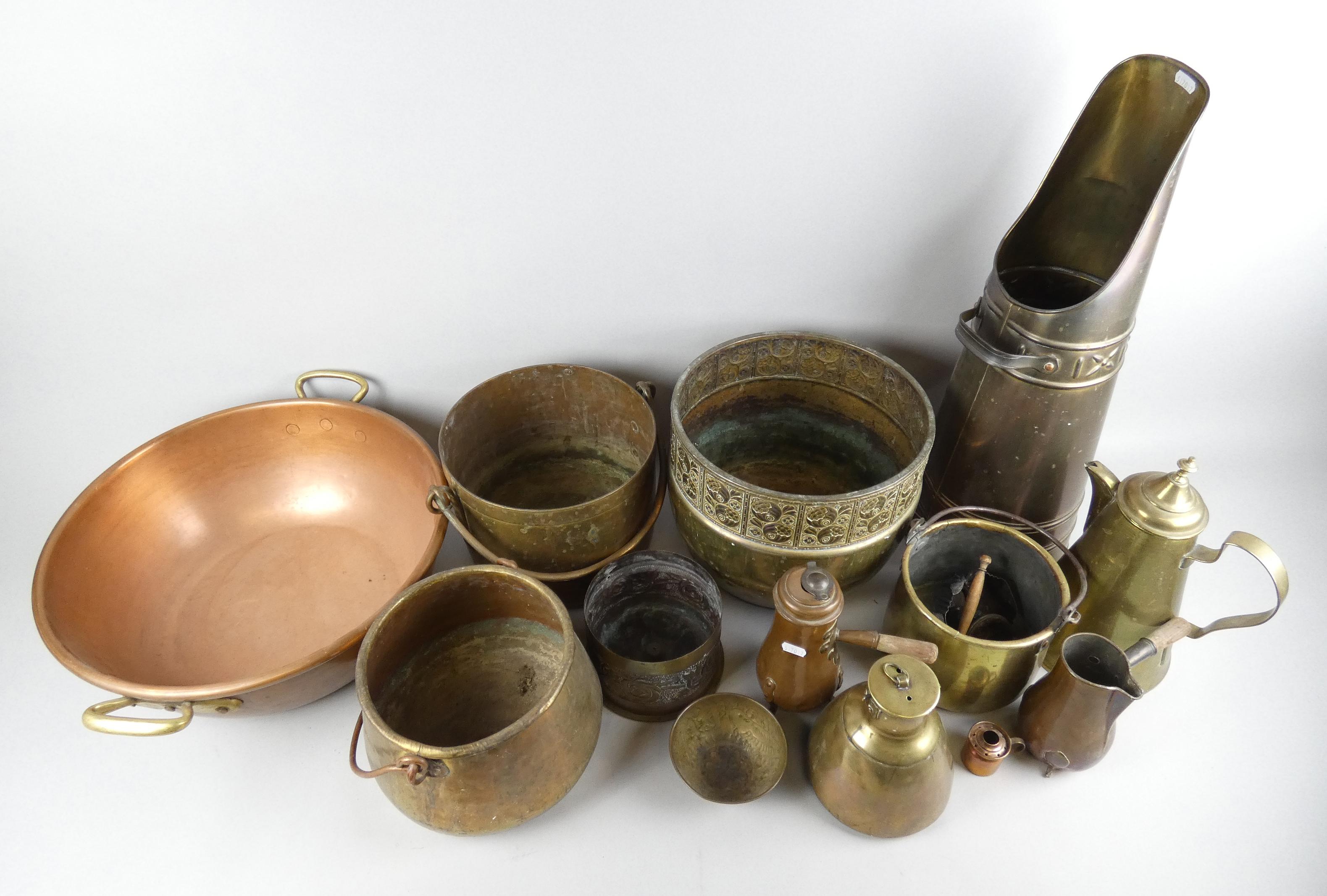Objet: Divers en cuivre dont: chocolatière 18eS, cafetière liégeoise fin 18e-début 19eS, marmite à confiture ronde.(env10pcs)