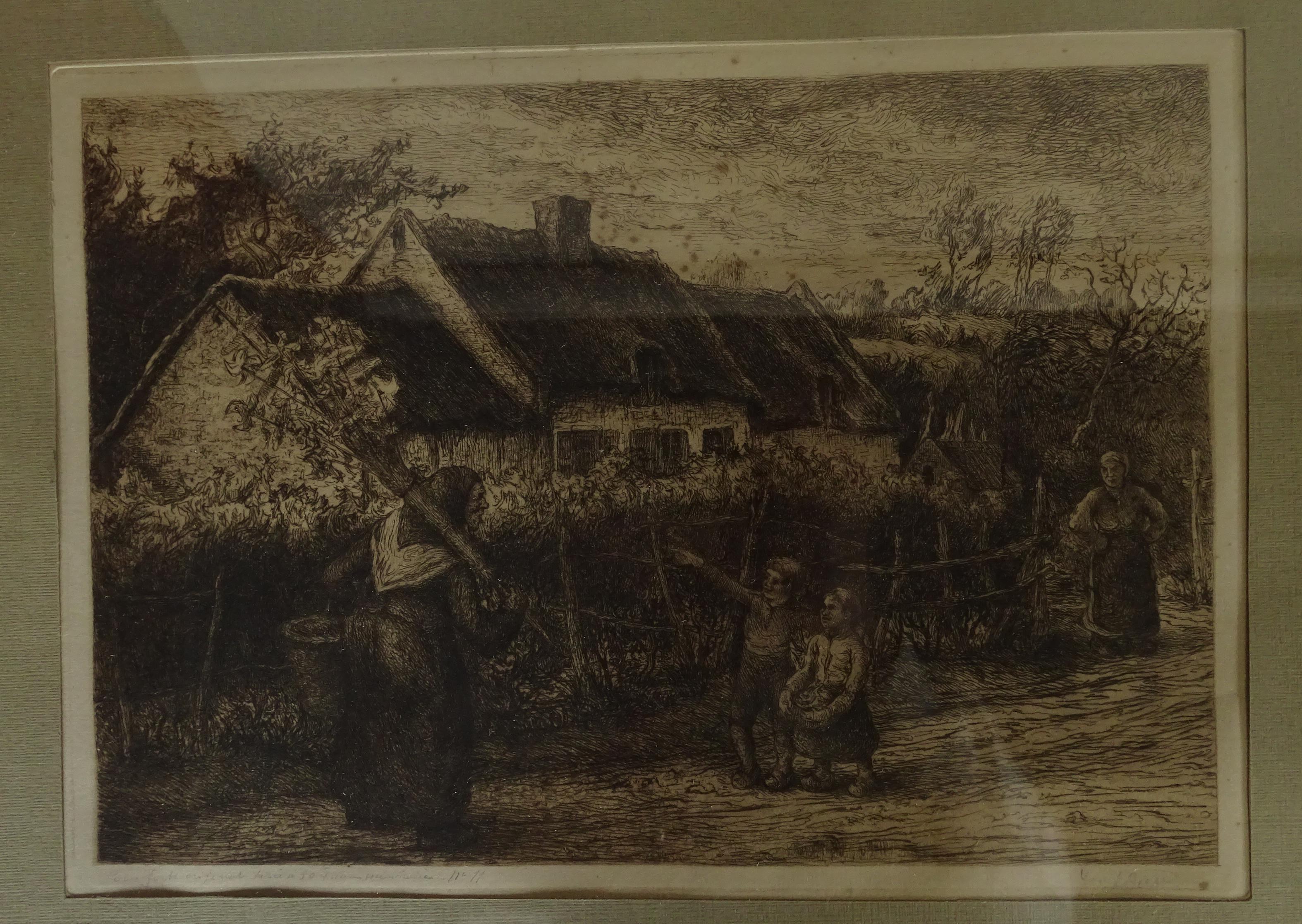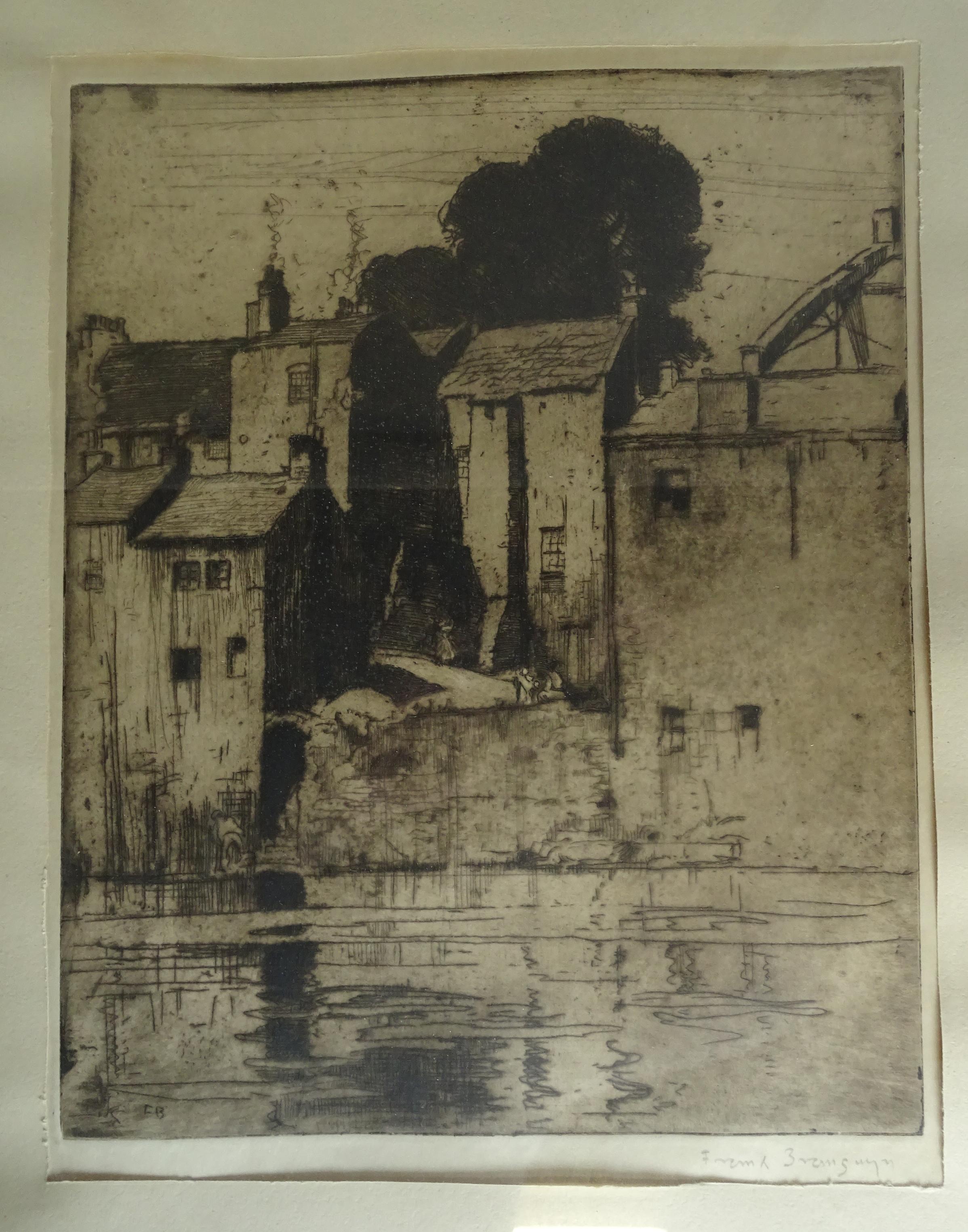 Estampe: 6 gravures dont 5 contresignées: DE LAUNAU N. OSPSOMER I. DEVOS L. BRANGWYN F. DIEU V. cadre sous verre (acc)