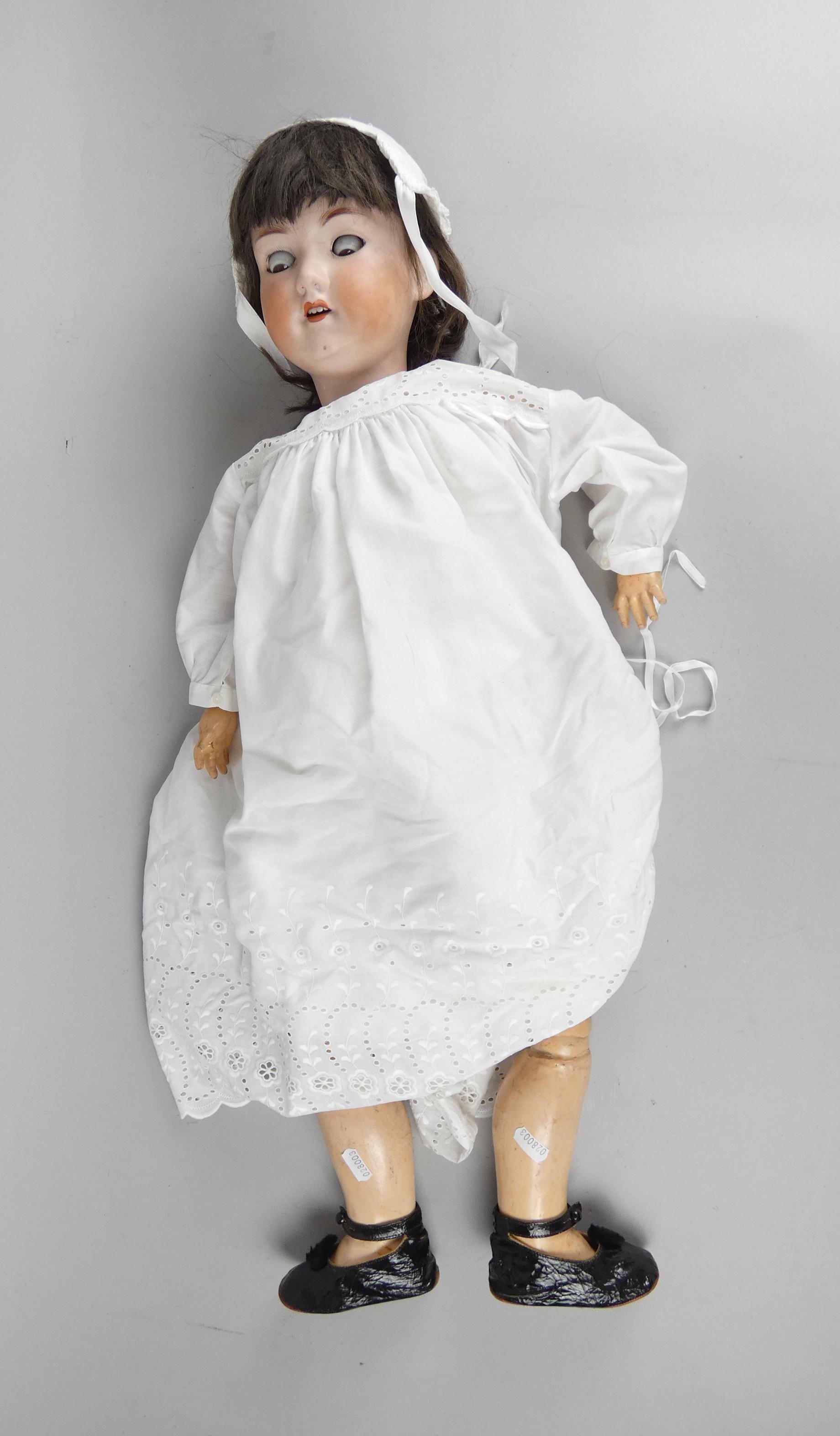 Poupée: Armand Marseille (usures), tête porcelaine moule 390 yeux dormeurs, bouche ouverte avec dents, corps articulé H:75cm