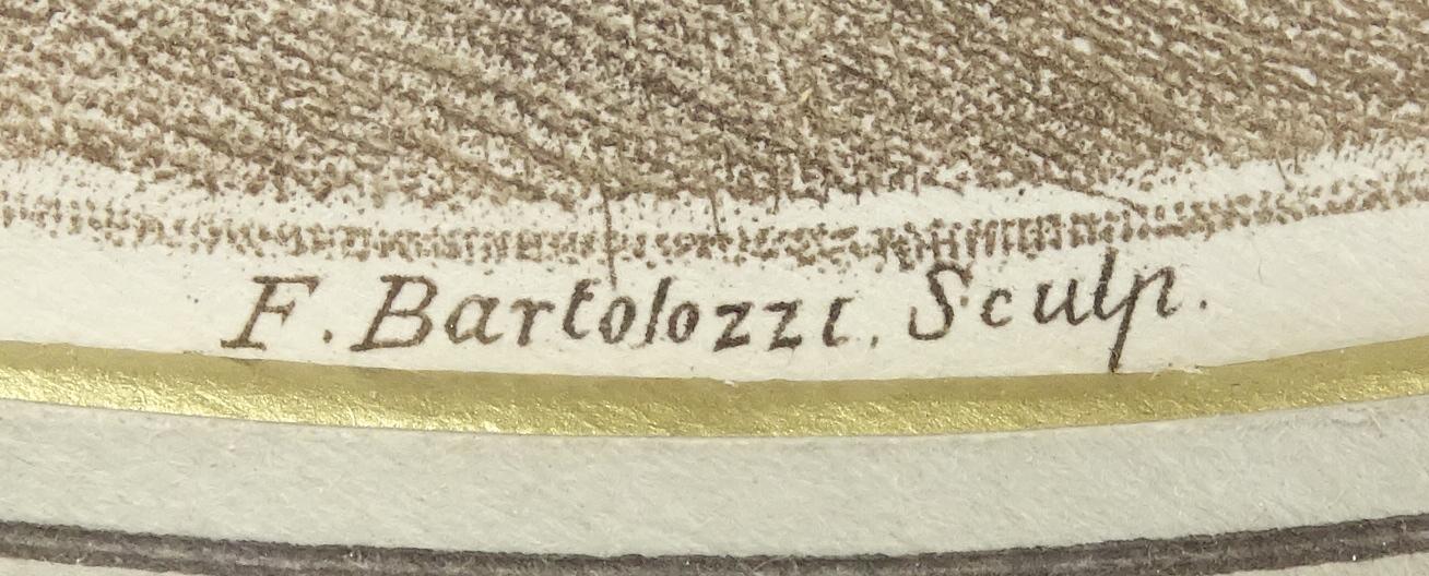 Estampe: Eau-forte polychrome -Dame au chien- *KAUFFMAN A.* (Angelica) (1741, 1807) sculpté par BARTOLOZZI Francesco (1728, 1815) 33x26cm cadre doré s-v