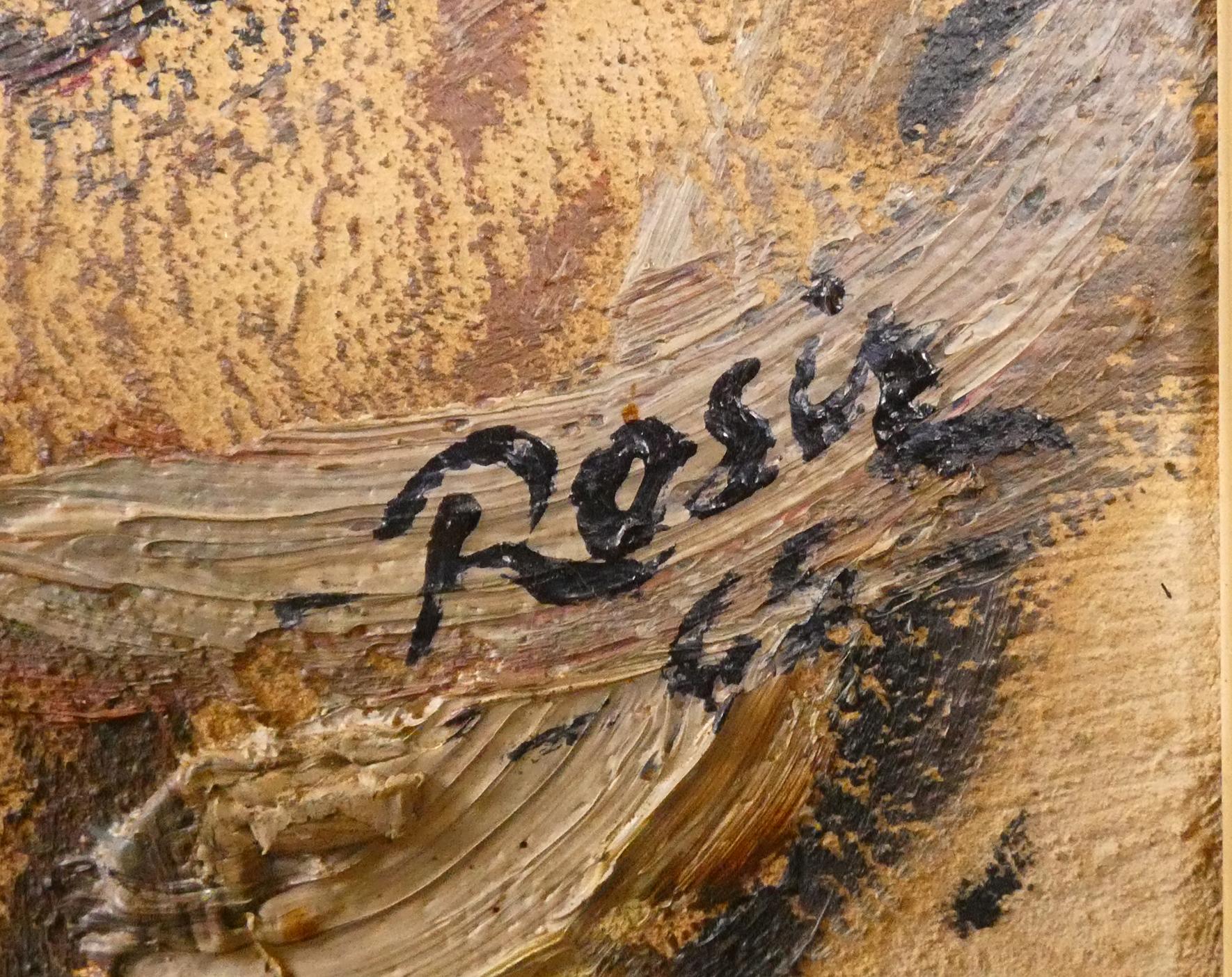 Tableau HST -Coq et poules- daté 45 signé ROSIR 64x64cm cadre patiné doré