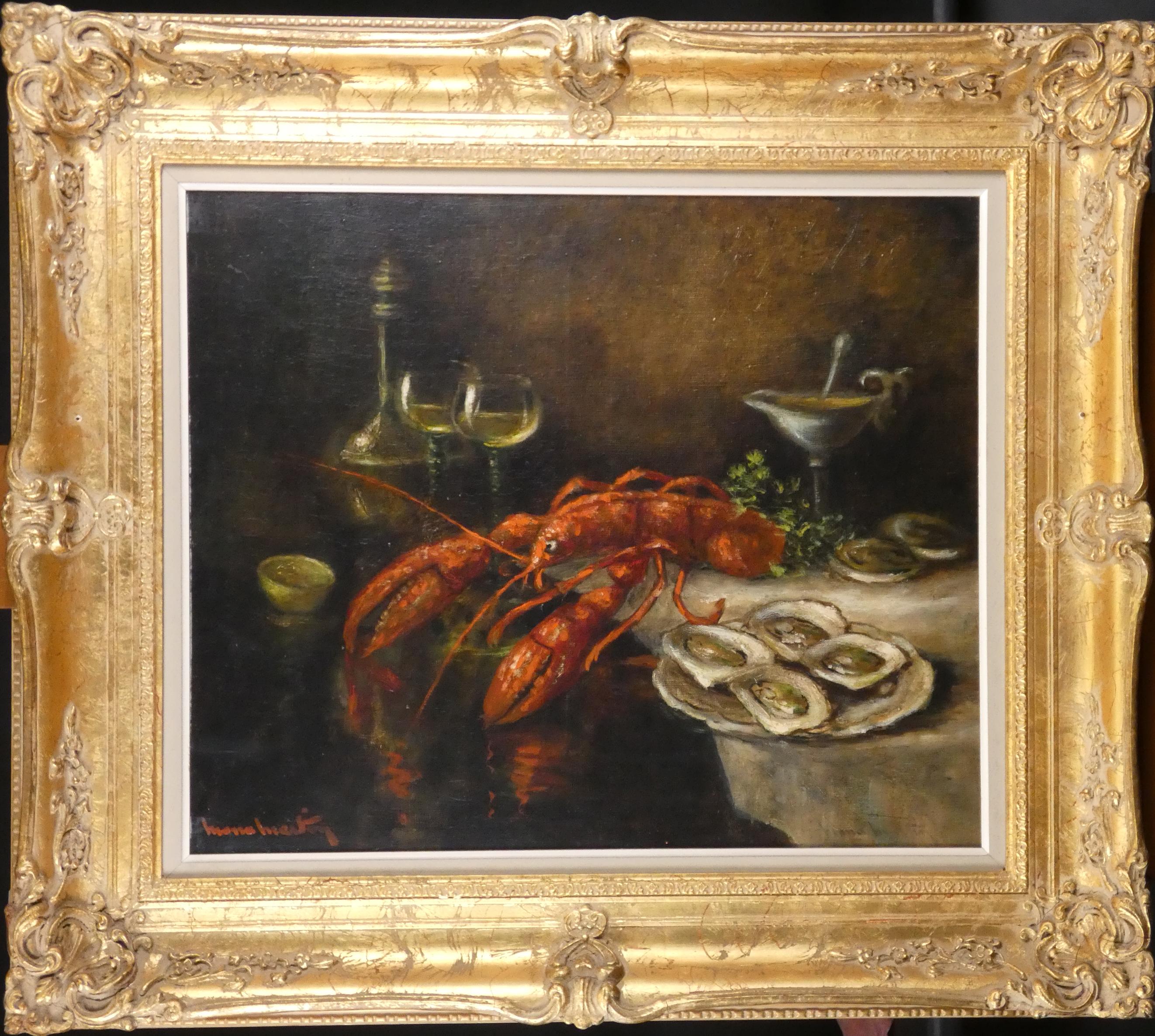 Tableau HST -Nature morte aux homard et aux huîtres- signé *MARTIN M.* (Mona) (20eS) 50x60cm cadre doré de style